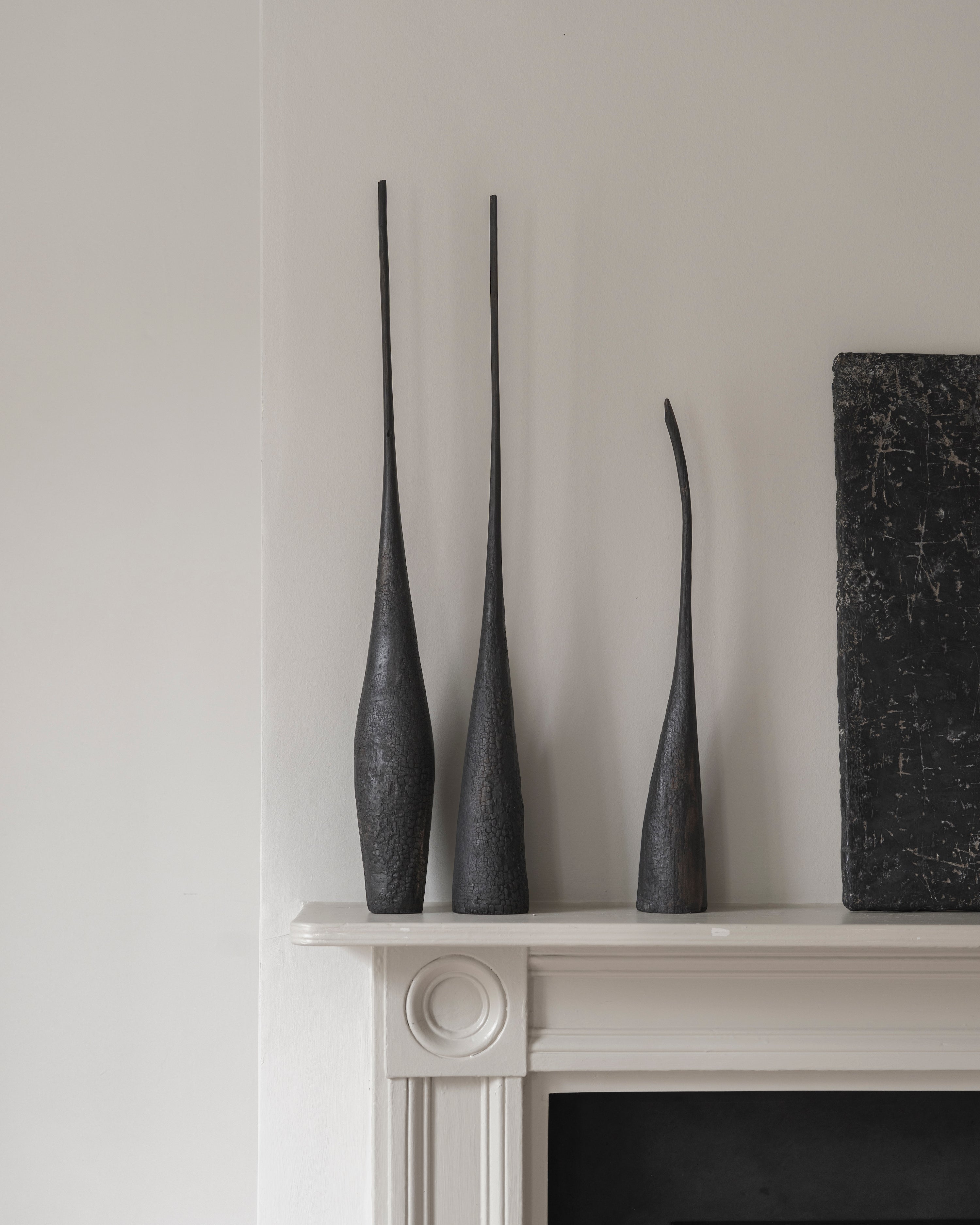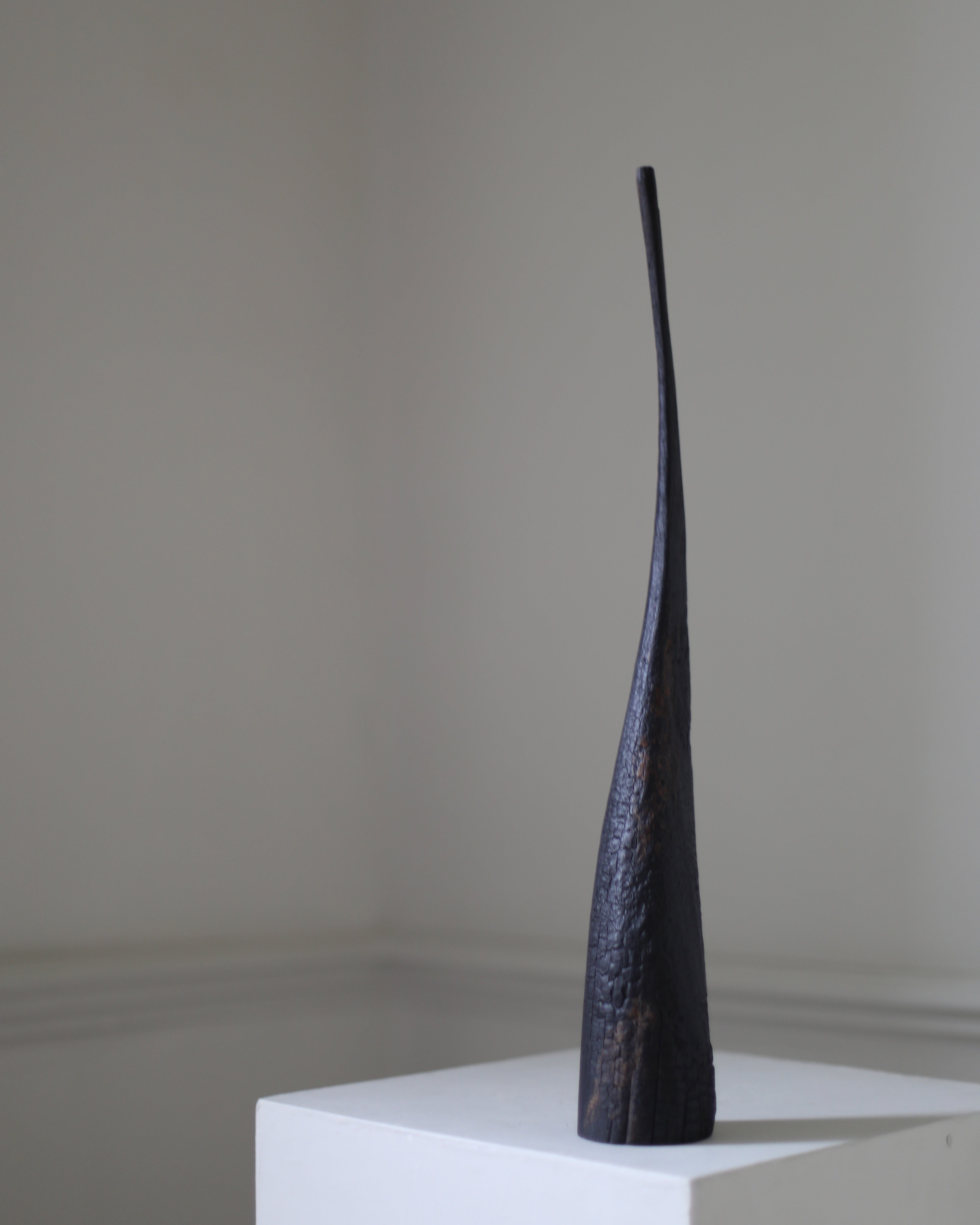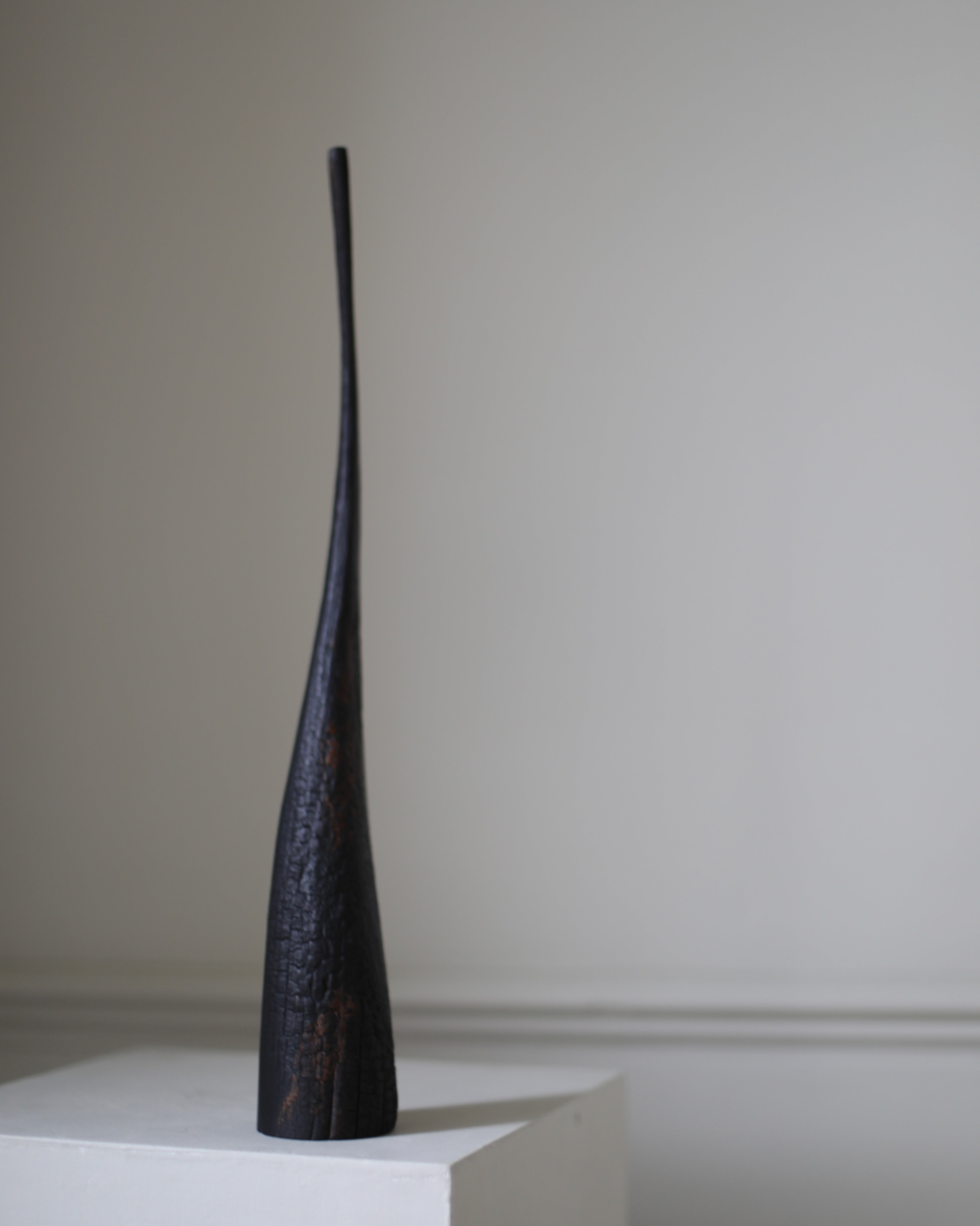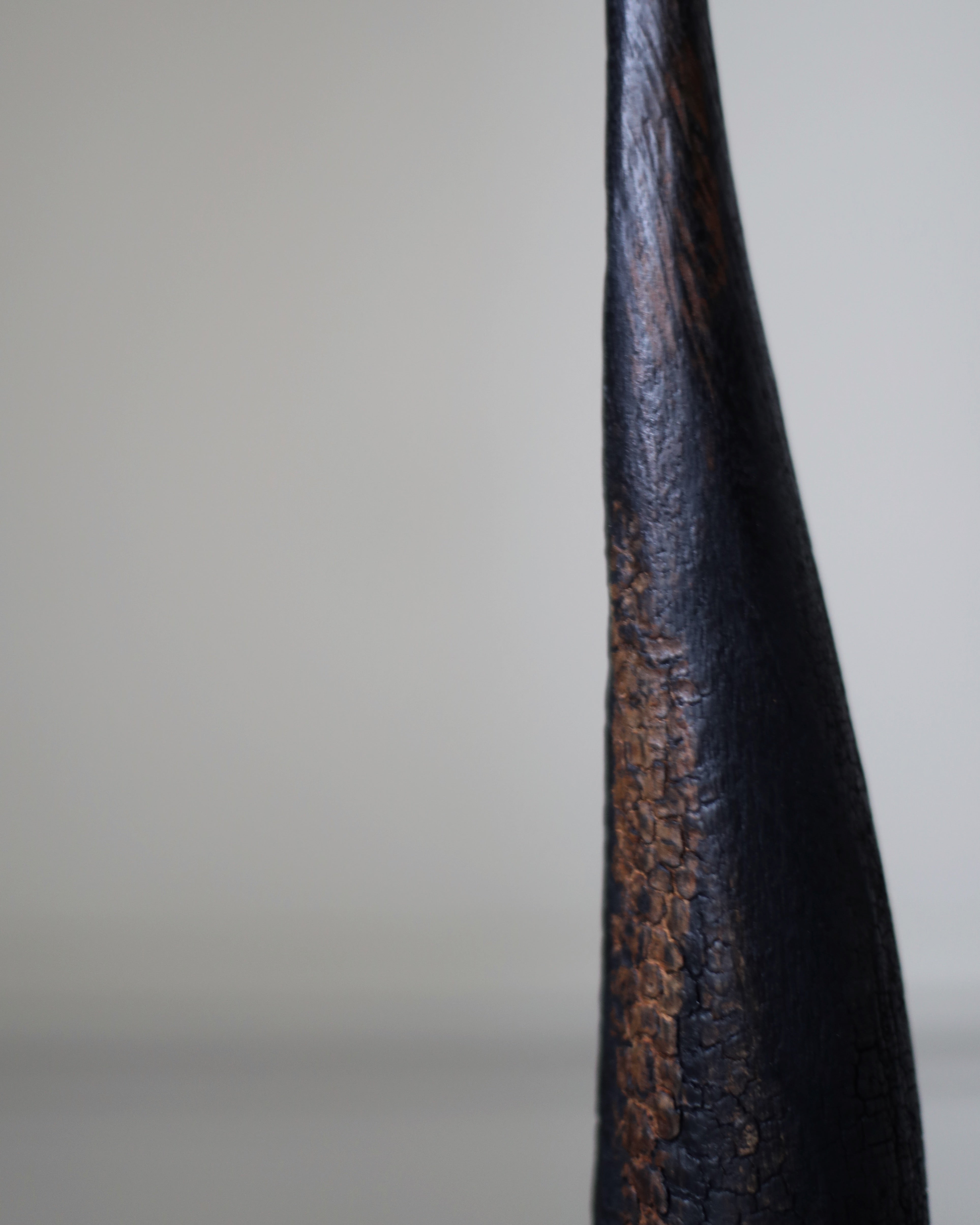 Concerned with portraying a sense of the sacred, this conical wooden sculpture features a rich, charred textured surface, red stains and a long neck gracefully stretching upwards evoking natural forms such as a sprouting plant. Titled “Muluvenice” from the Etruscan word meaning "(has been) dedicated to” this series draws inspiration from a distant, even ancient, past.
