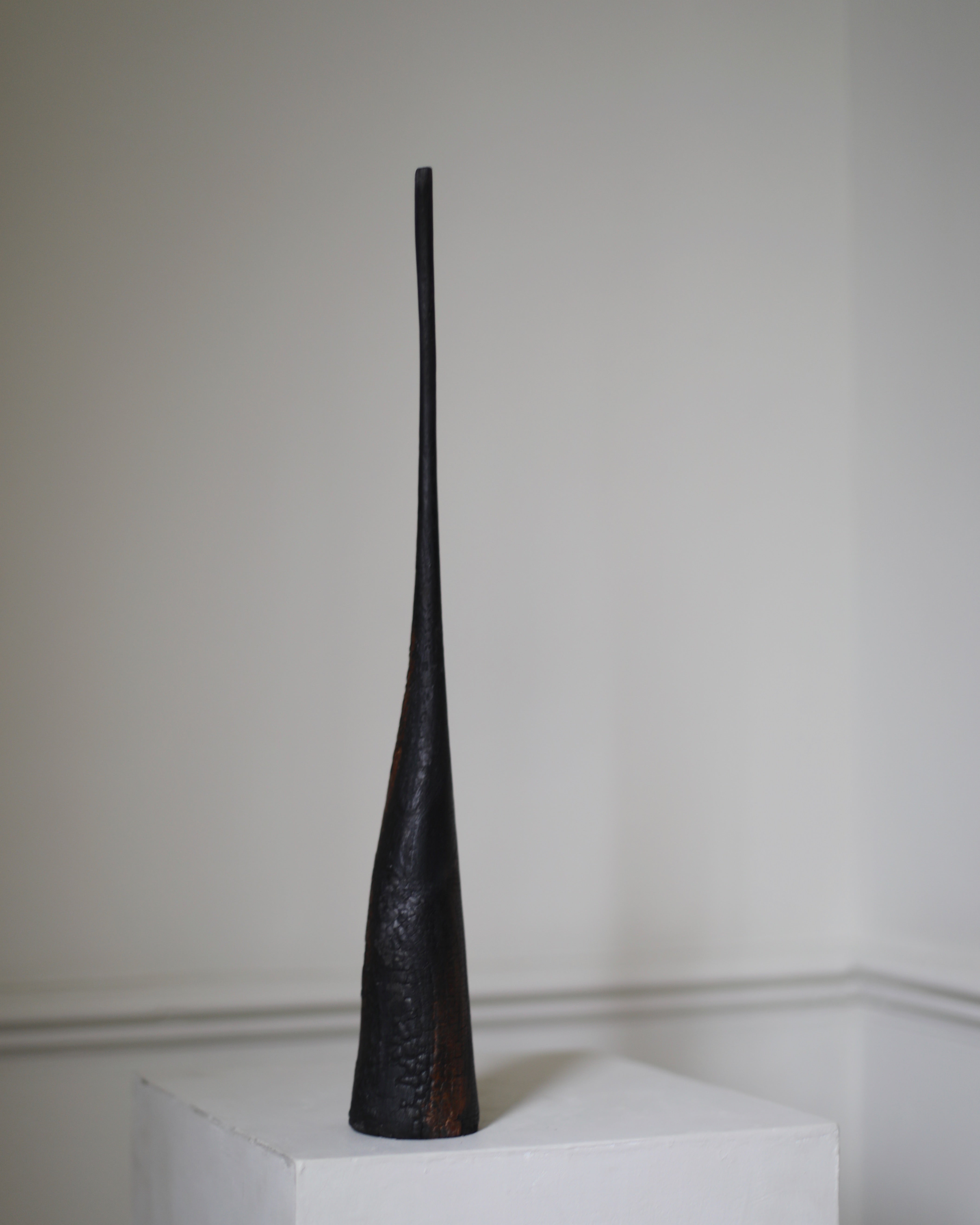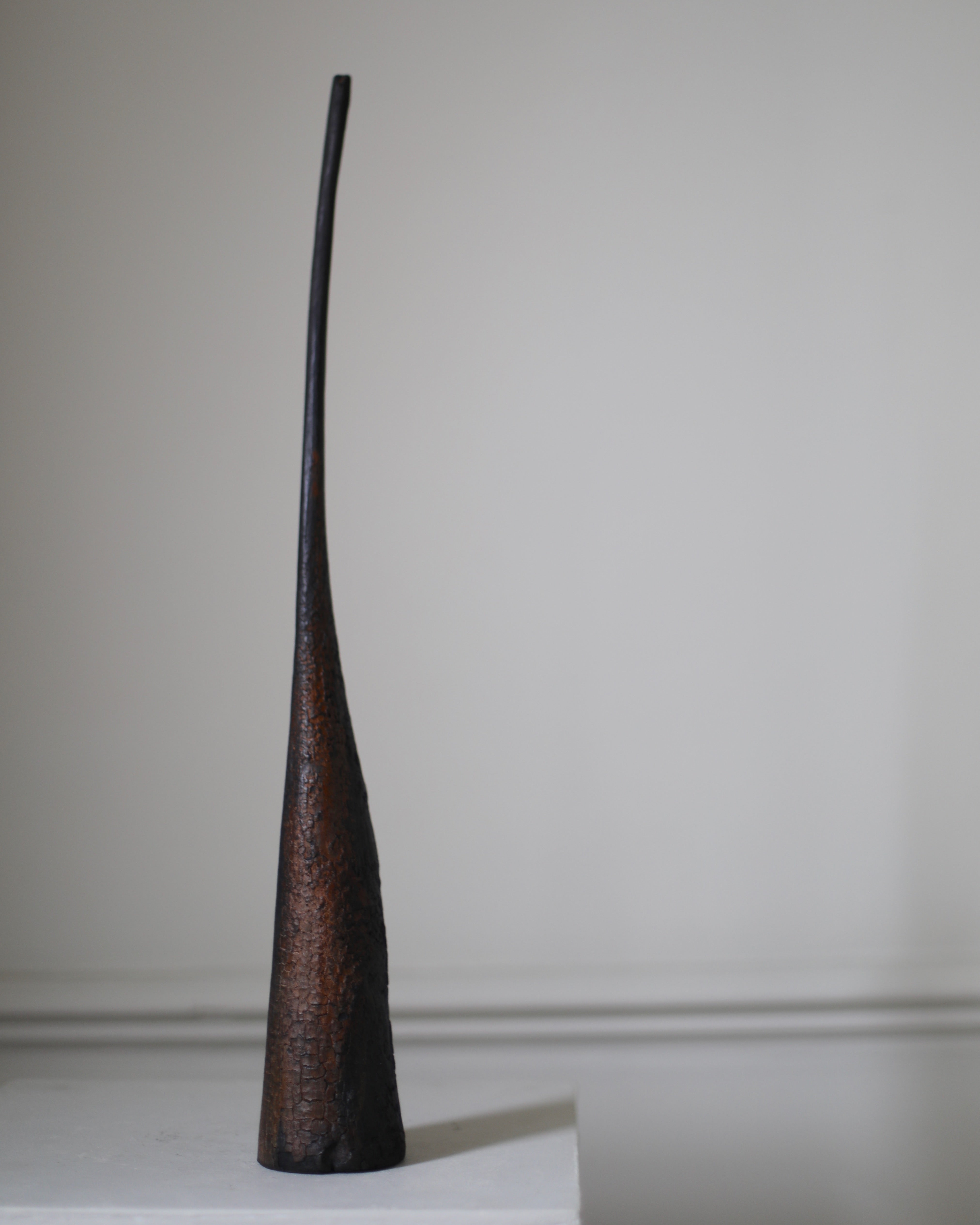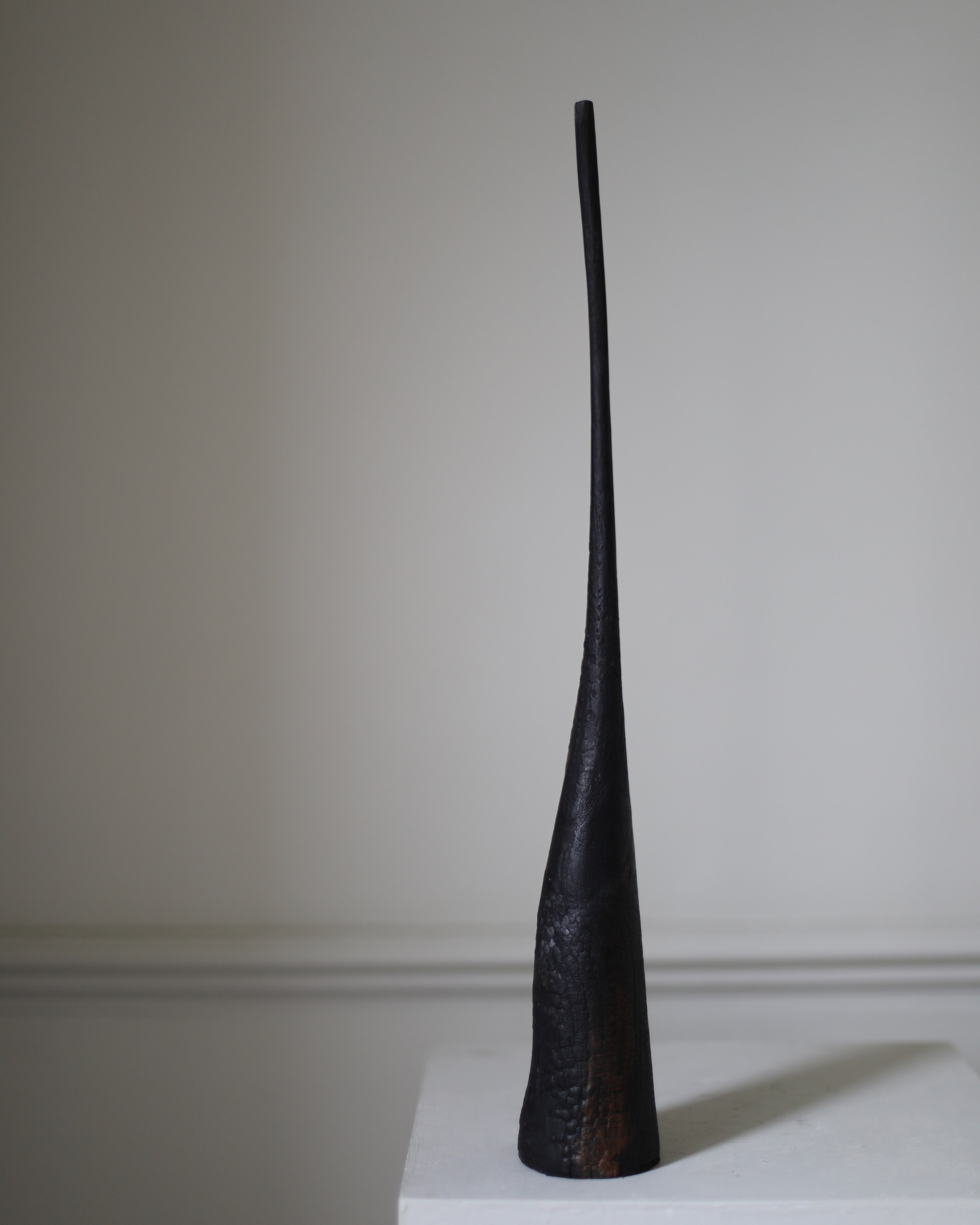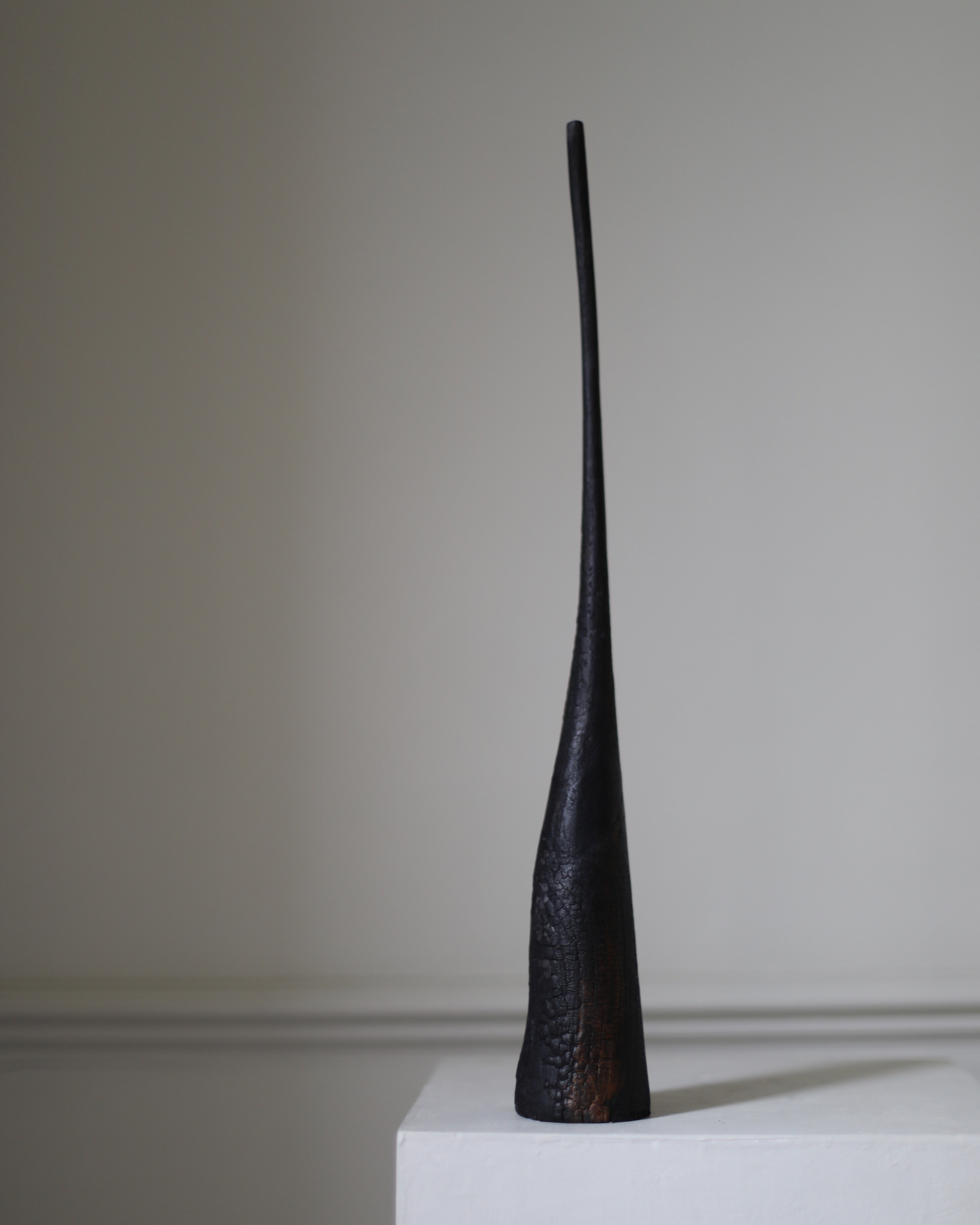 Concerned with portraying a sense of the sacred, this conical wooden sculpture features a rich, charred textured surface, red stains and a long neck gracefully stretching upwards evoking natural forms such as a sprouting plant. Titled “Muluvenice” from the Etruscan word meaning "(has been) dedicated to” this series draws inspiration from a distant, even ancient, past.