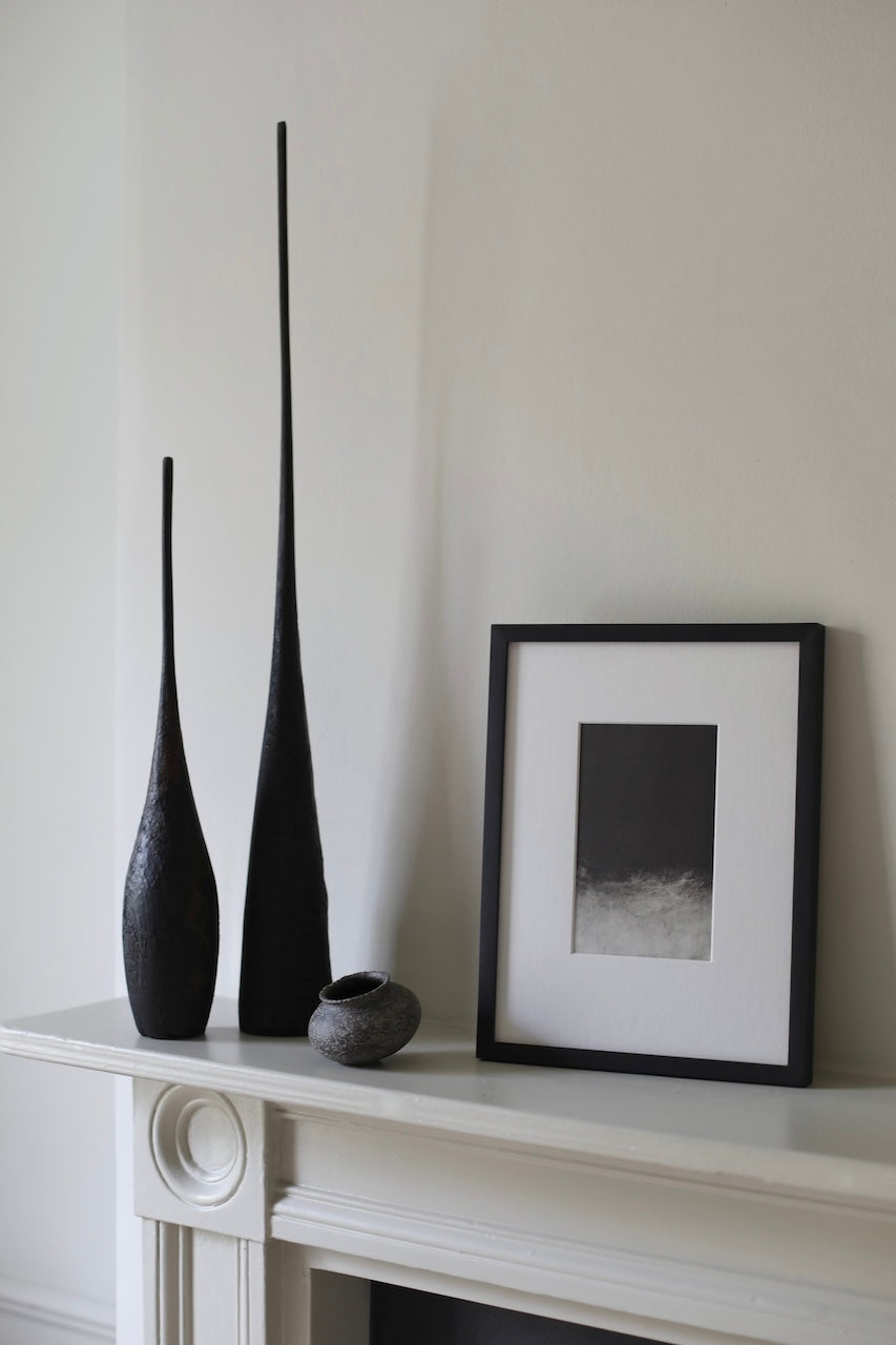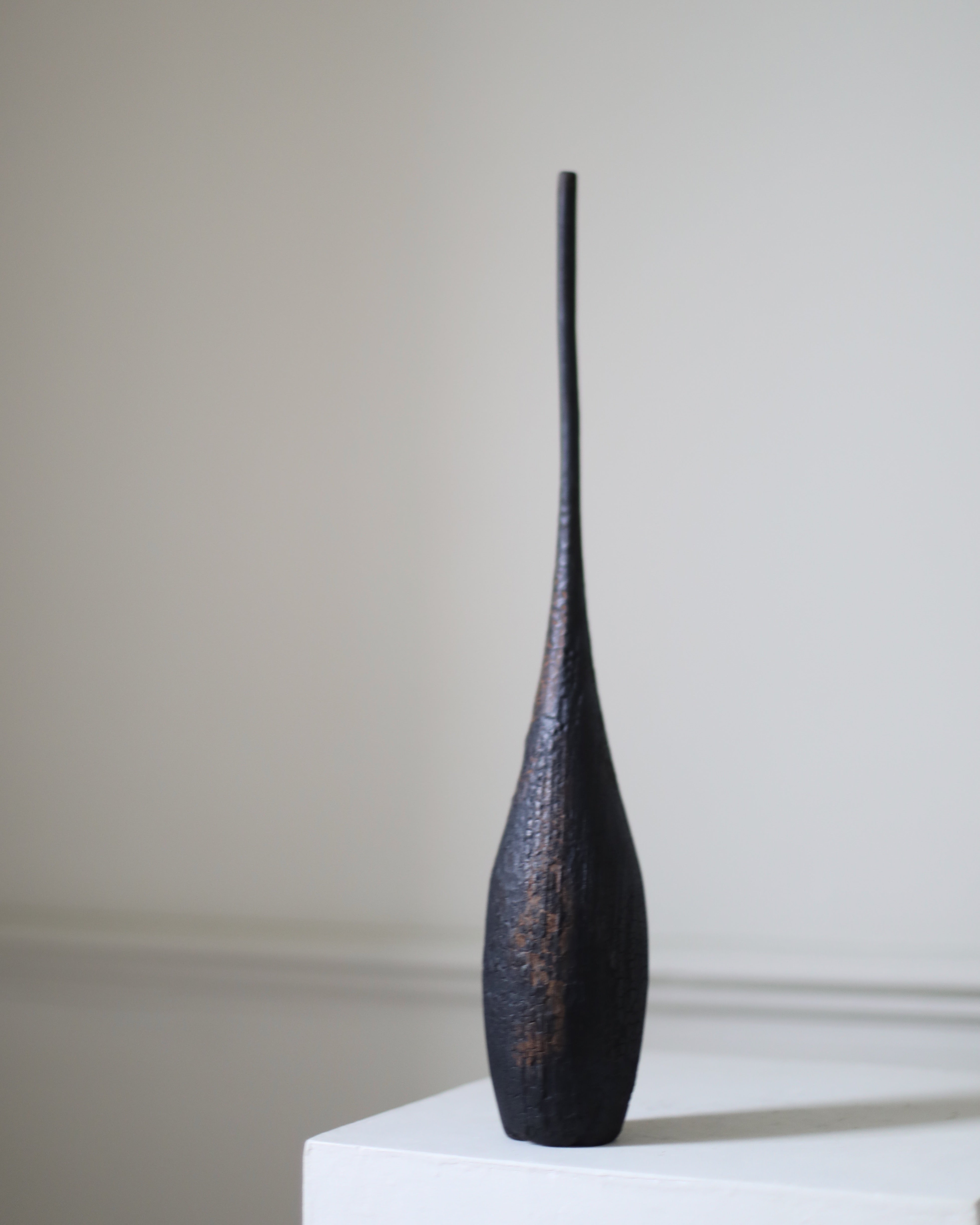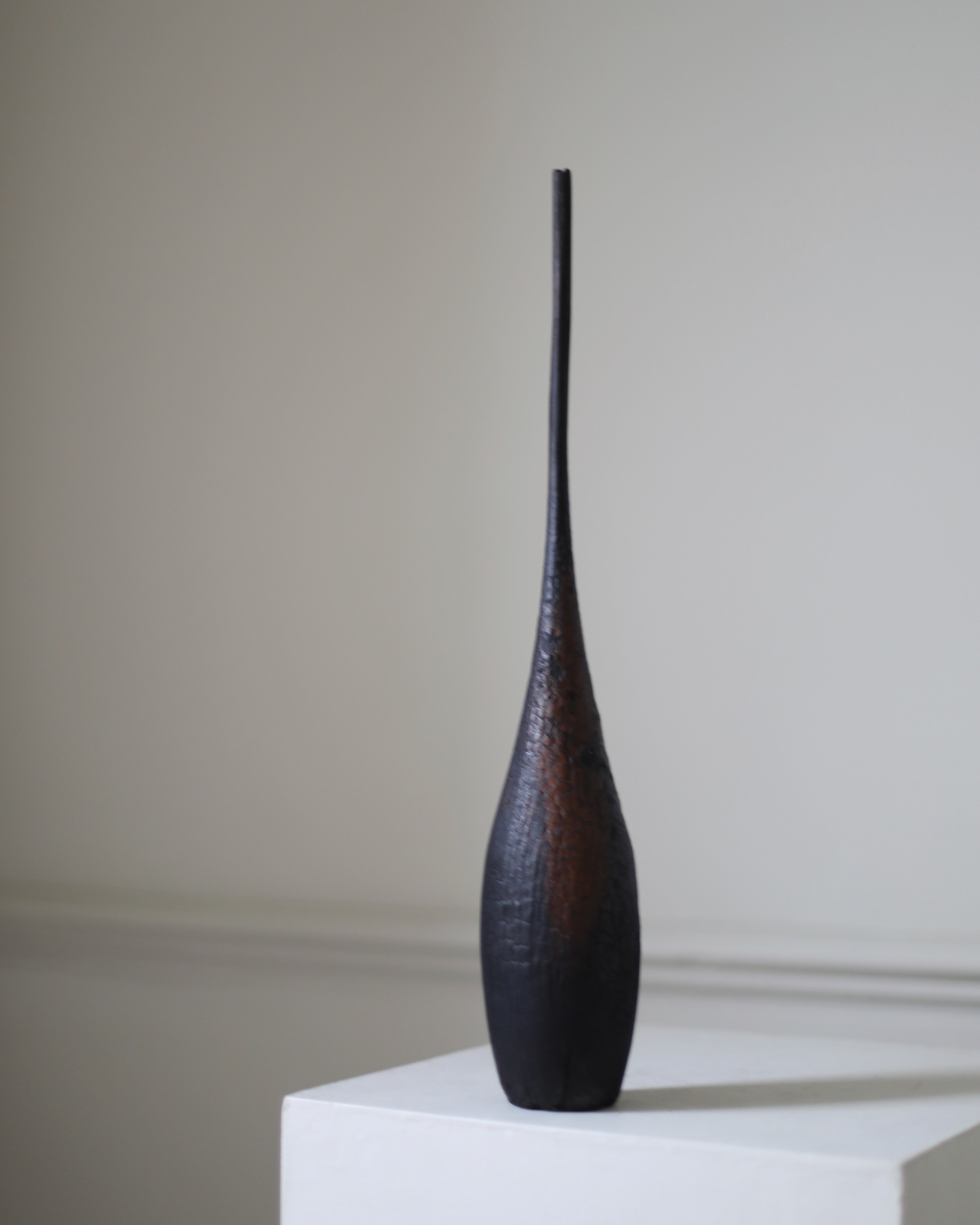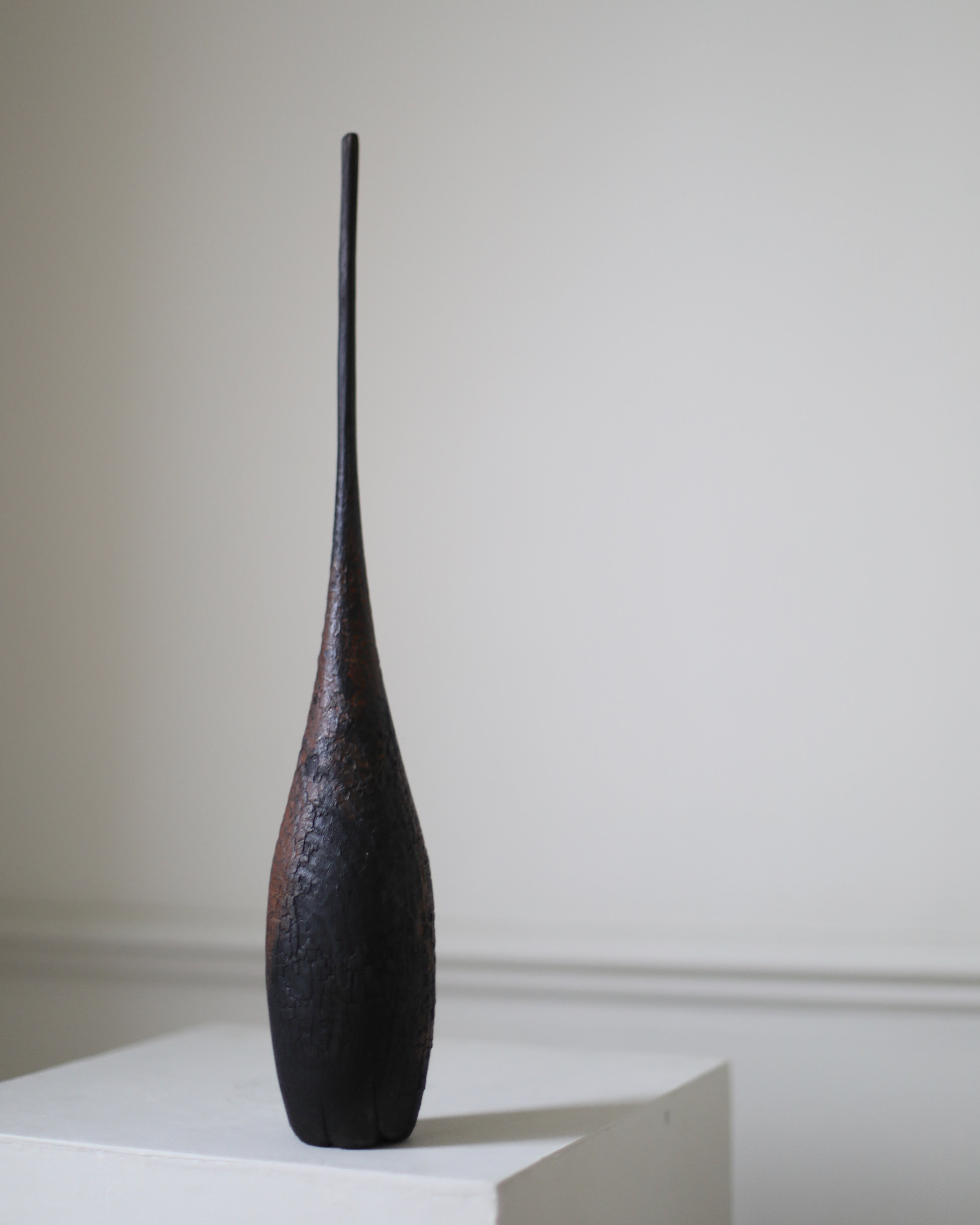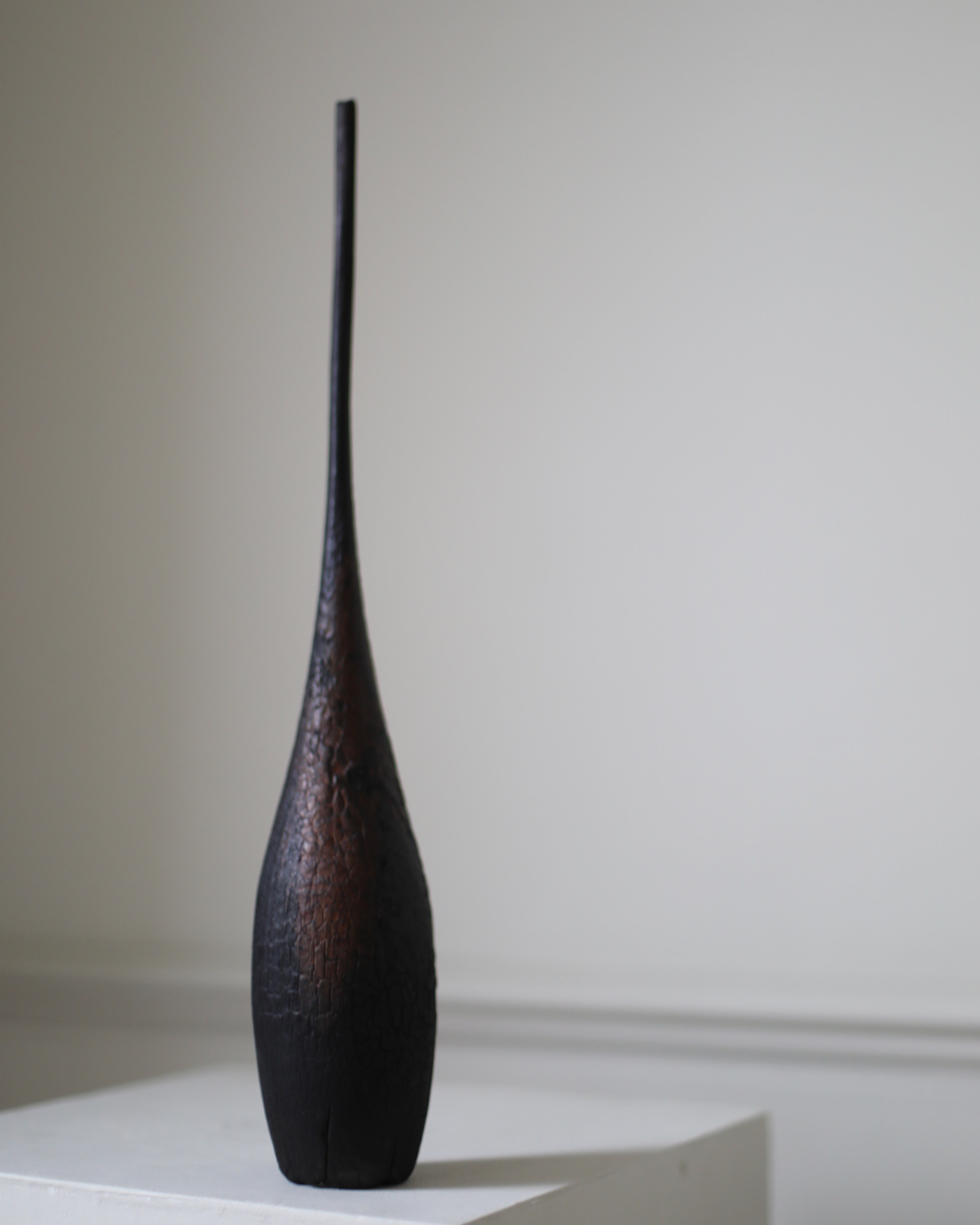 Concerned with portraying a sense of the sacred, this conical wooden sculpture features a rich, charred textured surface, red stains and a long neck gracefully stretching upwards evoking natural forms such as a sprouting plant. Titled “Muluvenice” from the Etruscan word meaning "(has been) dedicated to” this series draws inspiration from a distant, even ancient, past.