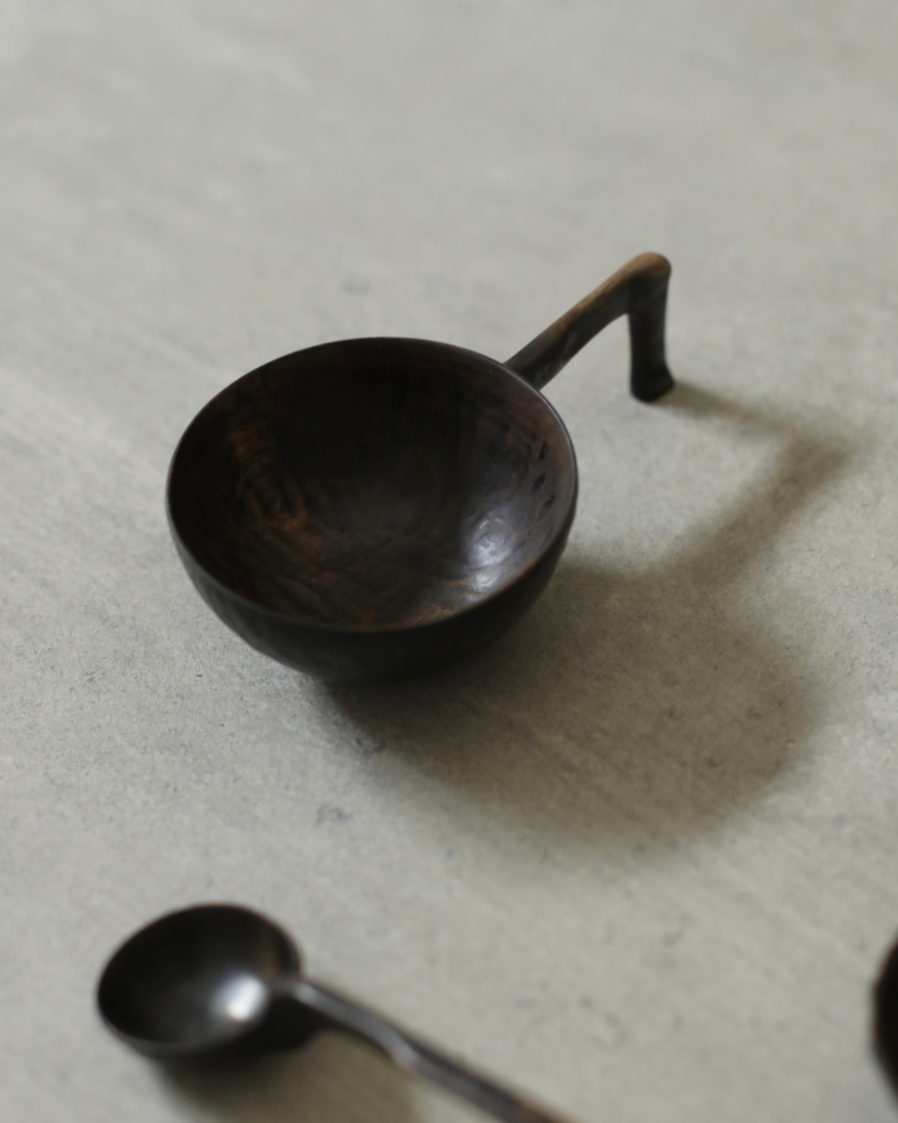 A striking sculptural spoon featuring a generously proportioned bowl and a slim handle that bends at a 45° angle, offering a refined and unexpected grip. The surface bears the subtle textures of hand-carved wood, revealing both the material’s natural character and the maker’s touch.