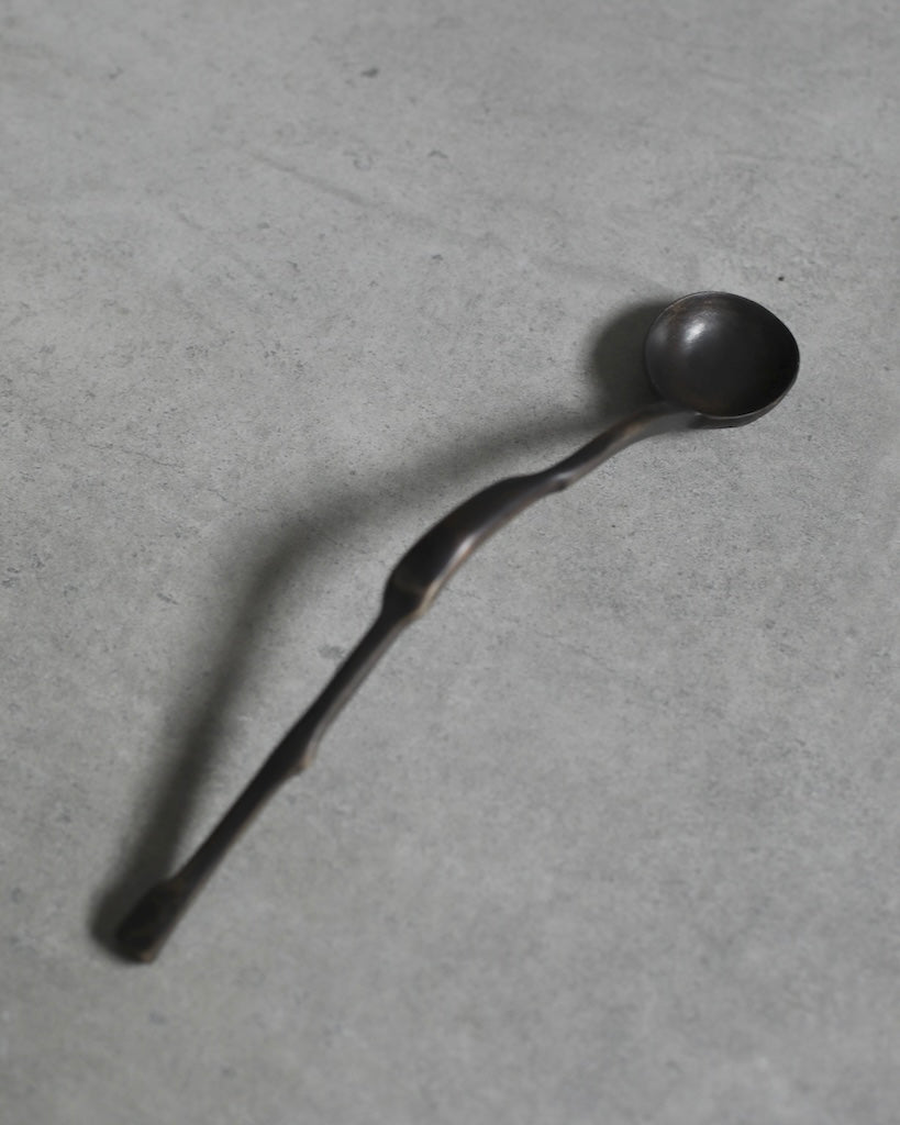 A beautifully refined sculptural spoon featuring a rounded bowl and a slender, organically contoured handle that honours the natural form of the wood. Impeccably handmade by Marie Eklund, using nothing but an axe and a knife to create different shapes. Eklund engages the elemental forces of fire, water, and earth to evoke subtle contrasts in tone, enhancing the wood’s natural depth and variation.