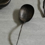 Sculptural spoon with a very slim handle and enlarged, shallow bowl. Impeccably handmade by Marie Eklund, using nothing but an axe and a knife to create different shapes. She uses the elements fire, water and earth to achieve contrasting tones, complimenting the natural characteristics of the wood.