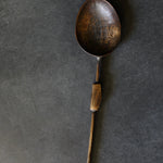 A beautifully refined sculptural spoon with slim handle and enlarged bowl with a lightly textured surface. Impeccably handmade by Marie Eklund, using nothing but an axe and a knife to create different shapes. She uses the elements fire, water and earth to achieve contrasting tones, complimenting the natural characteristics of the wood.