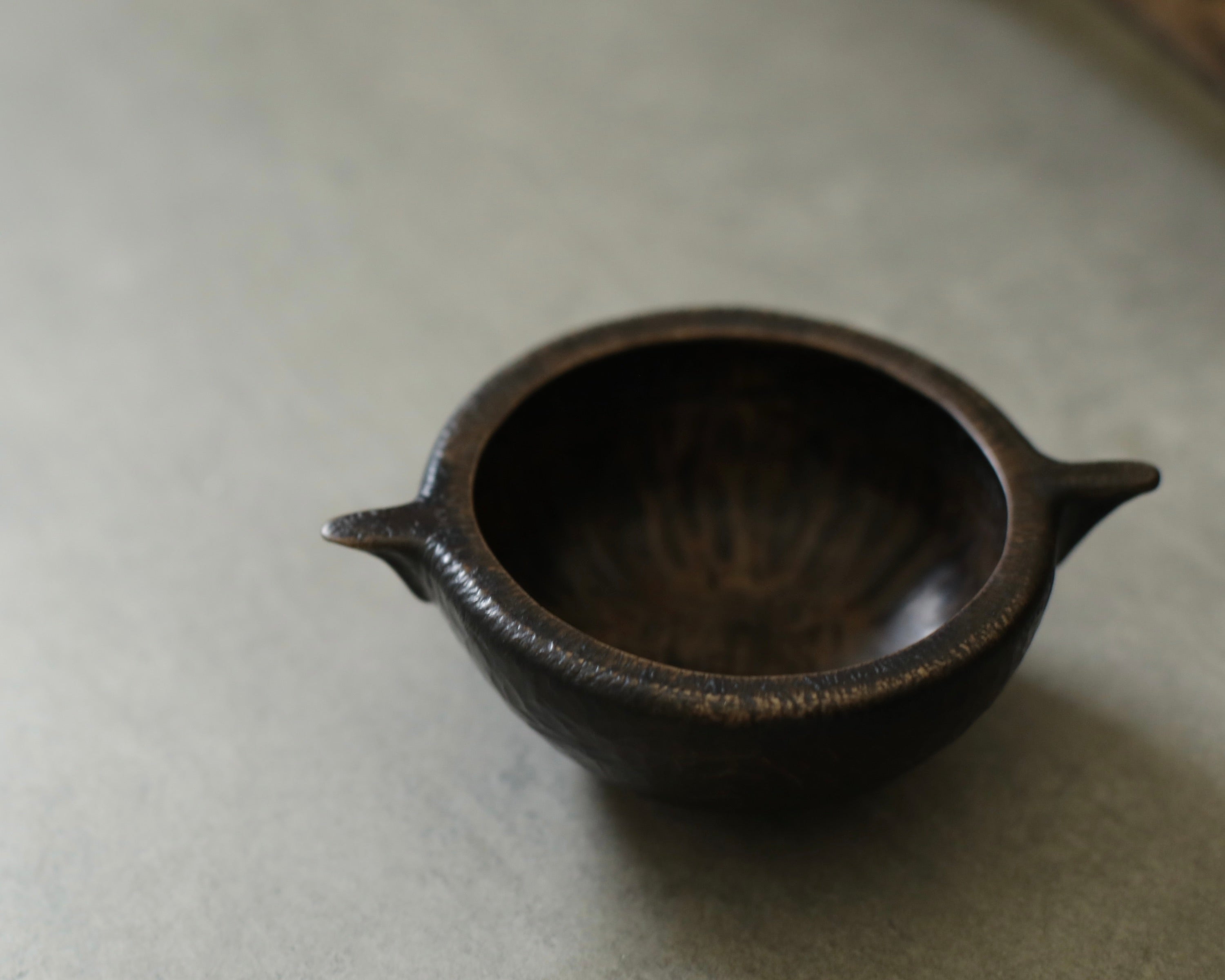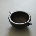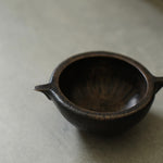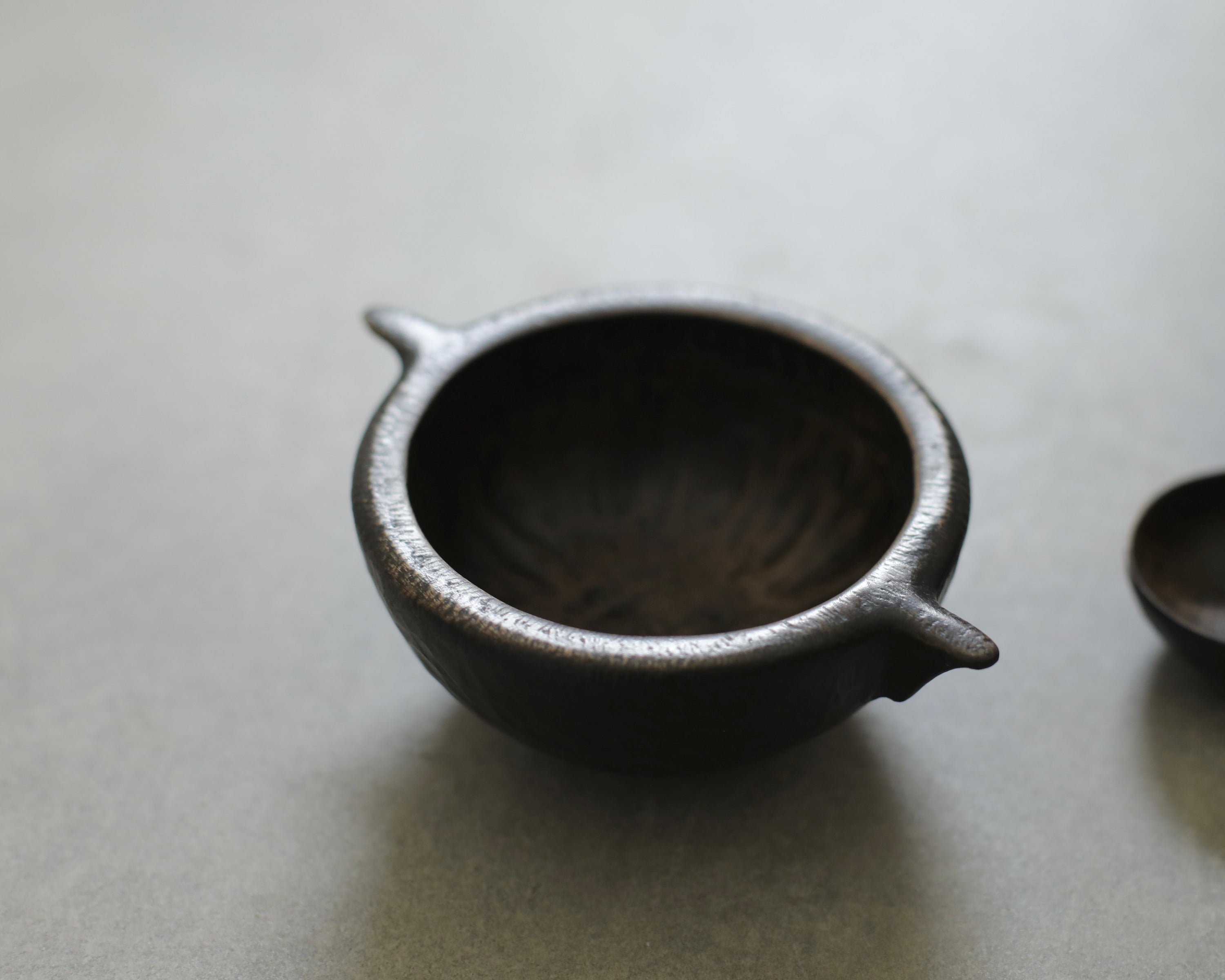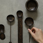 A striking sculptural spoon with a generously proportioned bowl and elegantly slim handles extending from either side. This piece is Eklund’s interpretation of the traditional Supkopp (a Swedish shot or drink cup), drawing inspiration from 18th-century vessels once used for brandy and other spirits. Impeccably handmade by Marie Eklund using only an axe and a knife, the spoon reveals subtle textures and contours that honour the integrity of the wood. She works with the elemental forces of fire, water, and earth to bring out contrasting tones, enhancing the natural grain and character of the material. A small crack in the bowl was delicately repaired with birch root, an understated gesture that adds to the spoon’s story and authenticity.
