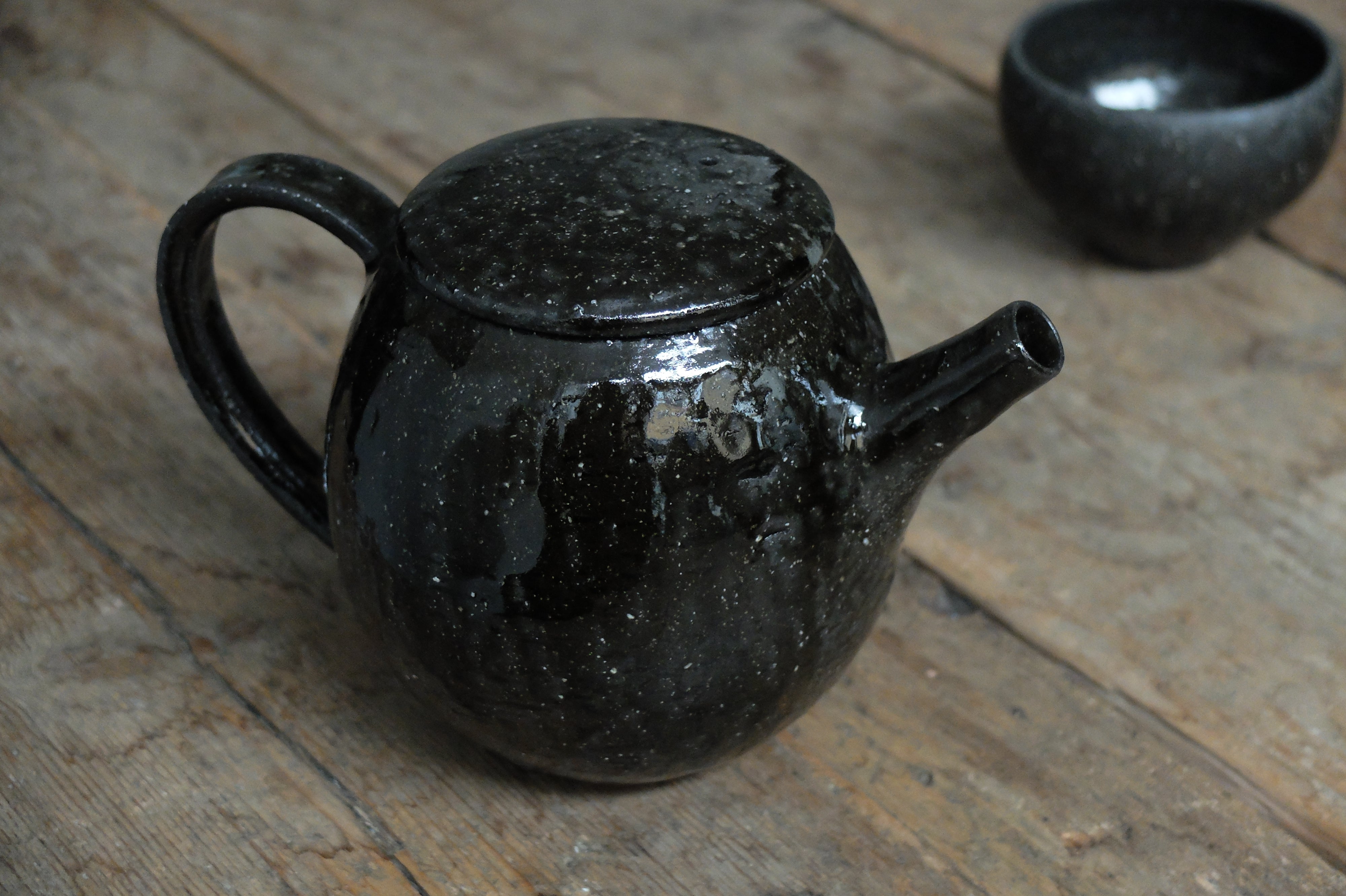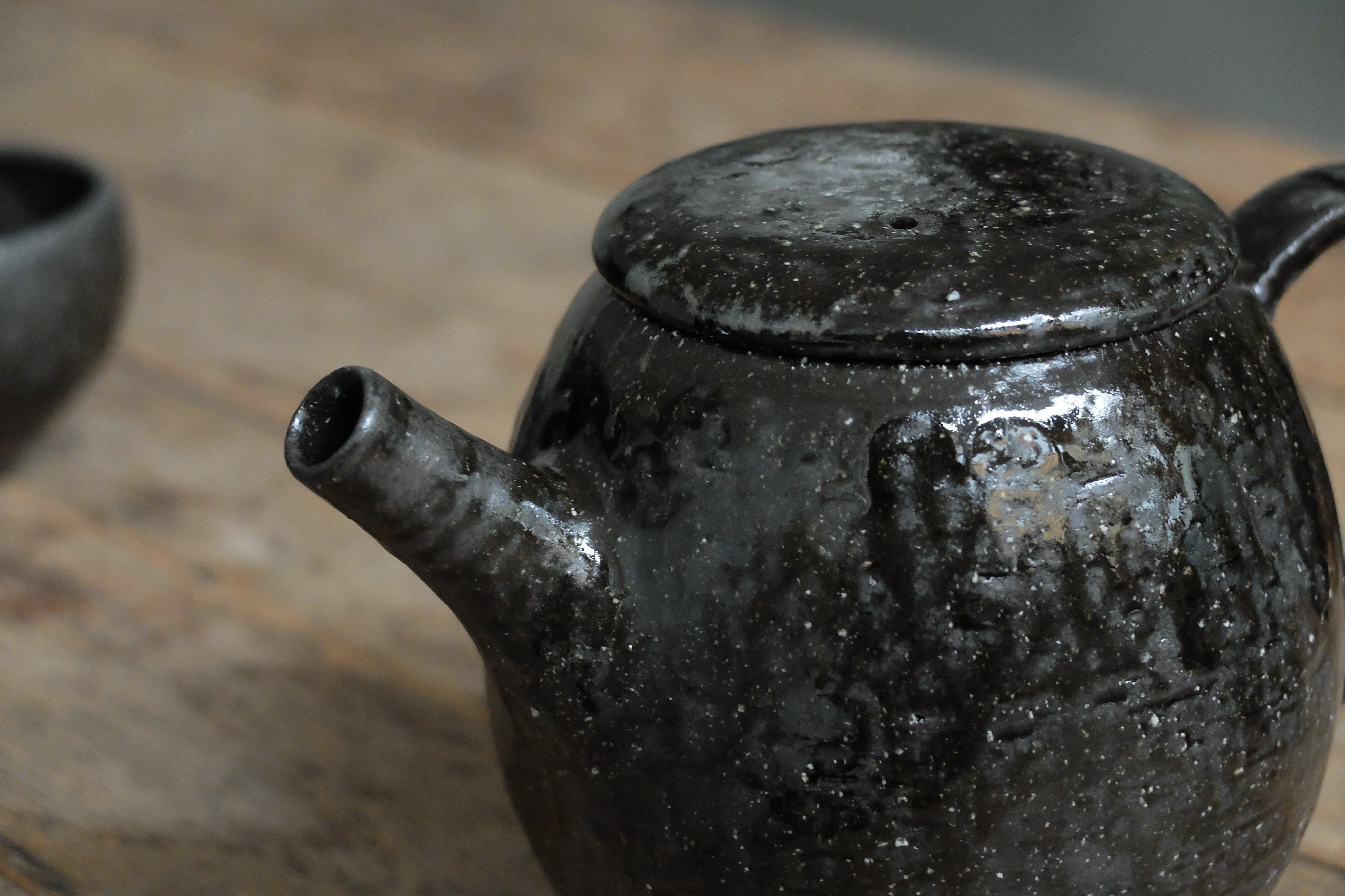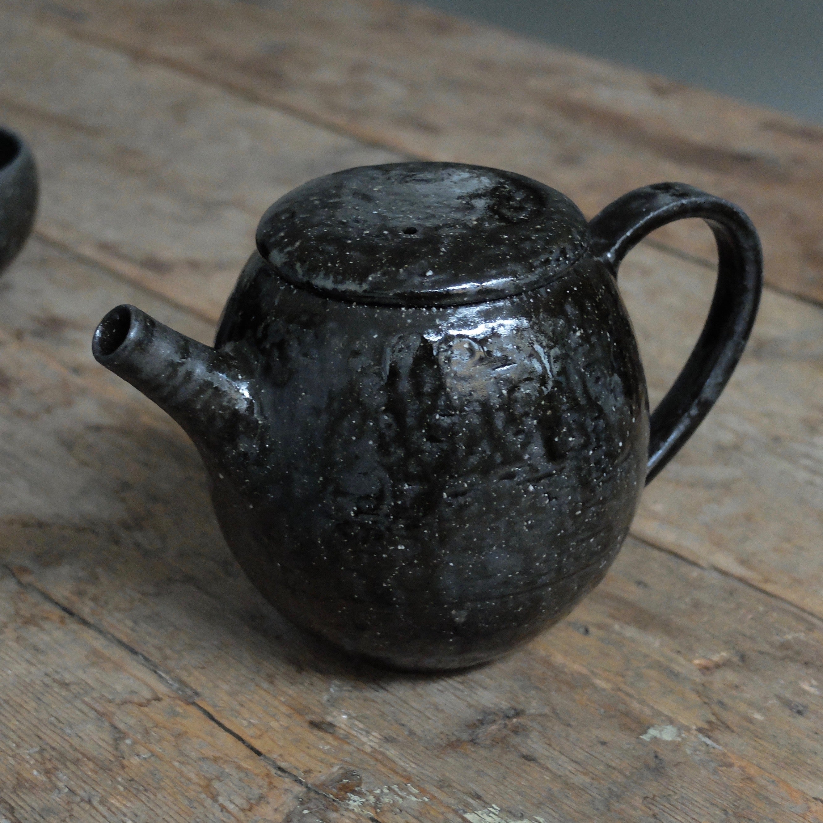 This precious teapot, finely handcrafted by artist Masako Nakagami, exhibits an elevated and full-bellied form, with a delicate and masterfully balanced weight when held in the hand. Its rough glazing, patterned with fine texture and tracks reminiscent of rainfall, display tonal shifts - oscillating between areas of rich ink-black depth to moments of smoke grey softness. The unglazed bottom exhibits the original rough clay body of its material beginnings.