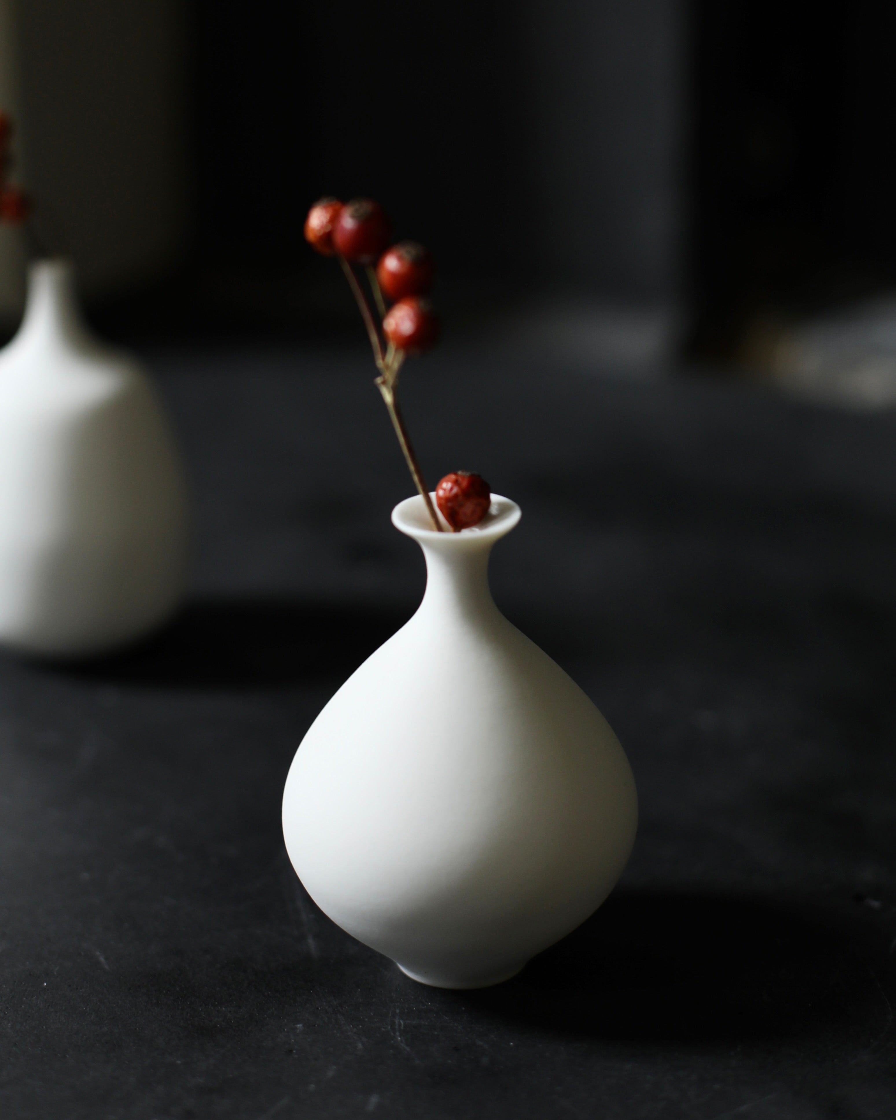 Hand thrown on the wheel Masako's beautiful small nest vase's have a smooth surface, created by mixing glaze into porcelain and polishing. Inspired by nature and the movements within it each piece is then hand carved with soft lines, giving them unique yet subtle character.