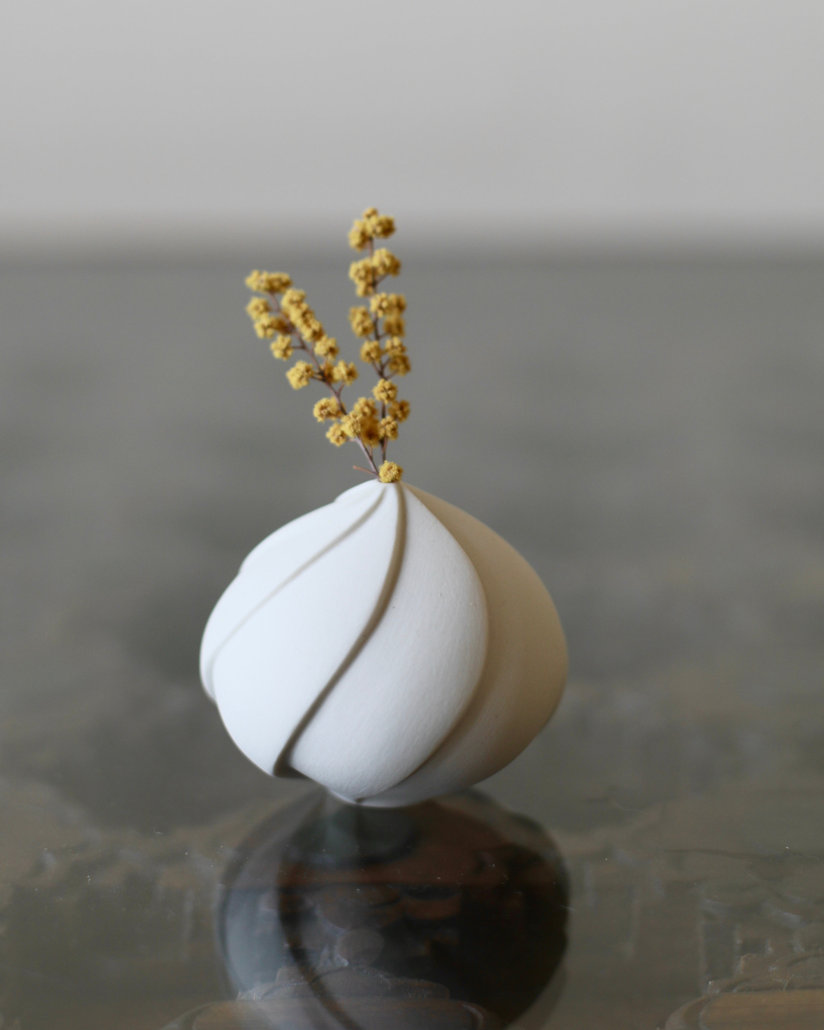 Hand thrown on the wheel Masako's beautiful small nest vase's have a smooth surface, created by mixing glaze into porcelain and polishing. Inspired by nature and the movements within it each piece is then hand carved with soft lines, giving them unique yet subtle character.