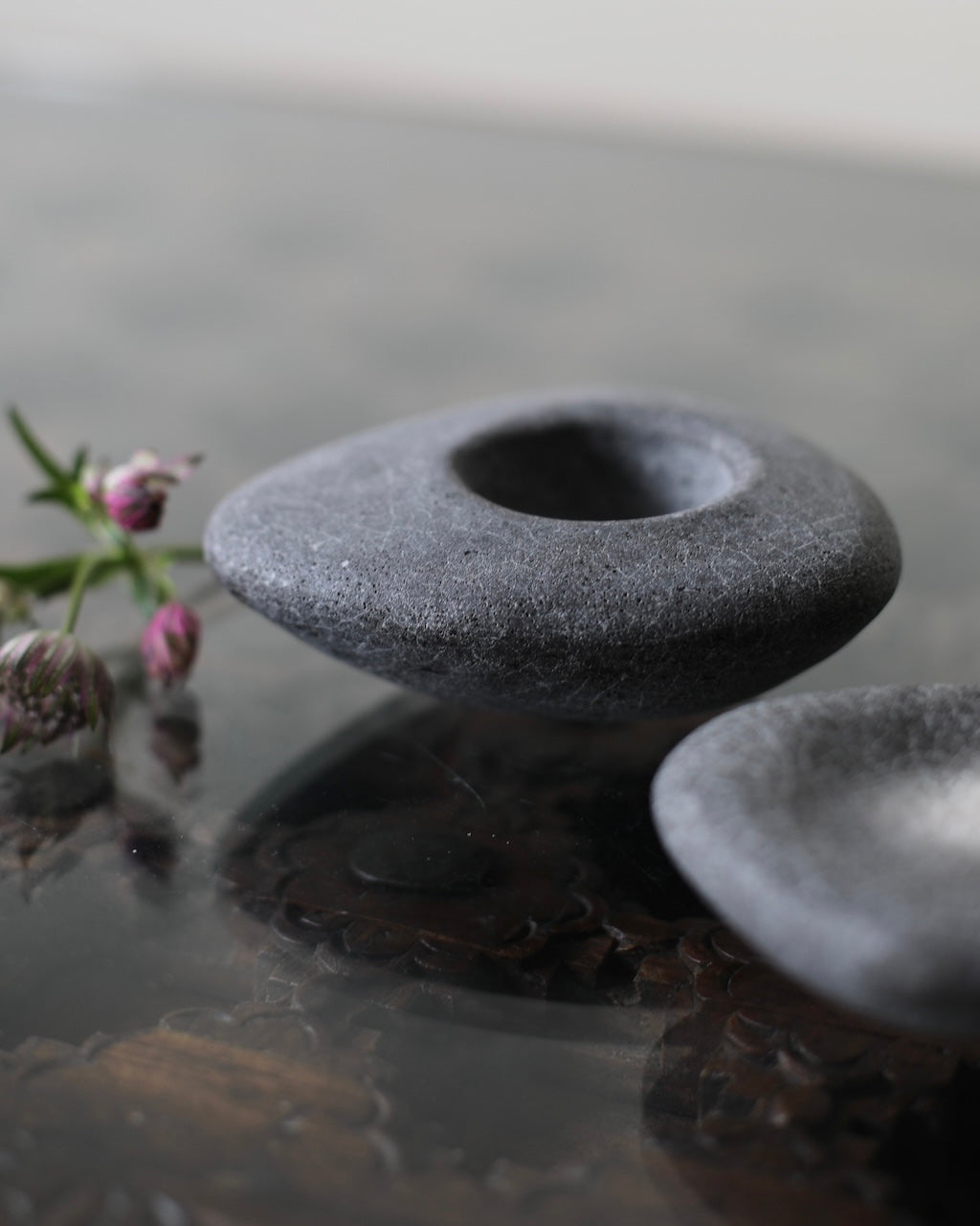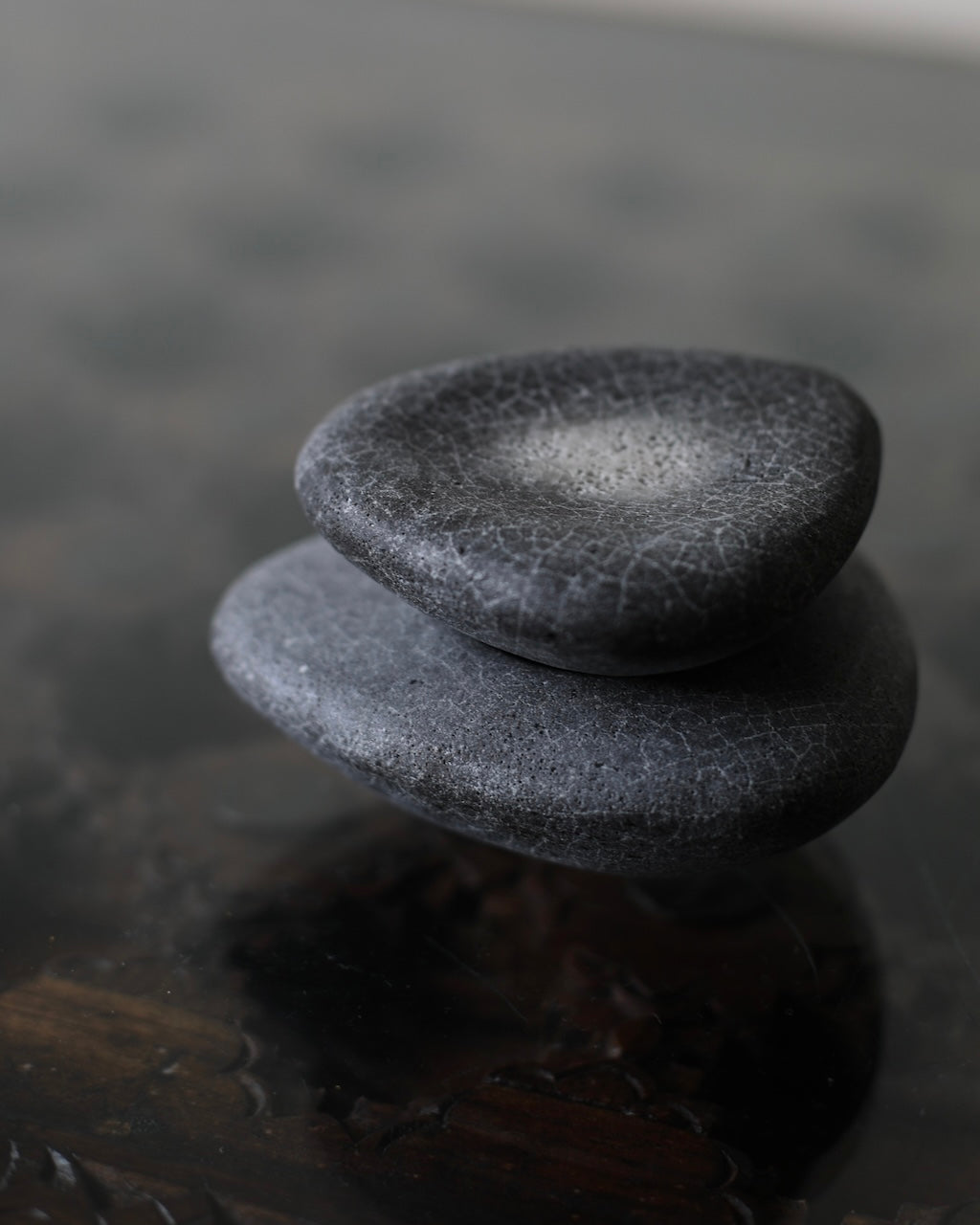 Masako Nakagami presents a series of small ceramic pebble forms that shift between object and vessel. When displayed flat, they read as stone-like presences; when turned, small openings reveal their potential to function as delicate vases. Each piece is formed using a glaze blended with ash from a wood-burning stove, carefully refined to enhance a natural, weathered surface. The resulting textures evoke the softness and irregularity of found stones. Rather than prioritising function, Nakagami invites these works to be encountered as playful, contemplative objects; forms that hold space and encourage stillness.