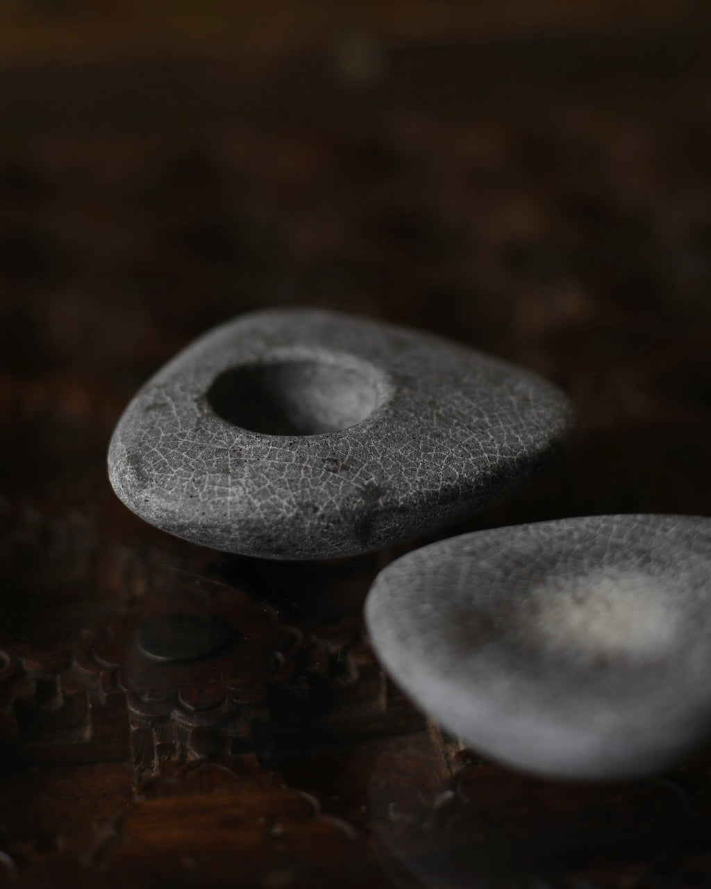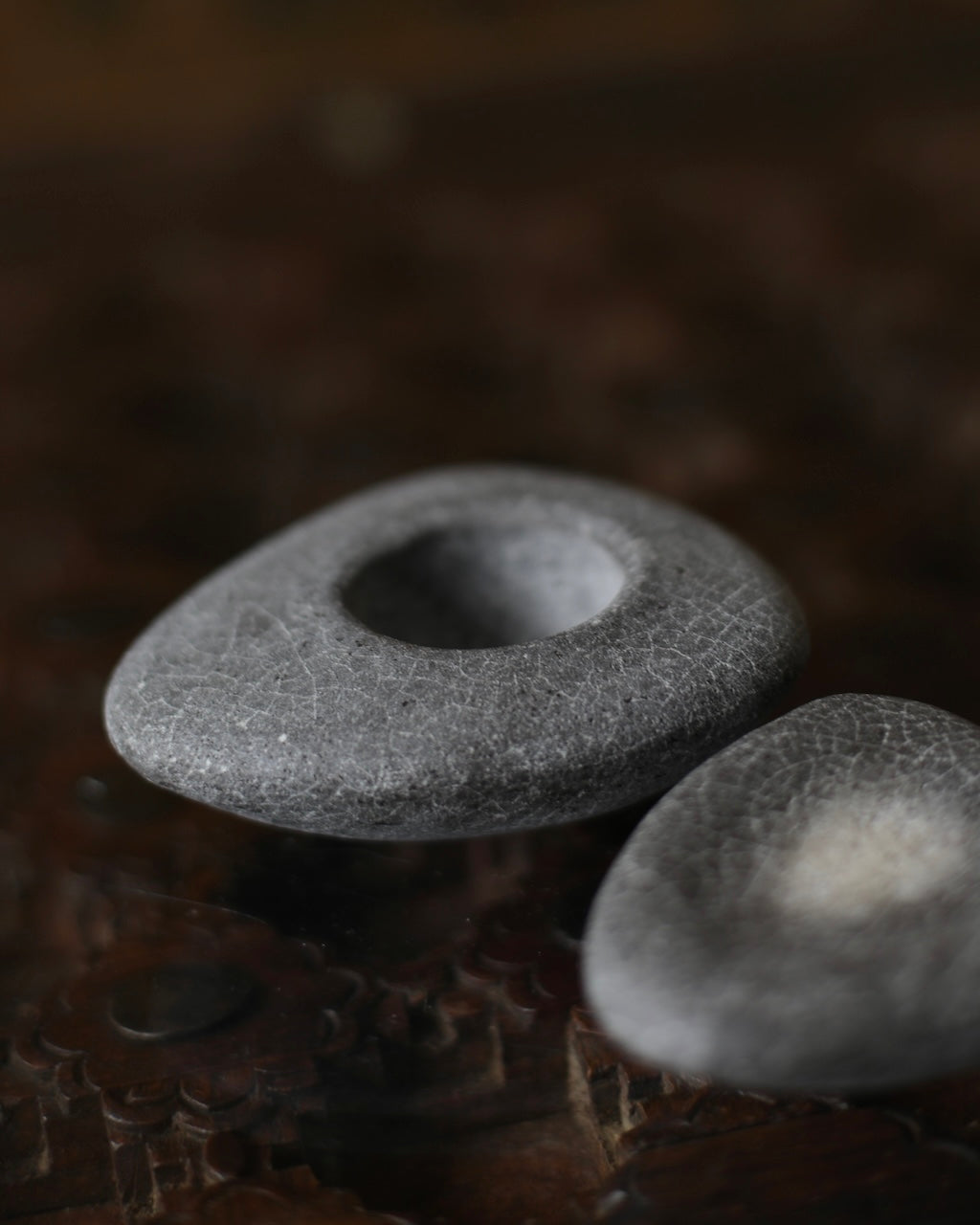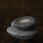 Masako Nakagami presents a series of small ceramic pebble forms that shift between object and vessel. When displayed flat, they read as stone-like presences; when turned, small openings reveal their potential to function as delicate vases. Each piece is formed using a glaze blended with ash from a wood-burning stove, carefully refined to enhance a natural, weathered surface. The resulting textures evoke the softness and irregularity of found stones. Rather than prioritising function, Nakagami invites these works to be encountered as playful, contemplative objects; forms that hold space and encourage stillness.