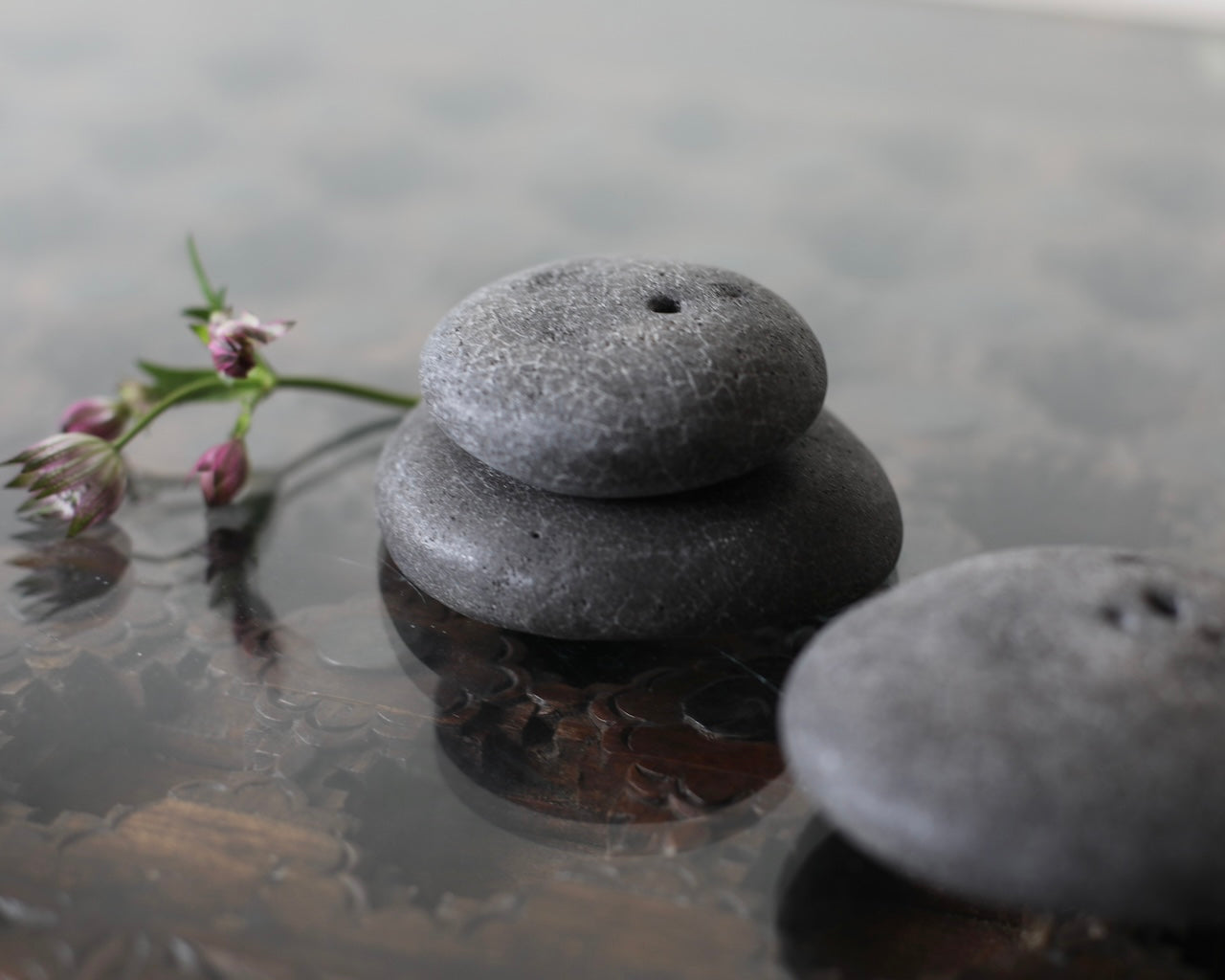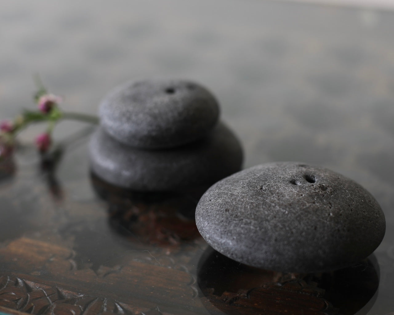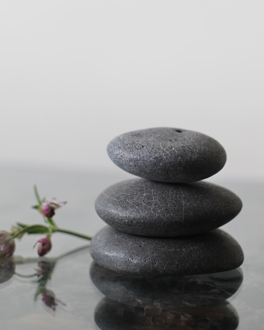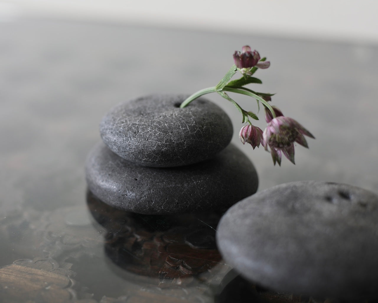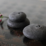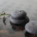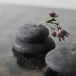 Masako Nakagami presents a series of small ceramic pebble forms that shift between object and vessel. When displayed flat, they read as stone-like presences; when turned, small openings reveal their potential to function as delicate vases. Each piece is formed using a glaze blended with ash from a wood-burning stove, carefully refined to enhance a natural, weathered surface. The resulting textures evoke the softness and irregularity of found stones. Rather than prioritising function, Nakagami invites these works to be encountered as playful, contemplative objects; forms that hold space and encourage stillness.