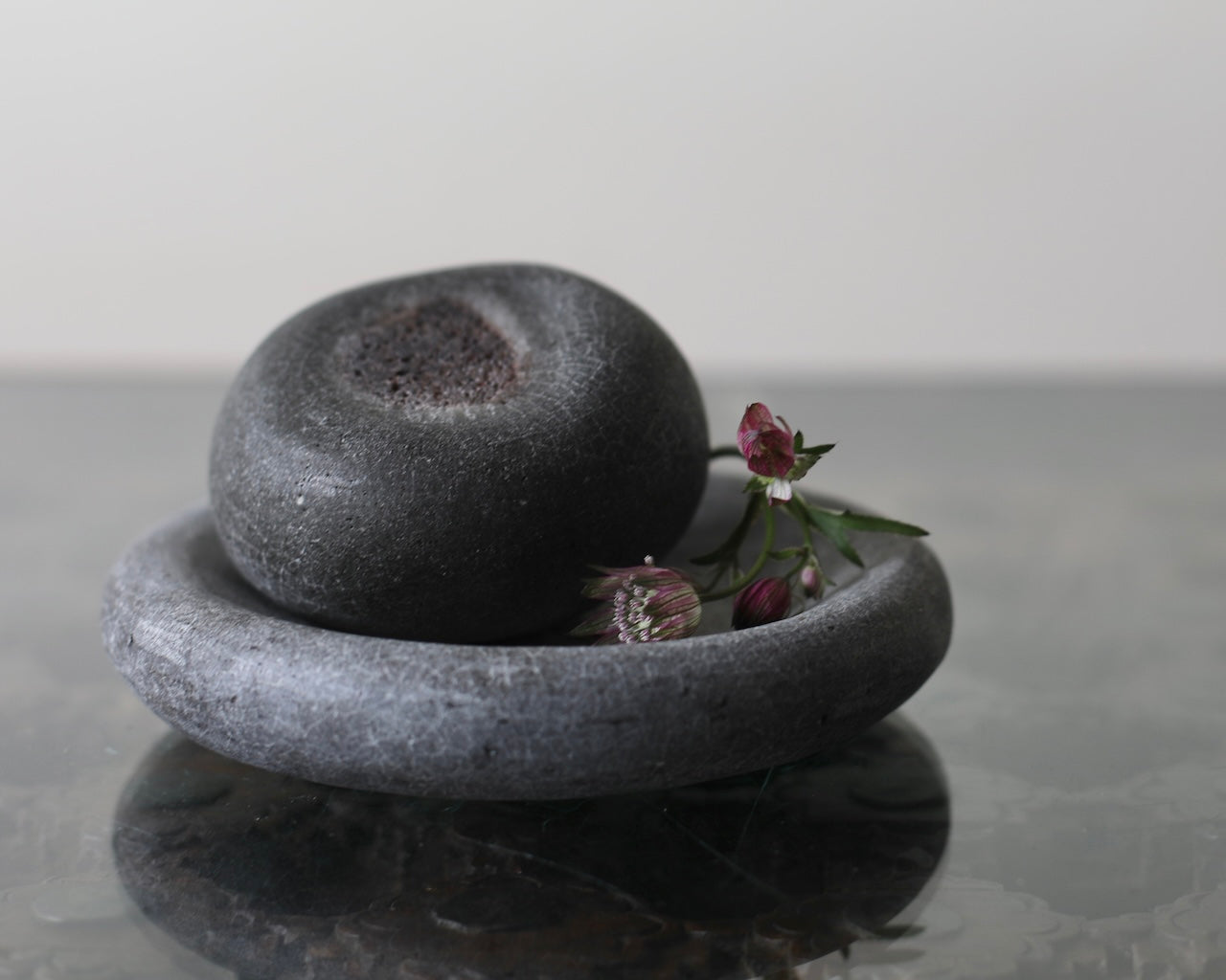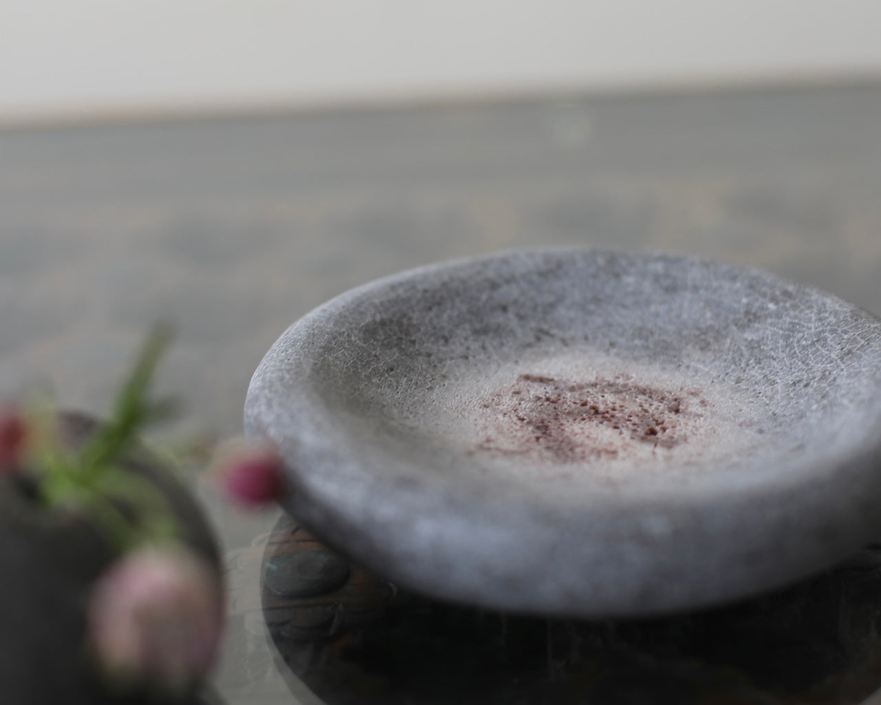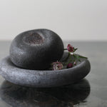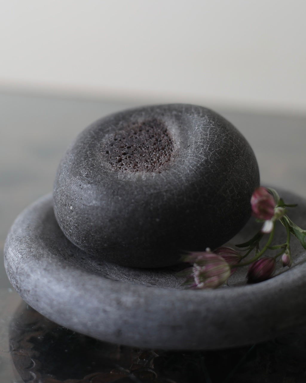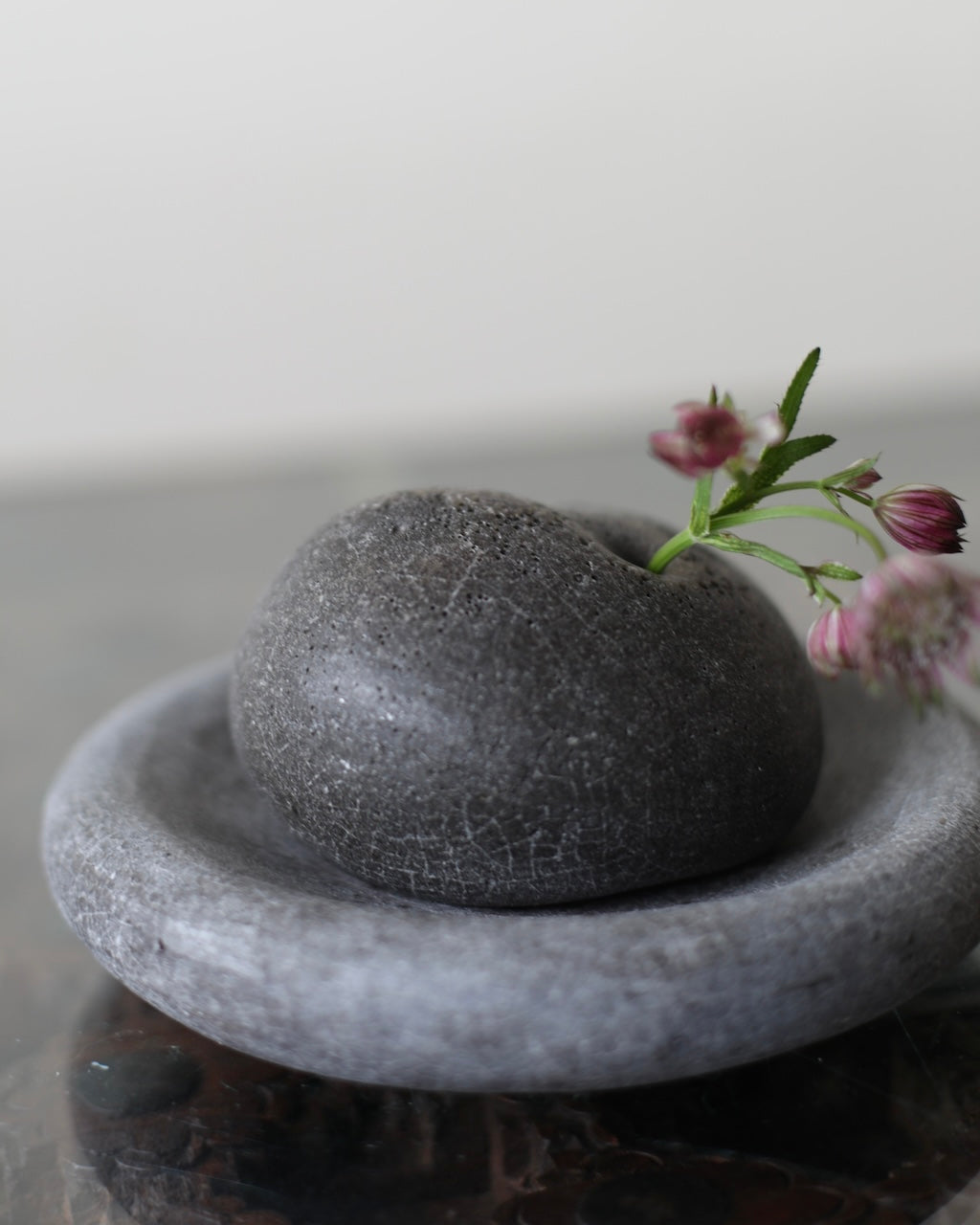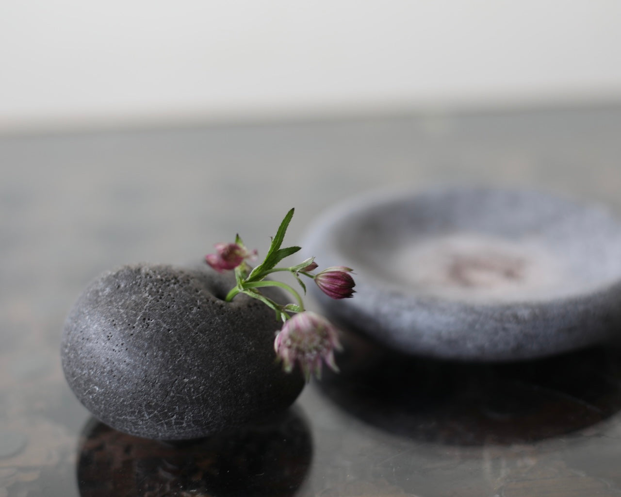 Masako Nakagami presents a series of small ceramic pebble forms that shift between object and vessel. When displayed flat, they read as stone-like presences; when turned, small openings reveal their potential to function as delicate vases. Each piece is formed using a glaze blended with ash from a wood-burning stove, carefully refined to enhance a natural, weathered surface. The resulting textures evoke the softness and irregularity of found stones. Rather than prioritising function, Nakagami invites these works to be encountered as playful, contemplative objects; forms that hold space and encourage stillness.