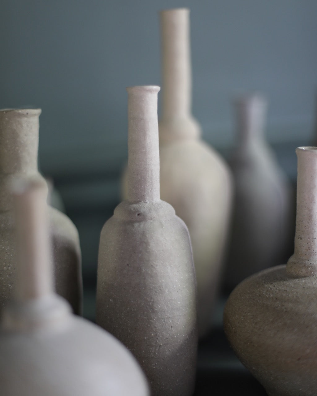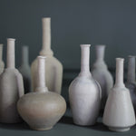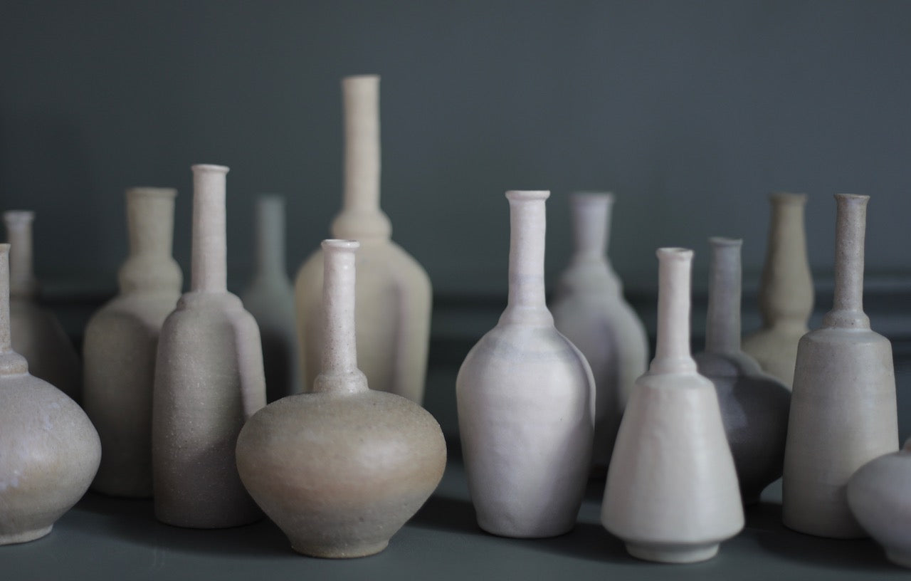 Mizuyo’s pieces are primarily made on the wheel from a combination of different types of clay, which are subsequently glazed in natural muted tones. For the surfaces, Mizuyo uses traditional Japanese and Korean techniques, such as shinogi, mishima and kohiki, and Kezrui, carving with Japanese chisels.