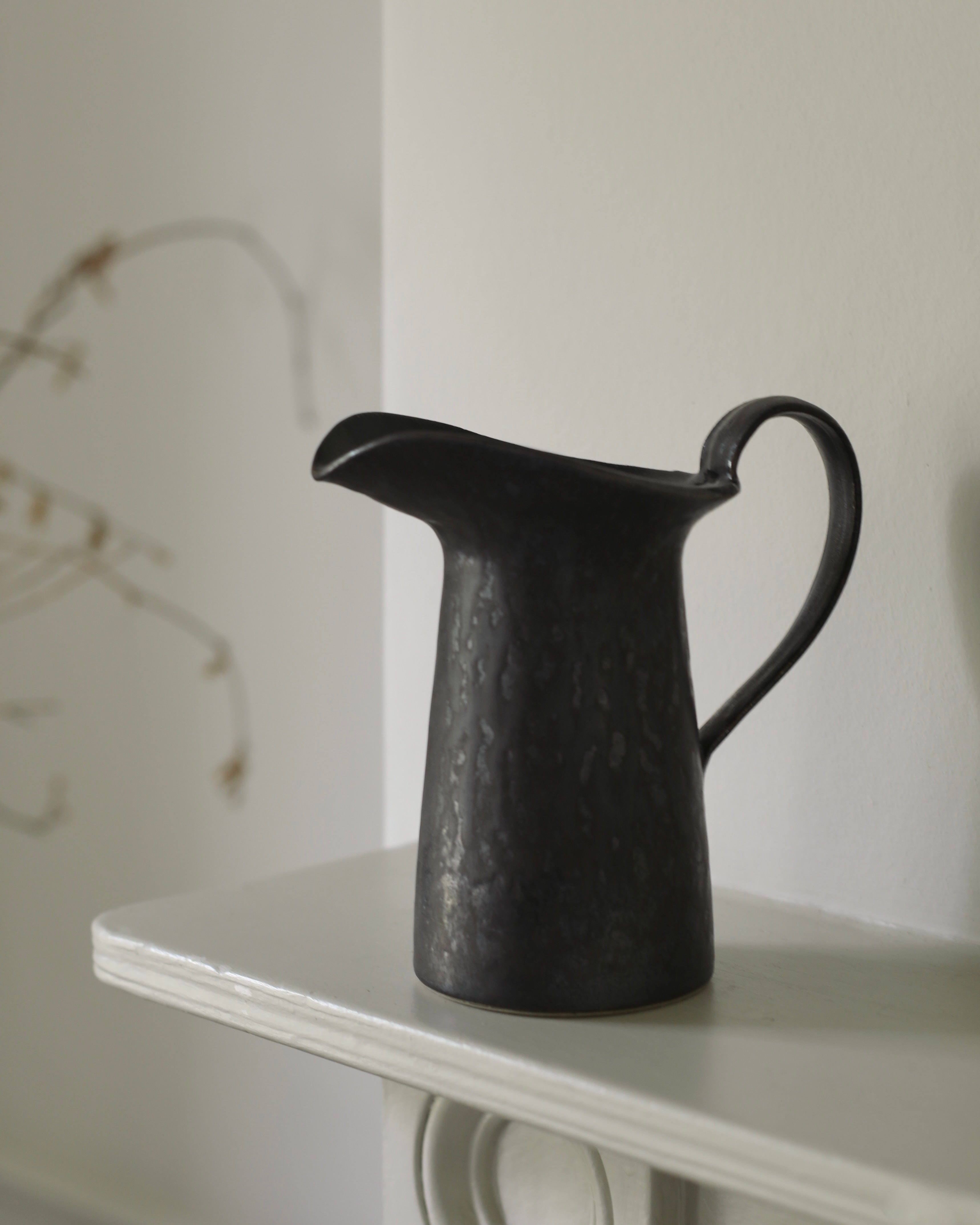 This ceramic pitcher features a richly textured exterior contrasted by a glossy green interior. A subtle metallic glaze catches the light, adding depth and a sense of luminosity to the surface. The form is both functional and expressive, with a generous, well-balanced handle and a gracefully shaped pour spout that extends naturally from the body. Equal parts utility and artistry, the piece embodies Mizuyo’s thoughtful craftsmanship.