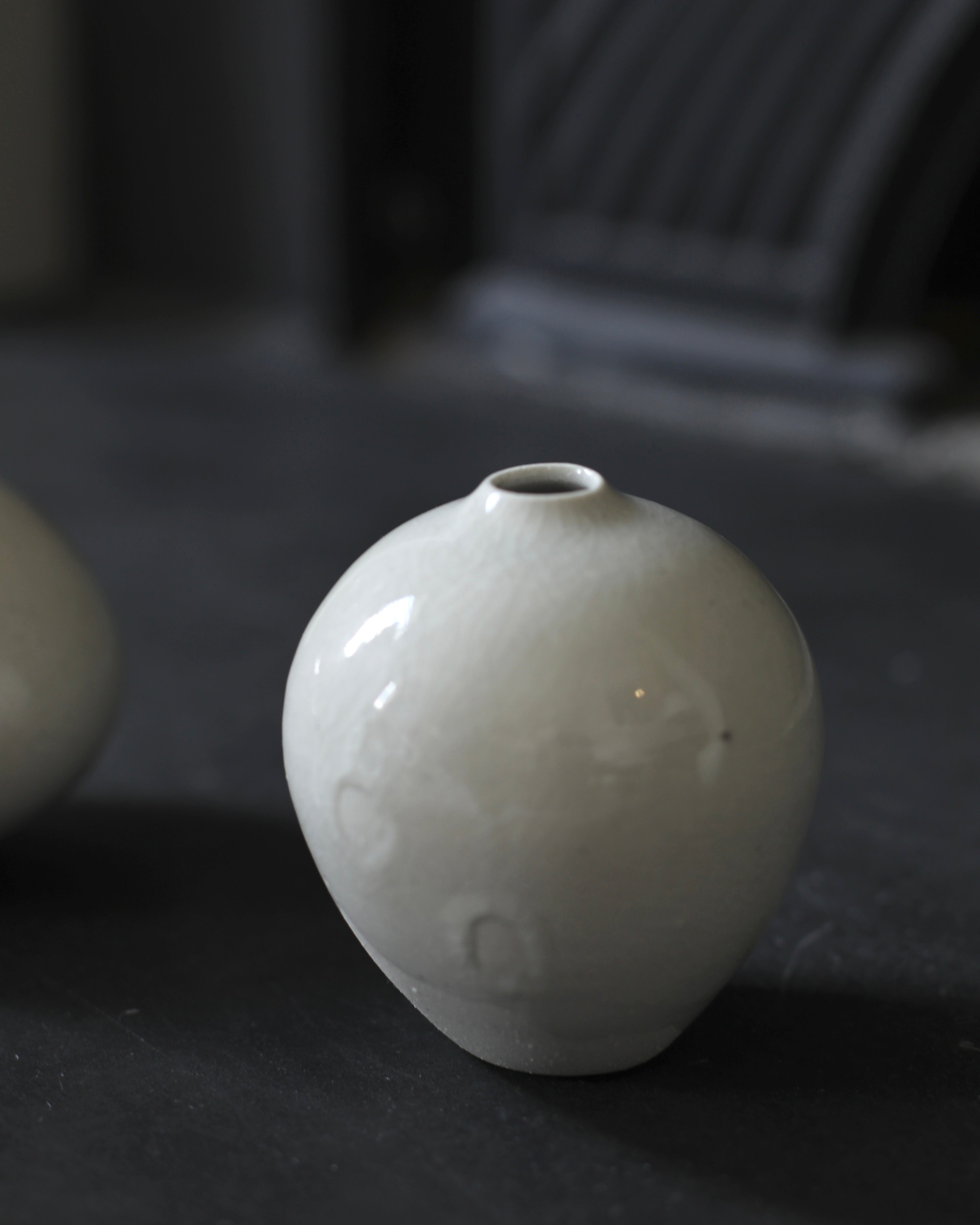This small ceramic vase is formed in a gentle teardrop shape, finished with a soft off-white crackle glaze subtly tinted with the palest blue. Delicate traces of the maker’s hand remain visible where fingertips once held the piece, adding a quiet intimacy to its surface. The glaze drips gracefully down the form, accentuating its organic character, while the maker’s mark rests at the base, a signature of authenticity and craft. A subtle, timeless piece that carries both elegance and the warmth of the hand that shaped it.