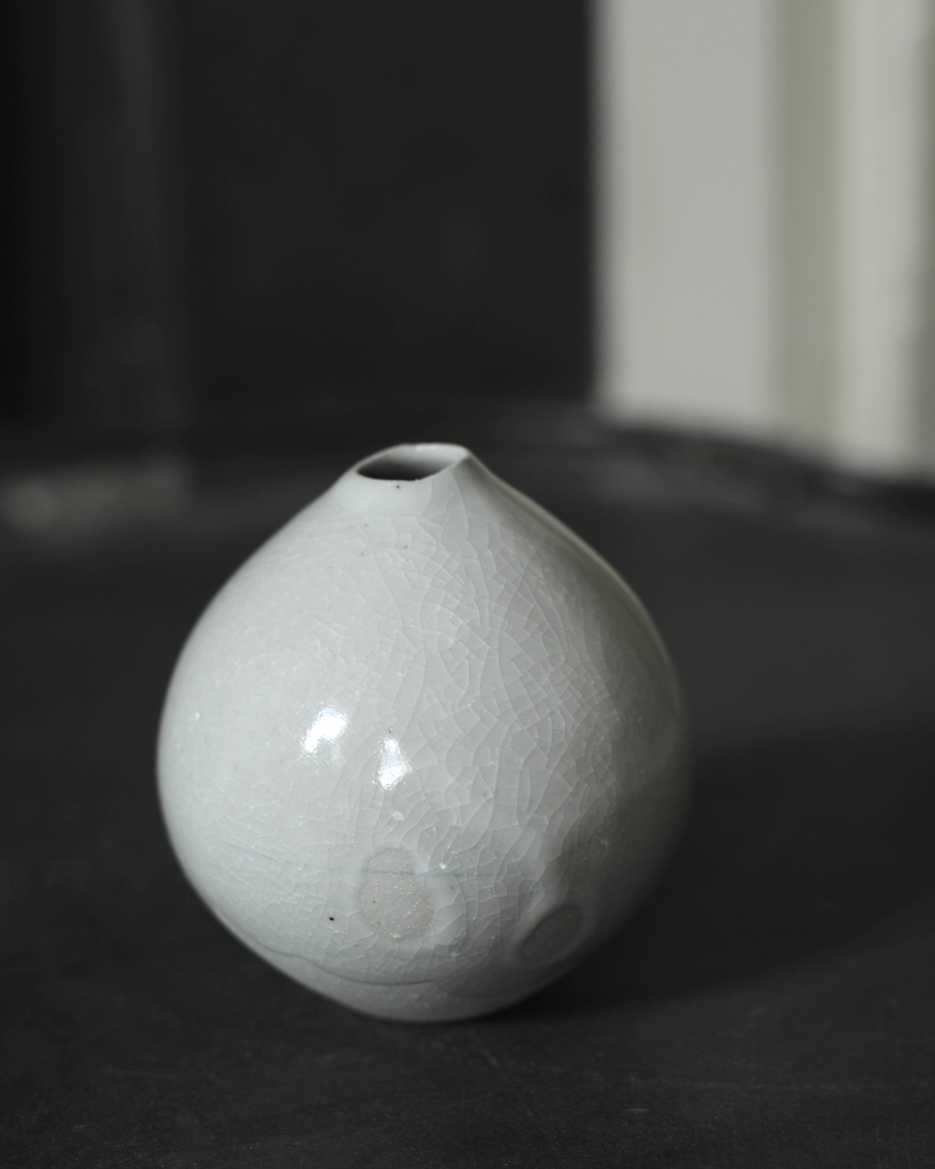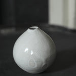 This small ceramic vase is formed in a gentle teardrop shape, finished with a soft off-white crackle glaze subtly tinted with the palest blue. Delicate traces of the maker’s hand remain visible where fingertips once held the piece, adding a quiet intimacy to its surface. The glaze drips gracefully down the form, accentuating its organic character, while the maker’s mark rests at the base, a signature of authenticity and craft. A subtle, timeless piece that carries both elegance and the warmth of the hand that shaped it.