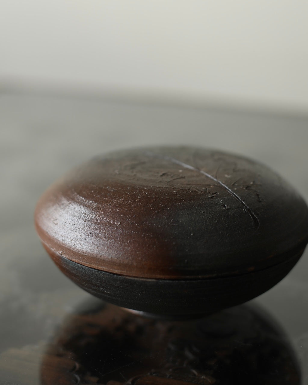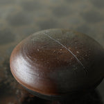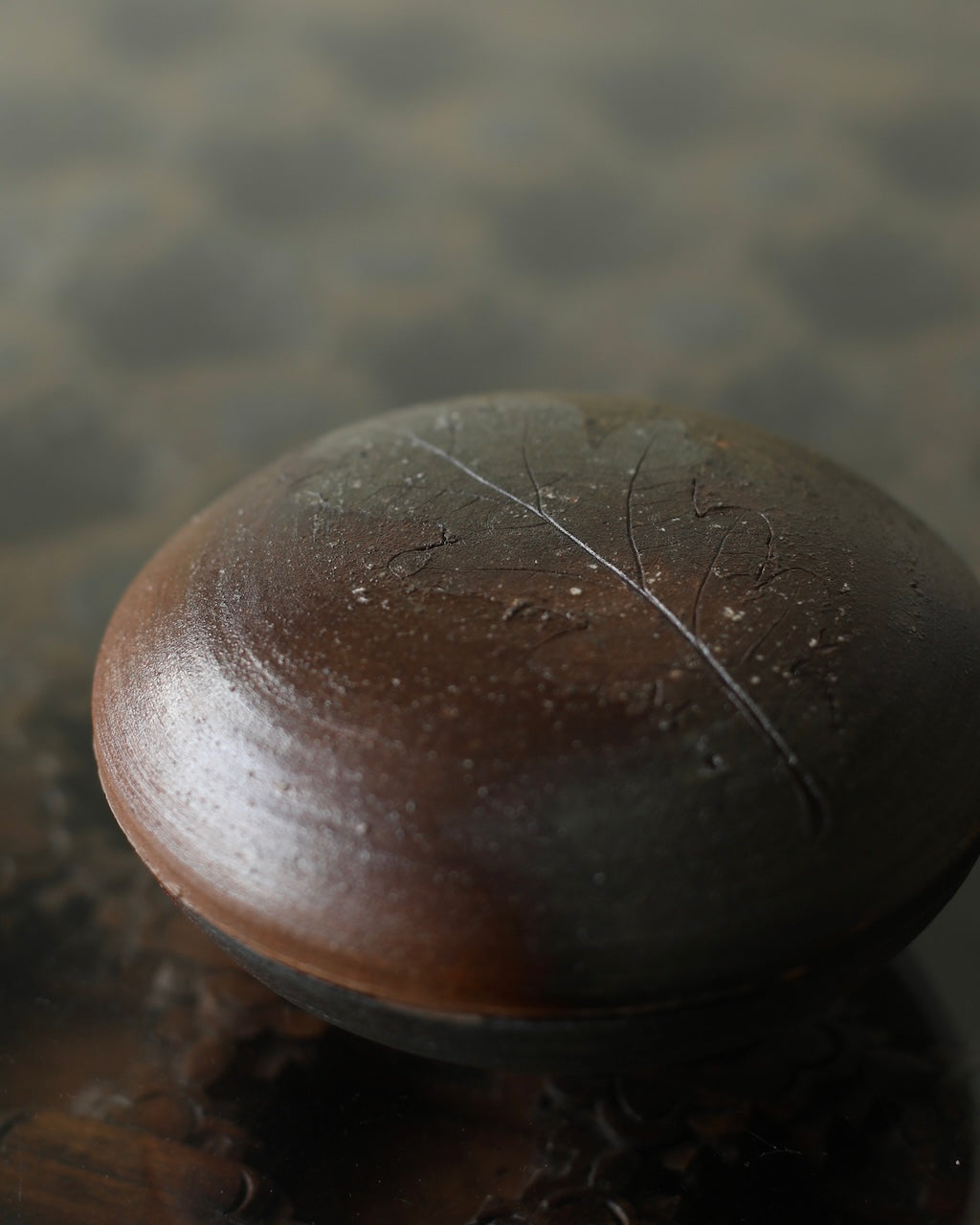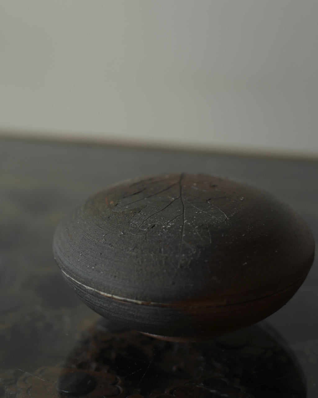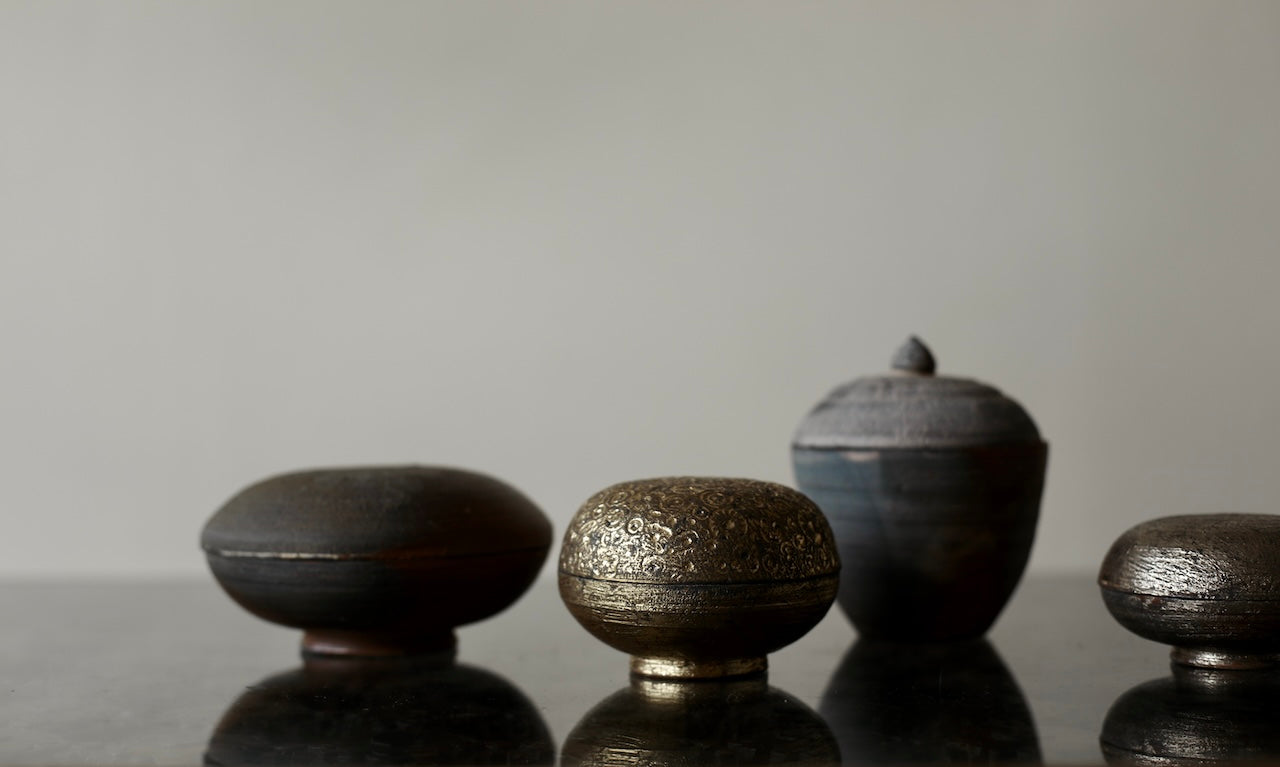 Fuller’s collection, presented for ‘Presence in Miniature’ includes small lidded jars and treasure boxes featuring richly layered surfaces shaped by wood-firing. The works move between warm reddish browns and cooler greys, with subtle notes of yellow and moon gold throughout. Stamped and etched markings reference organic forms, while soft horizontal lines ripple gently around each vessel. Fired with split pine and beech, natural ash settles across the surfaces, creating unique variations in tone and texture that make every piece distinct.
