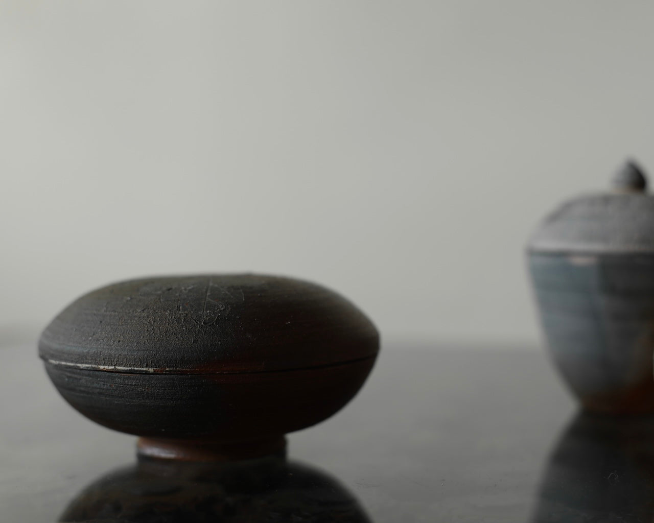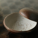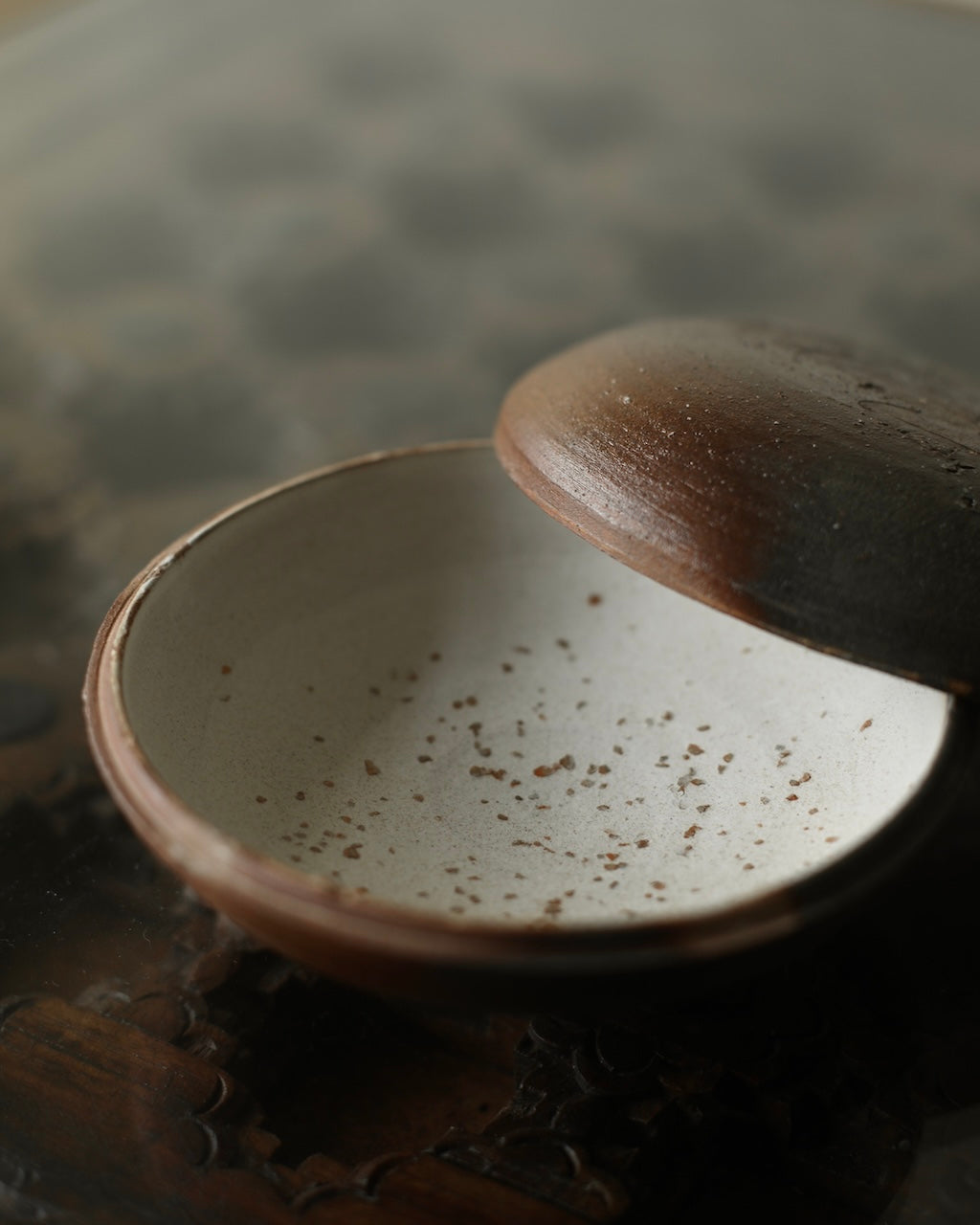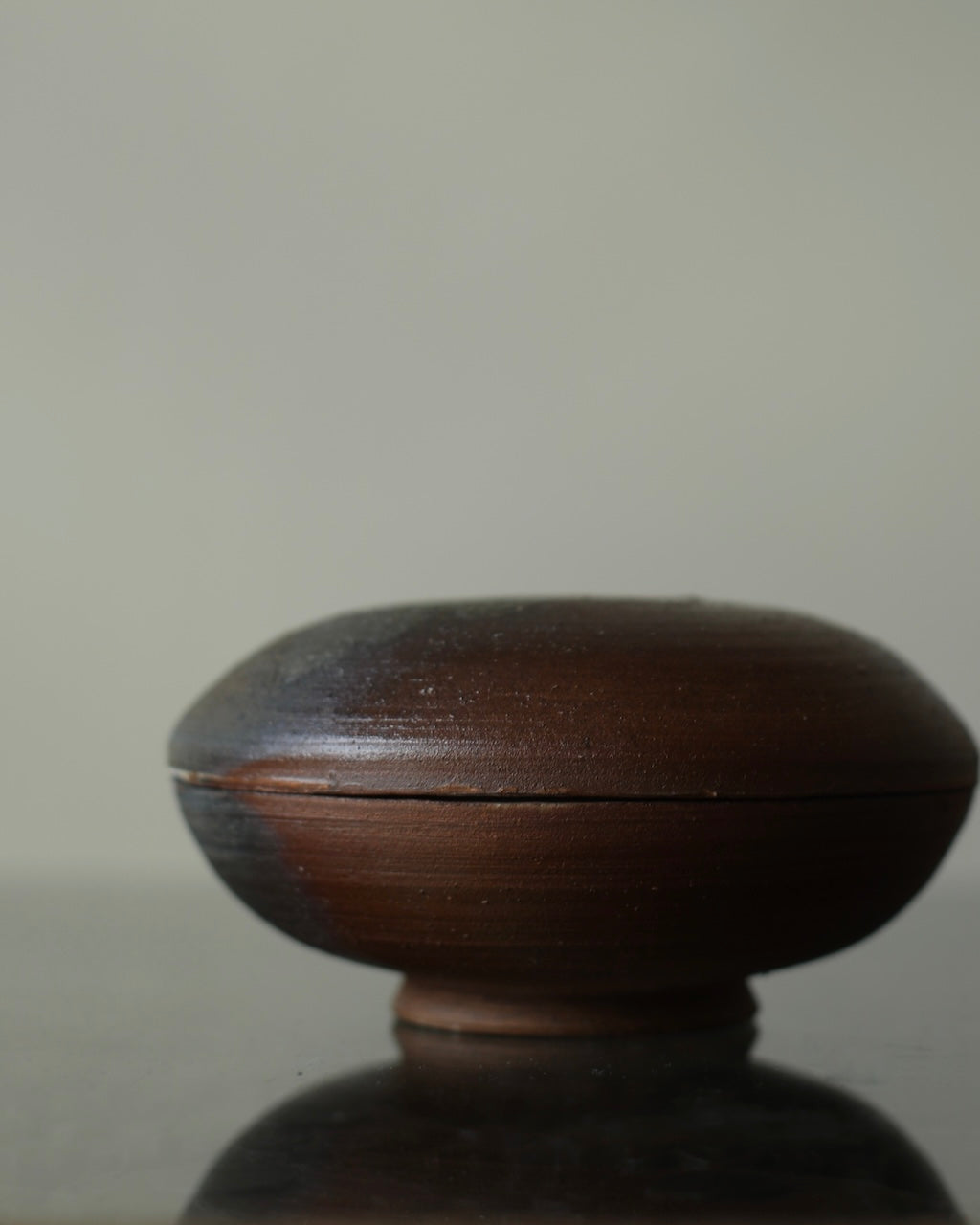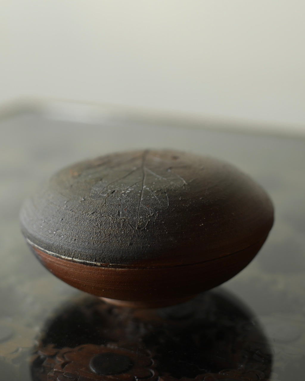 Fuller’s collection, presented for ‘Presence in Miniature’ includes small lidded jars and treasure boxes featuring richly layered surfaces shaped by wood-firing. The works move between warm reddish browns and cooler greys, with subtle notes of yellow and moon gold throughout. Stamped and etched markings reference organic forms, while soft horizontal lines ripple gently around each vessel. Fired with split pine and beech, natural ash settles across the surfaces, creating unique variations in tone and texture that make every piece distinct.