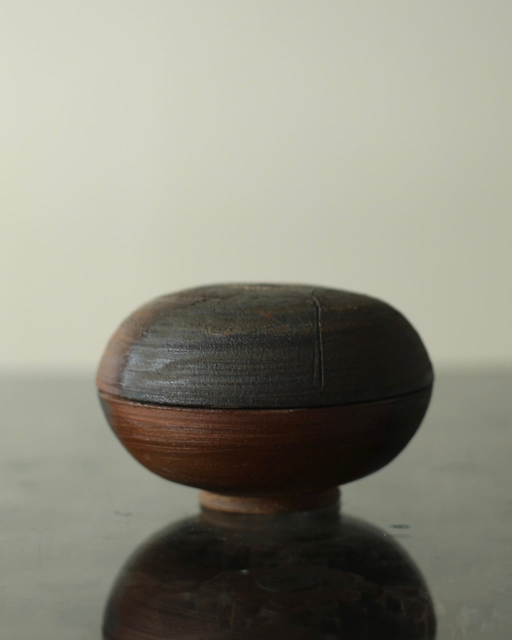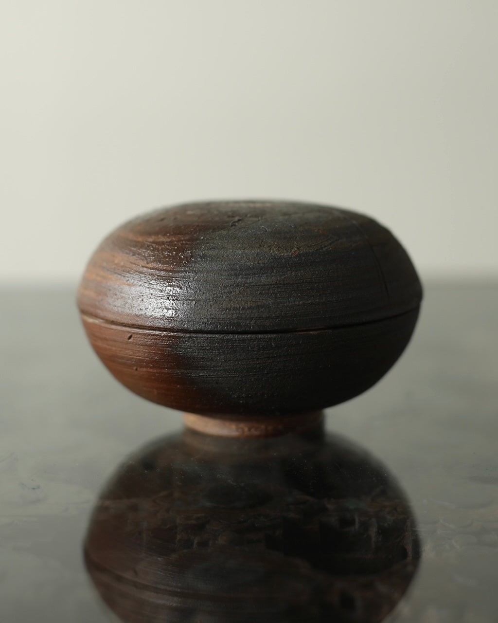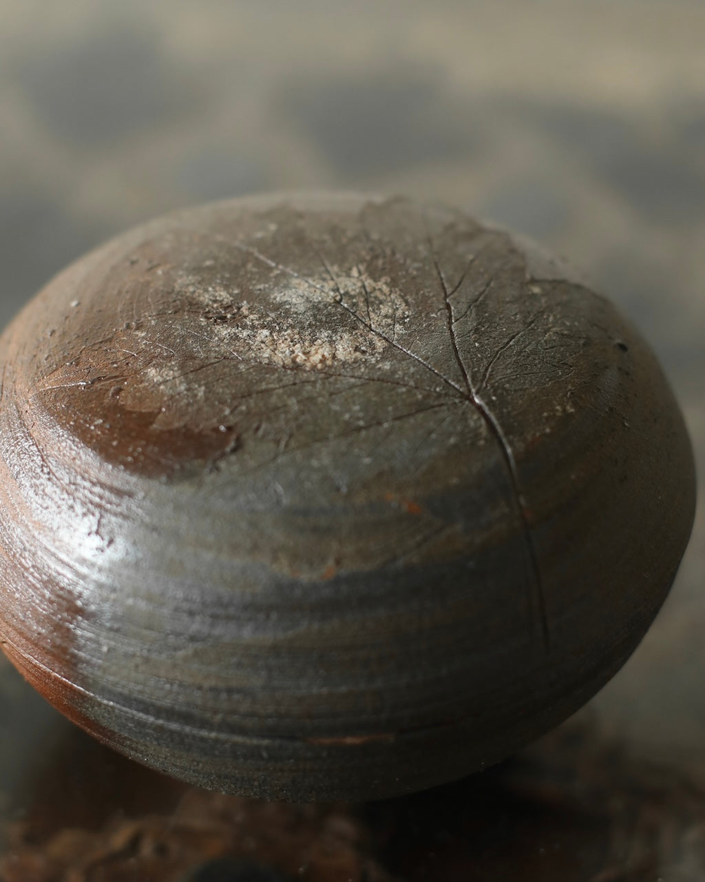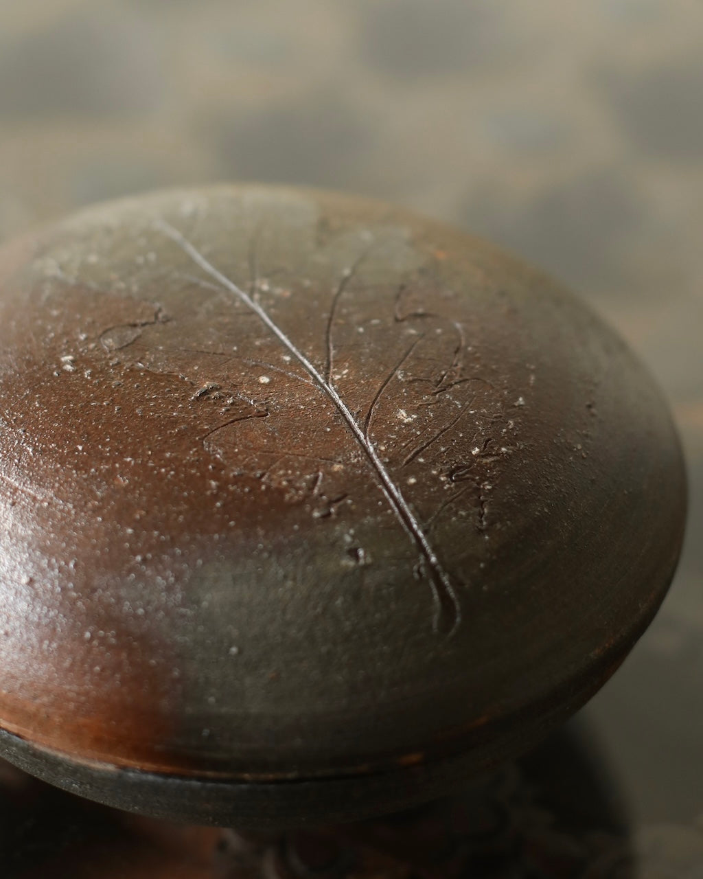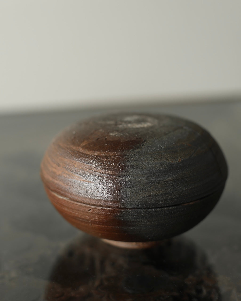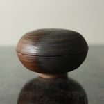 Fuller’s collection, presented for ‘Presence in Miniature’ includes small lidded jars and treasure boxes featuring richly layered surfaces shaped by wood-firing. The works move between warm reddish browns and cooler greys, with subtle notes of yellow and moon gold throughout. Stamped and etched markings reference organic forms, while soft horizontal lines ripple gently around each vessel. Fired with split pine and beech, natural ash settles across the surfaces, creating unique variations in tone and texture that make every piece distinct.