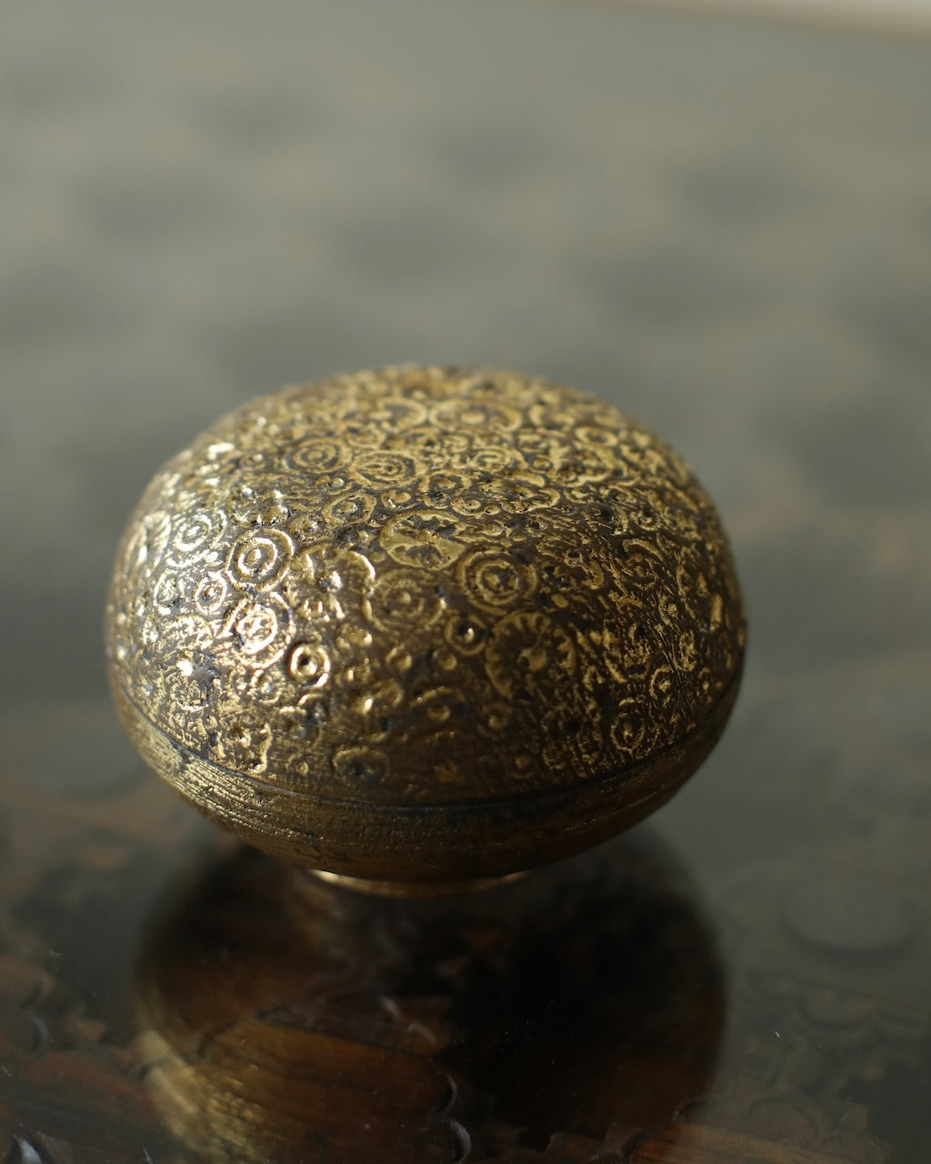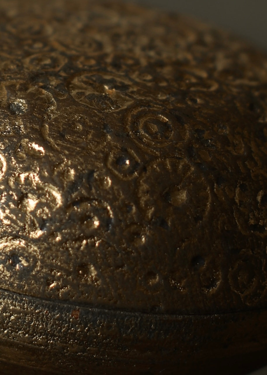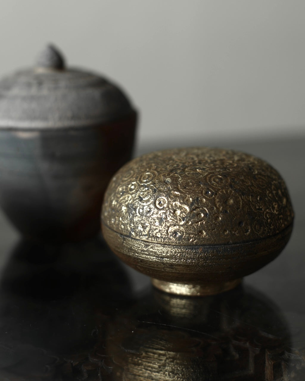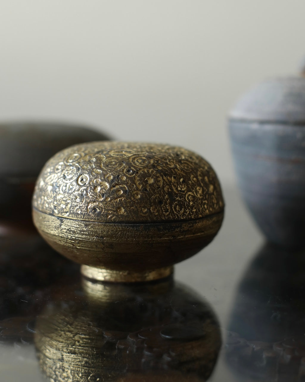 Fuller’s collection, presented for ‘Presence in Miniature’ includes small lidded jars and treasure boxes featuring richly layered surfaces shaped by wood-firing. The works move between warm reddish browns and cooler greys, with subtle notes of yellow and moon gold throughout. Stamped and etched markings reference organic forms, while soft horizontal lines ripple gently around each vessel. Fired with split pine and beech, natural ash settles across the surfaces, creating unique variations in tone and texture that make every piece distinct.
