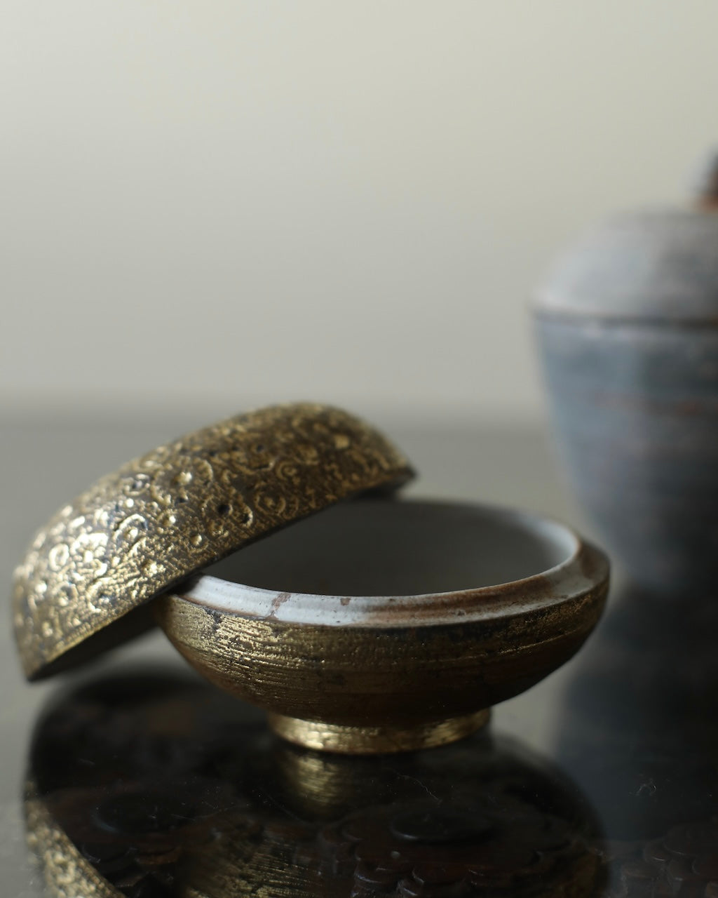 Materials - Stoneware blend, Finnish wild clay slips, natural ash glaze, 23 carat yellow gold leaf