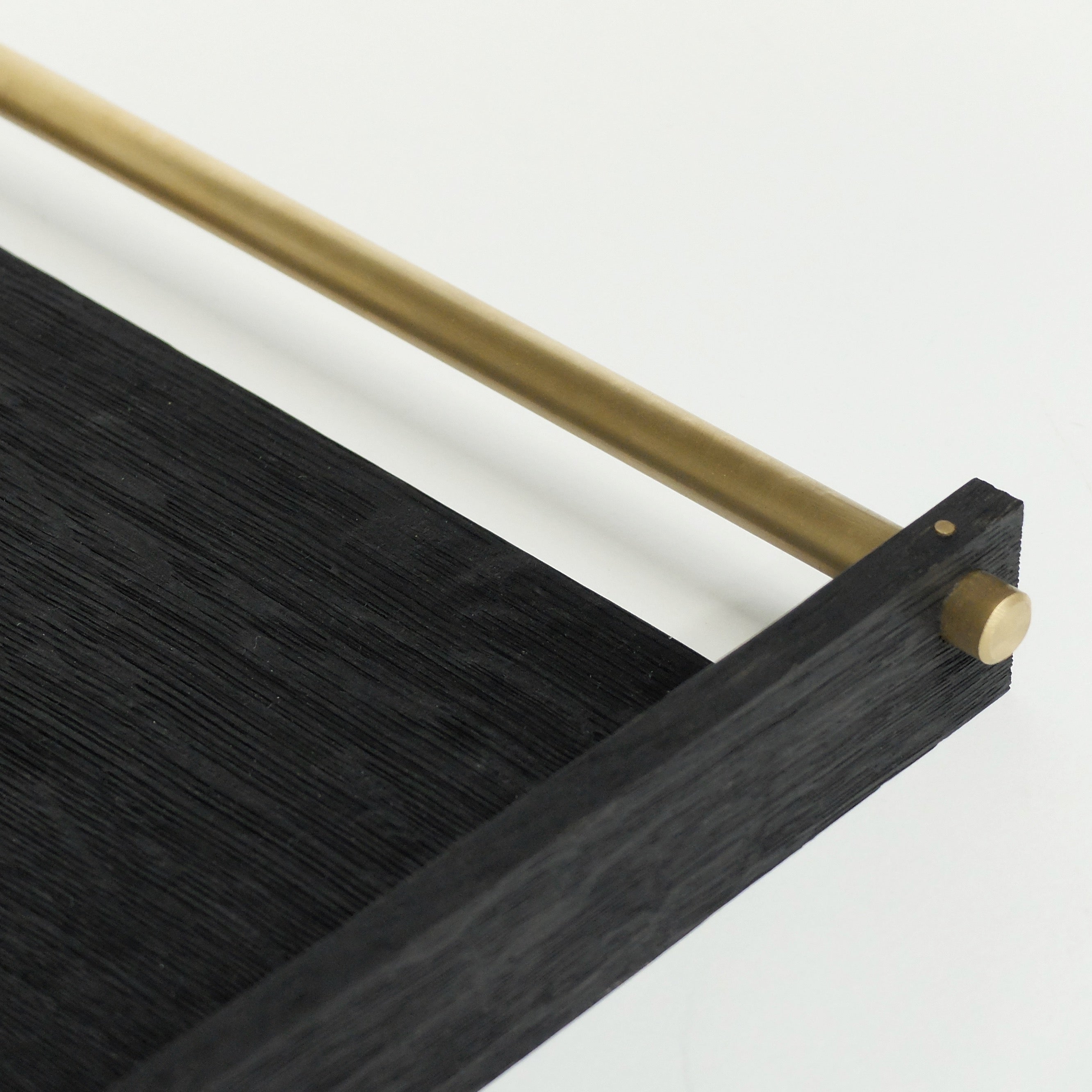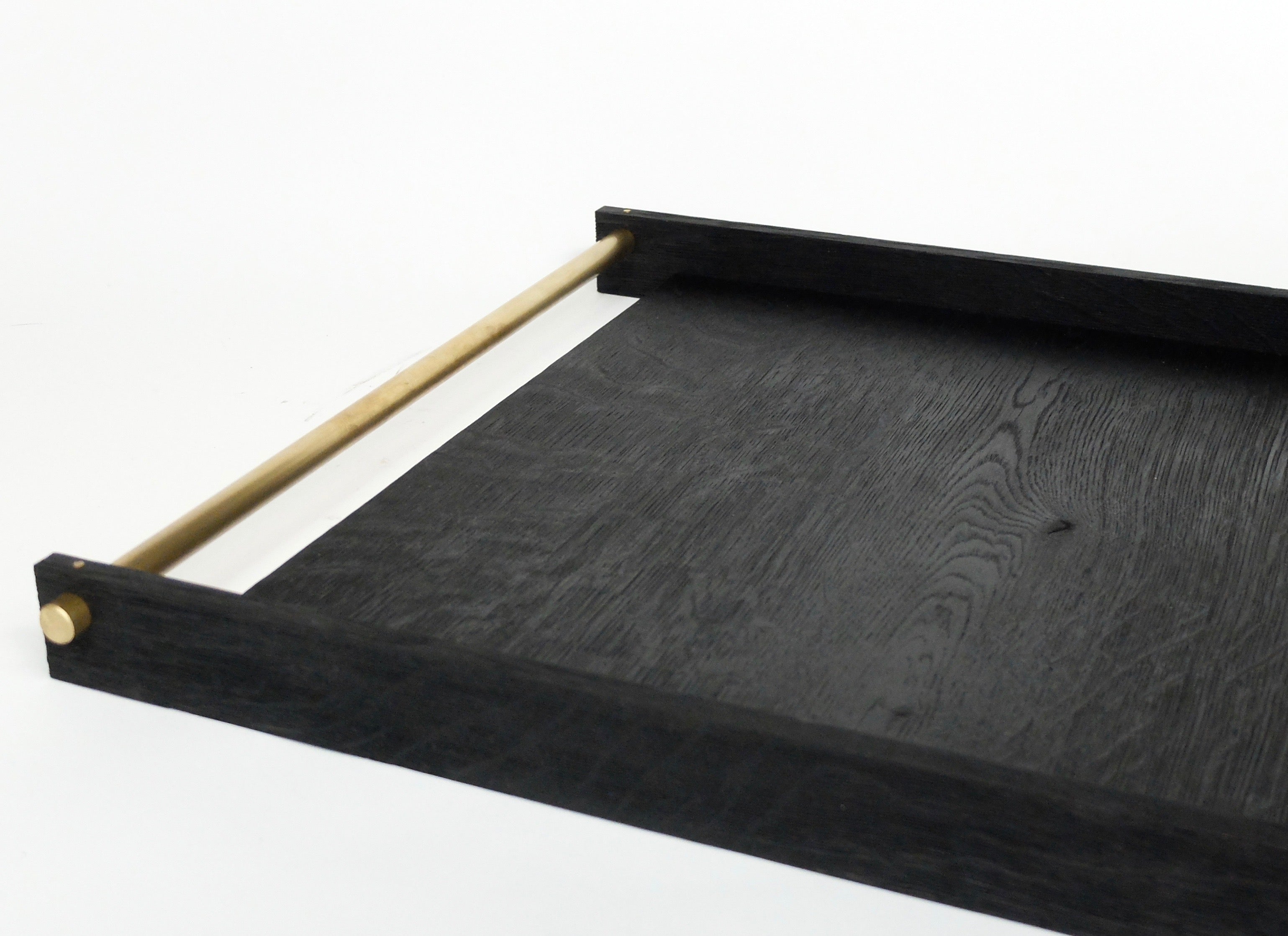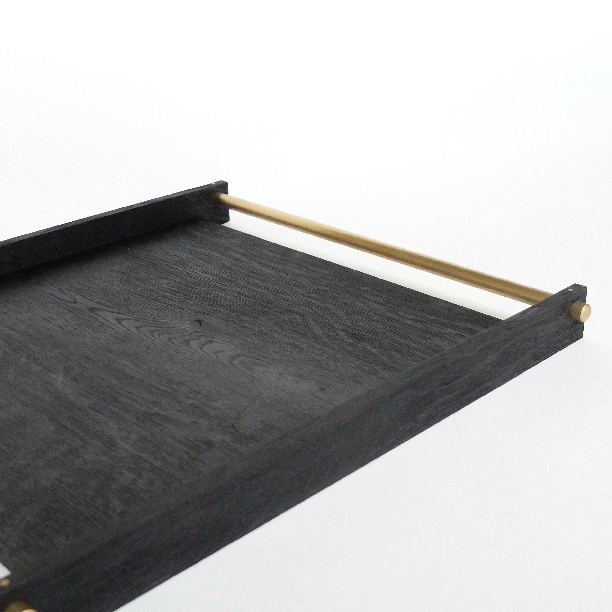 This ceremonious piece balances the line between the sculptural and the functional; an altar on which to serve tea, a platform to display treasured objects, and a highly designed elegant artwork of its own right. The English oak has been burnt and charred, giving it its beautiful rich dark colour, highlighting the grain and texture of the woods surface. The addition of the simple yet beautifully contrasting golden coloured, clyndrical brass handles seem to lead to a meeting of the ancient and the modern that elevate this piece's sophisticated beauty.