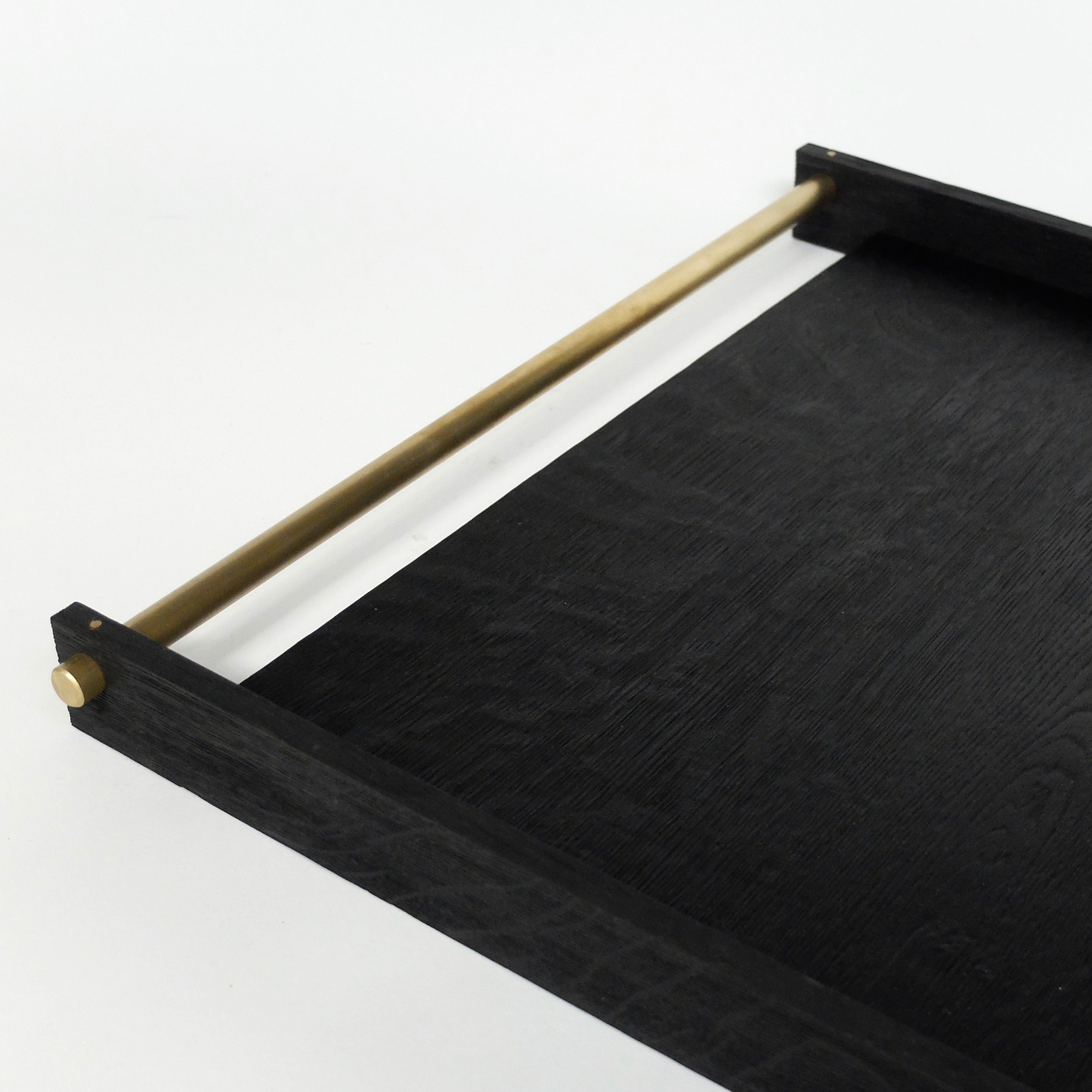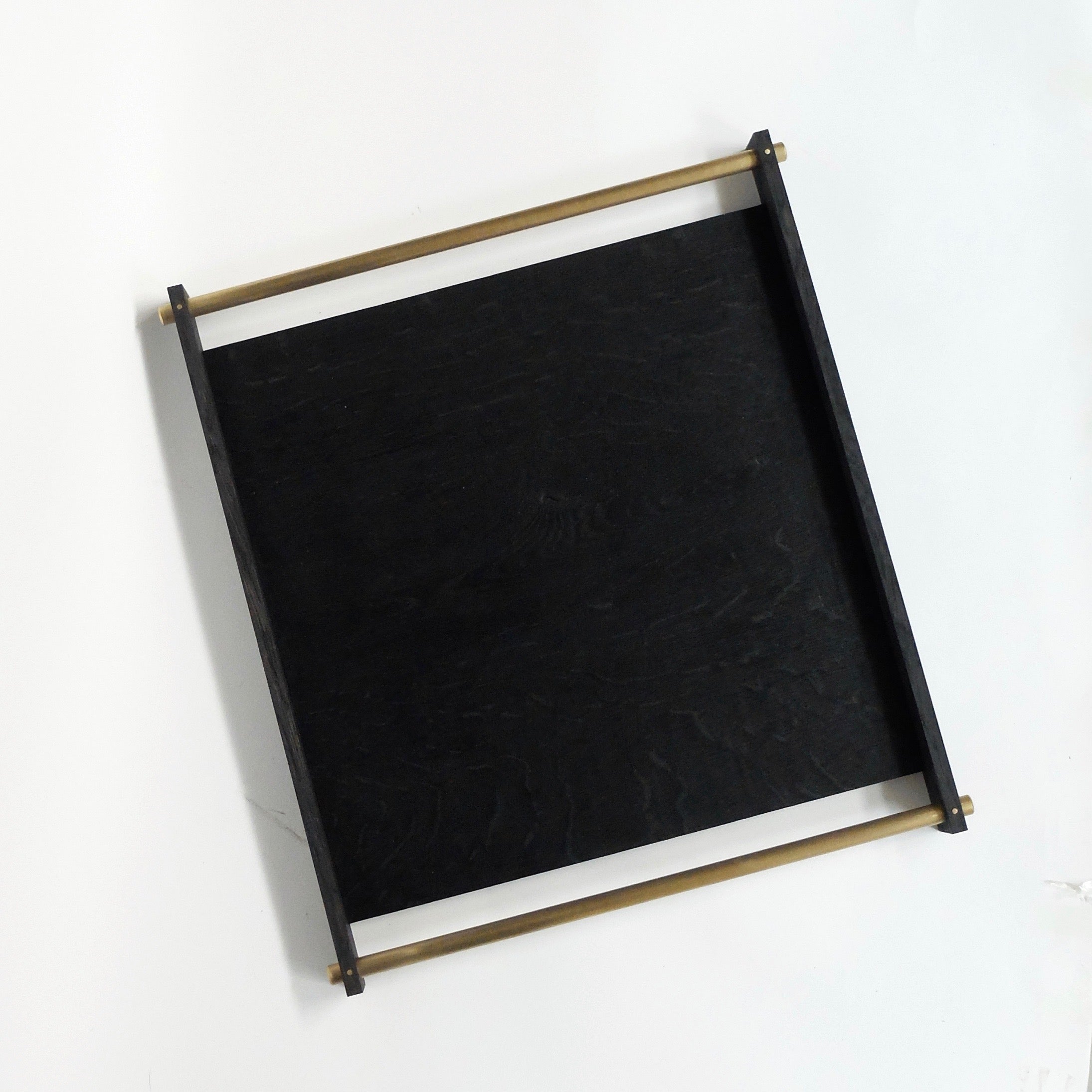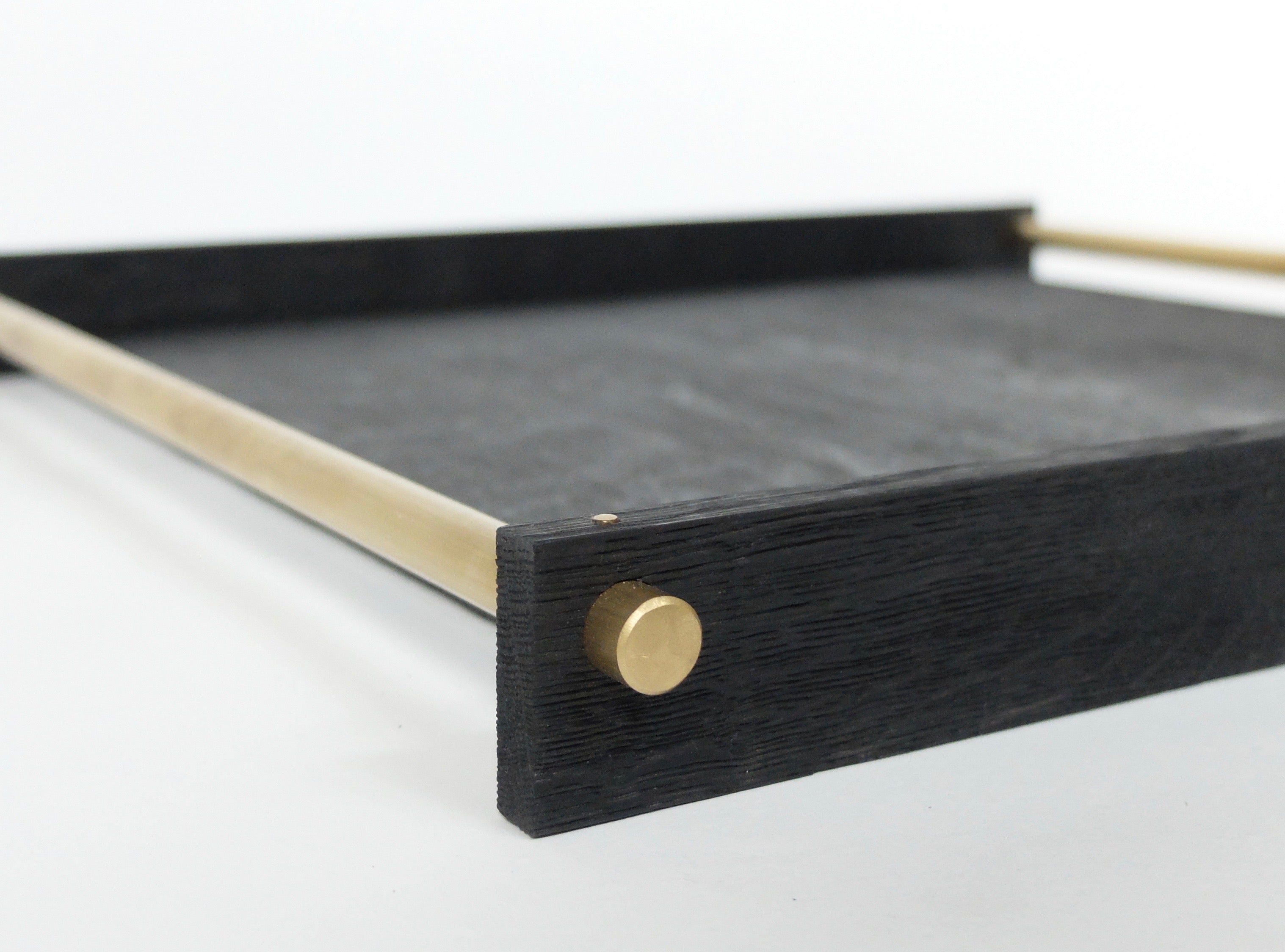 This ceremonious piece balances the line between the sculptural and the functional; an altar on which to serve tea, a platform to display treasured objects, and a highly designed elegant artwork of its own right. The English oak has been burnt and charred, giving it its beautiful rich dark colour, highlighting the grain and texture of the woods surface. The addition of the simple yet beautifully contrasting golden coloured, clyndrical brass handles seem to lead to a meeting of the ancient and the modern that elevate this piece's sophisticated beauty.