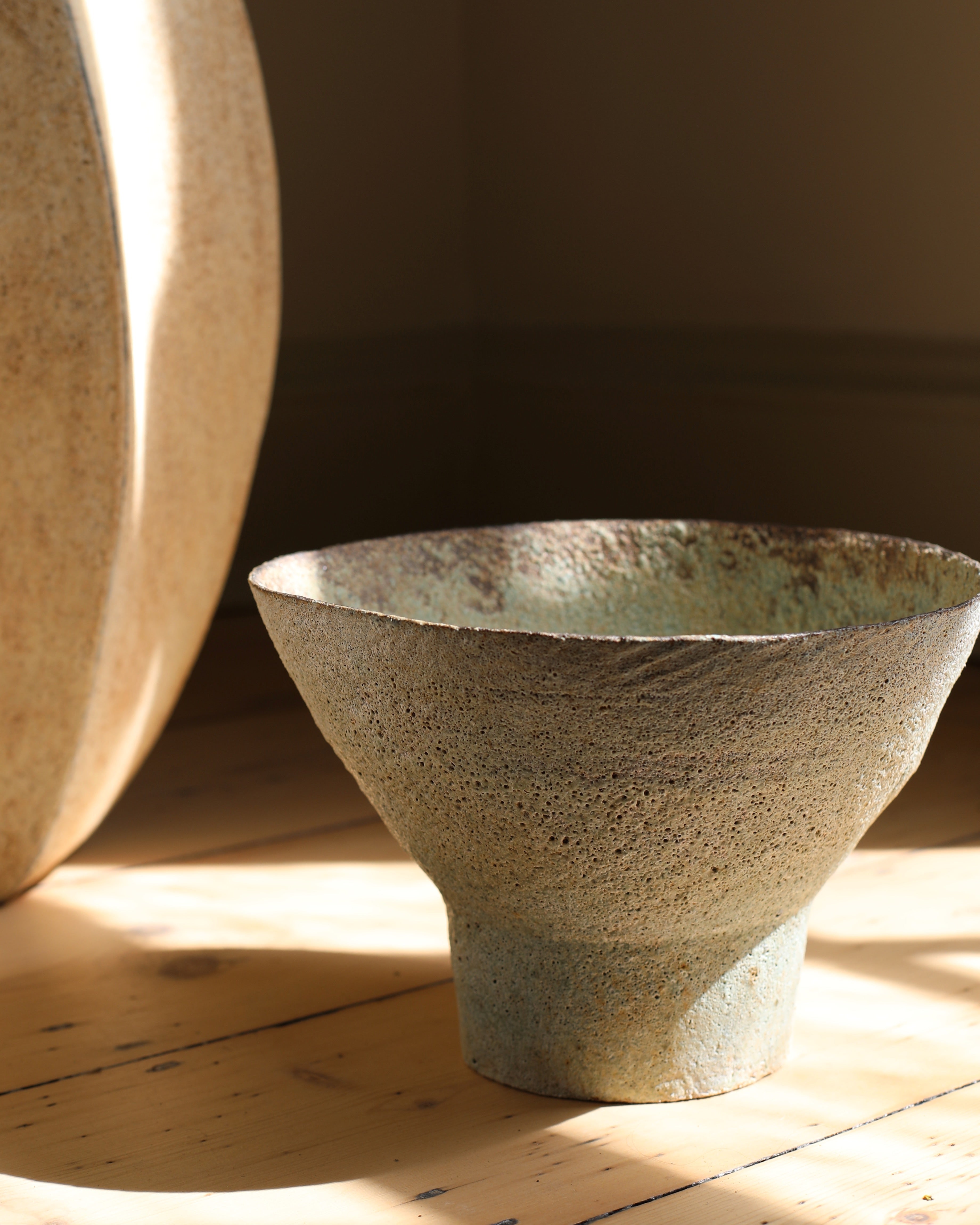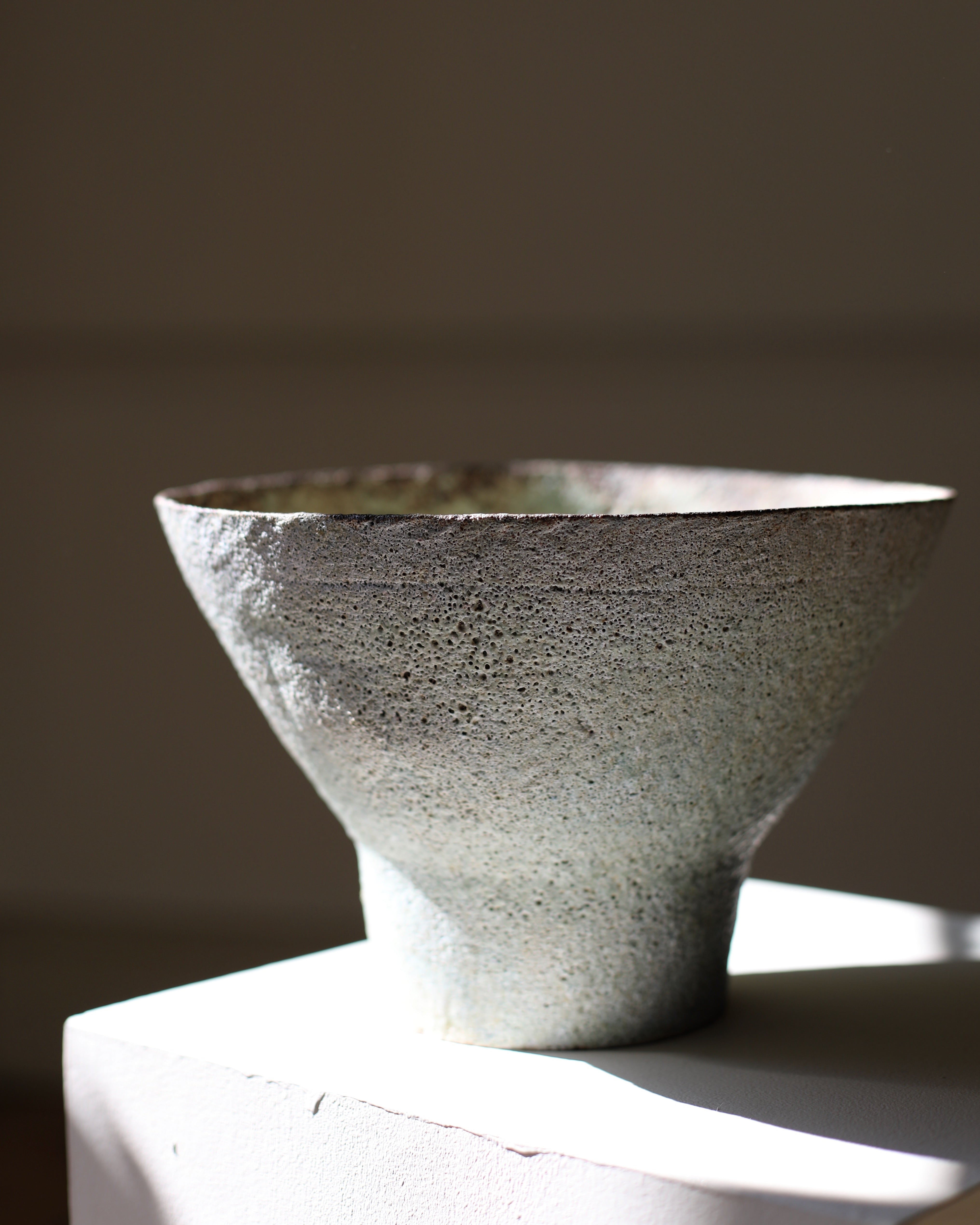 The textured surface and understated colour of the vessel embody a serene and antiquarian quality conveying Philp’s interest in ancient culture, oriental art, geology and the natural world.