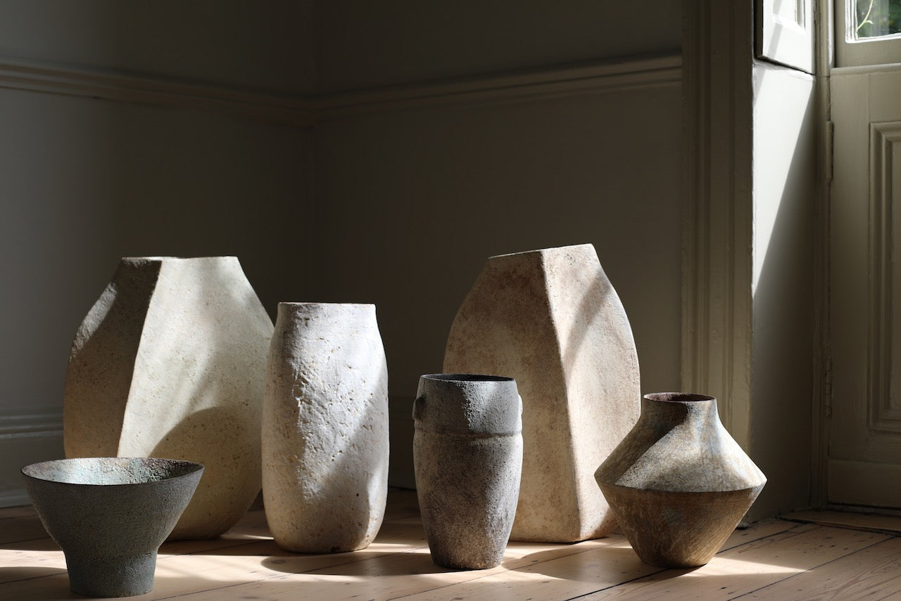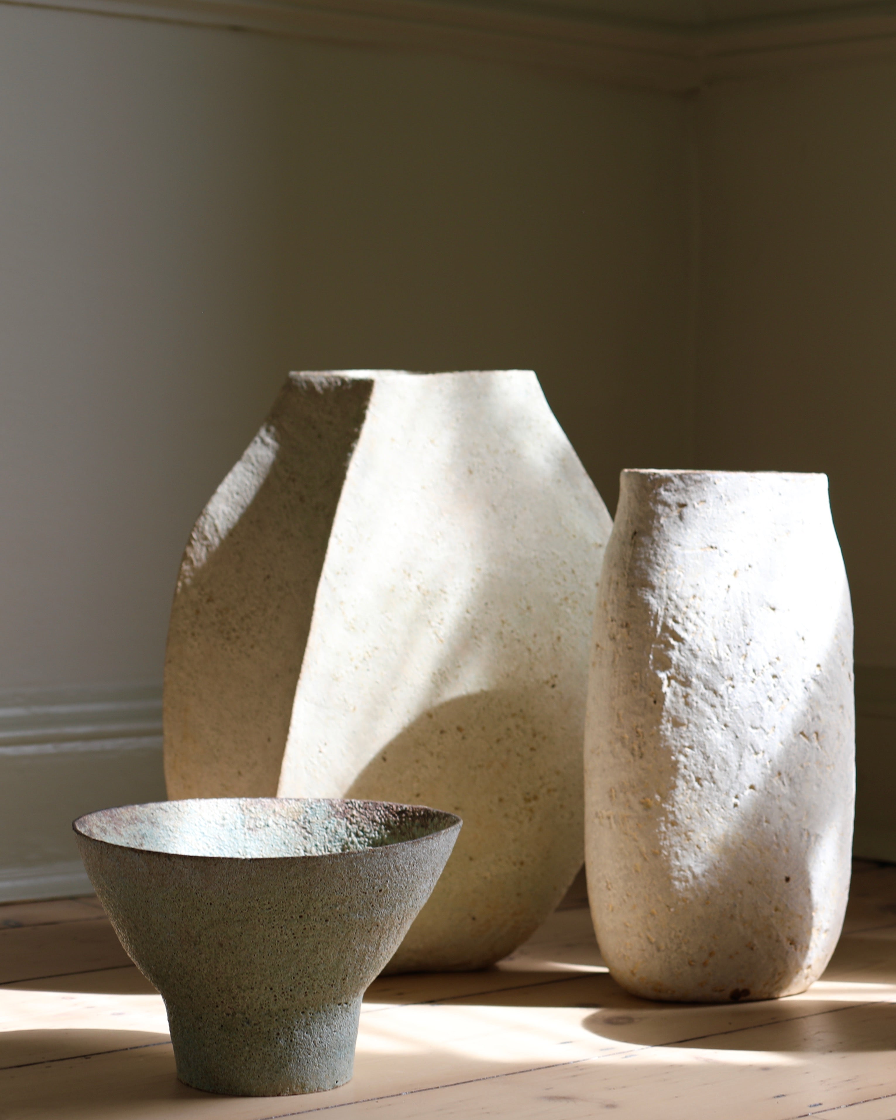 Paul has been working with clay for over forty years and over that time has experimented with a variety of materials and techniques, some of which have never been tried before. This has resulted in equal measures of delight and frustration as some attempts work and others fail. It’s not an easy task especially as each of his pieces face, what he calls an “unknown future”, as various “breakdowns” (unpredictable cracks and fissures) occur as they are fired multiple times in the kiln. However, this is all part of Paul Philp’s unique creative process. It’s very important to him that each of his pieces develop into something that have their own individual character and identity. He wants them to have a life beyond him and soon after he starts to create them, they should continue on a journey of their own. We are attracted to this idea and hope that as owners and inheritors of his pieces that they will continue their journey in our own homes and beyond.