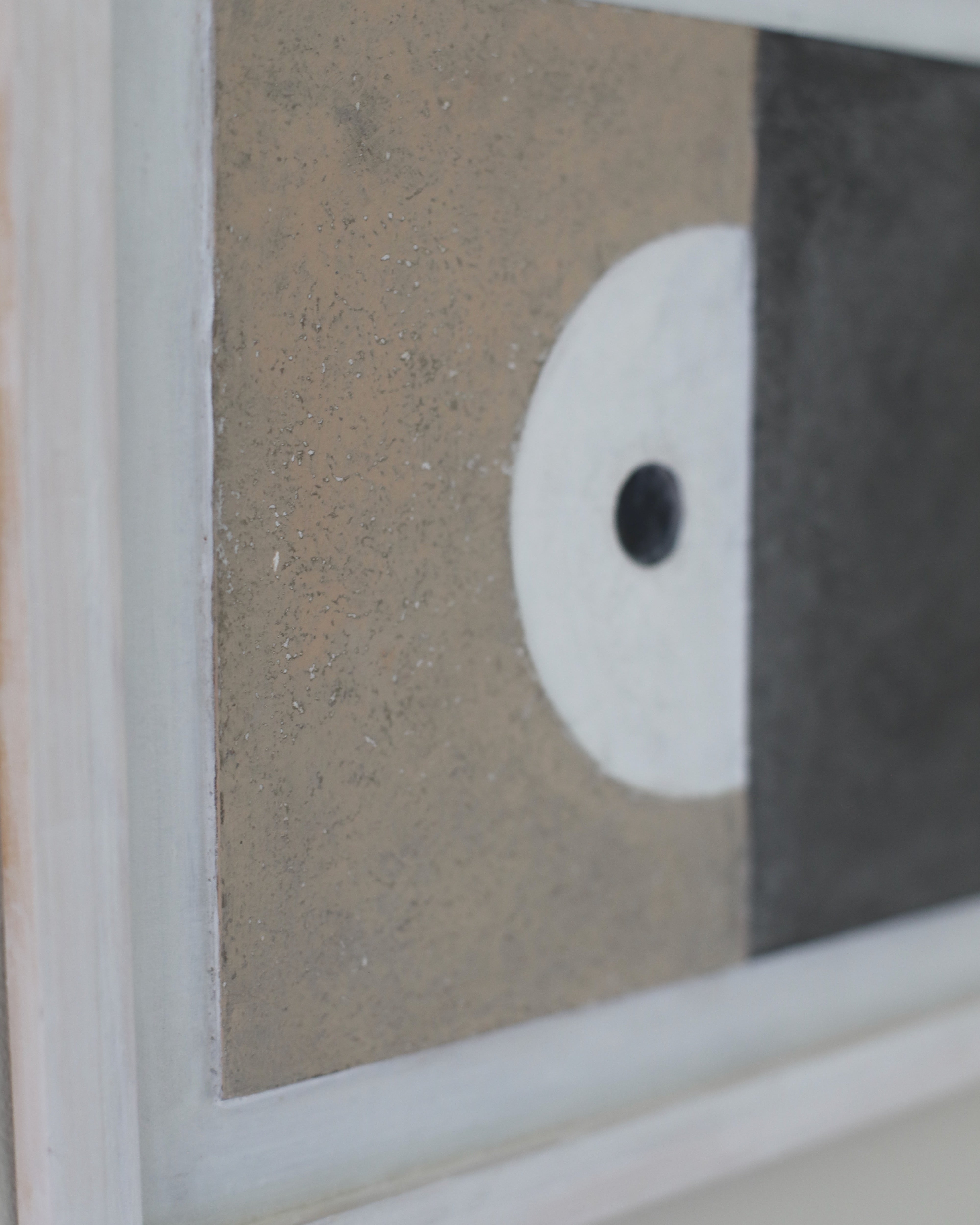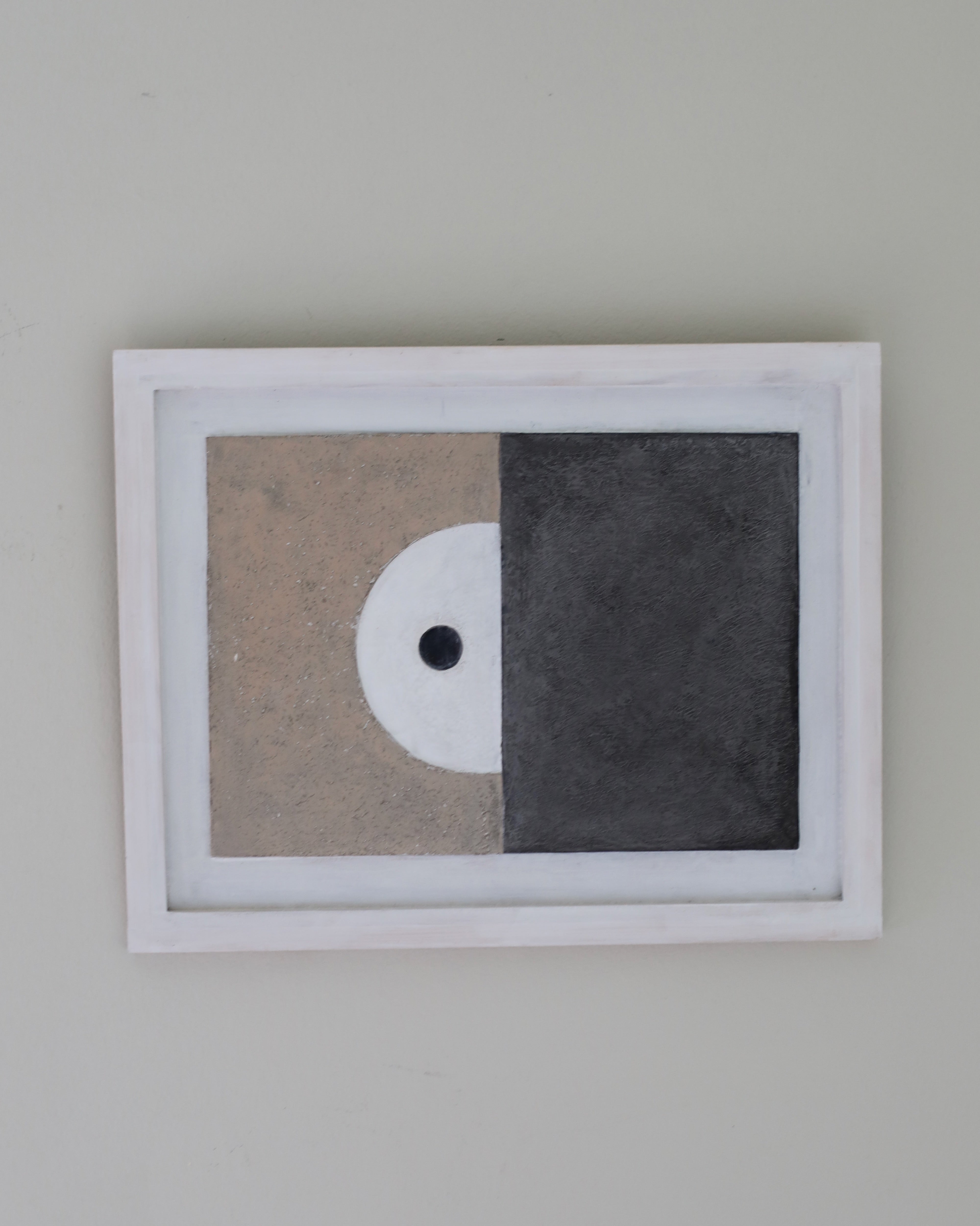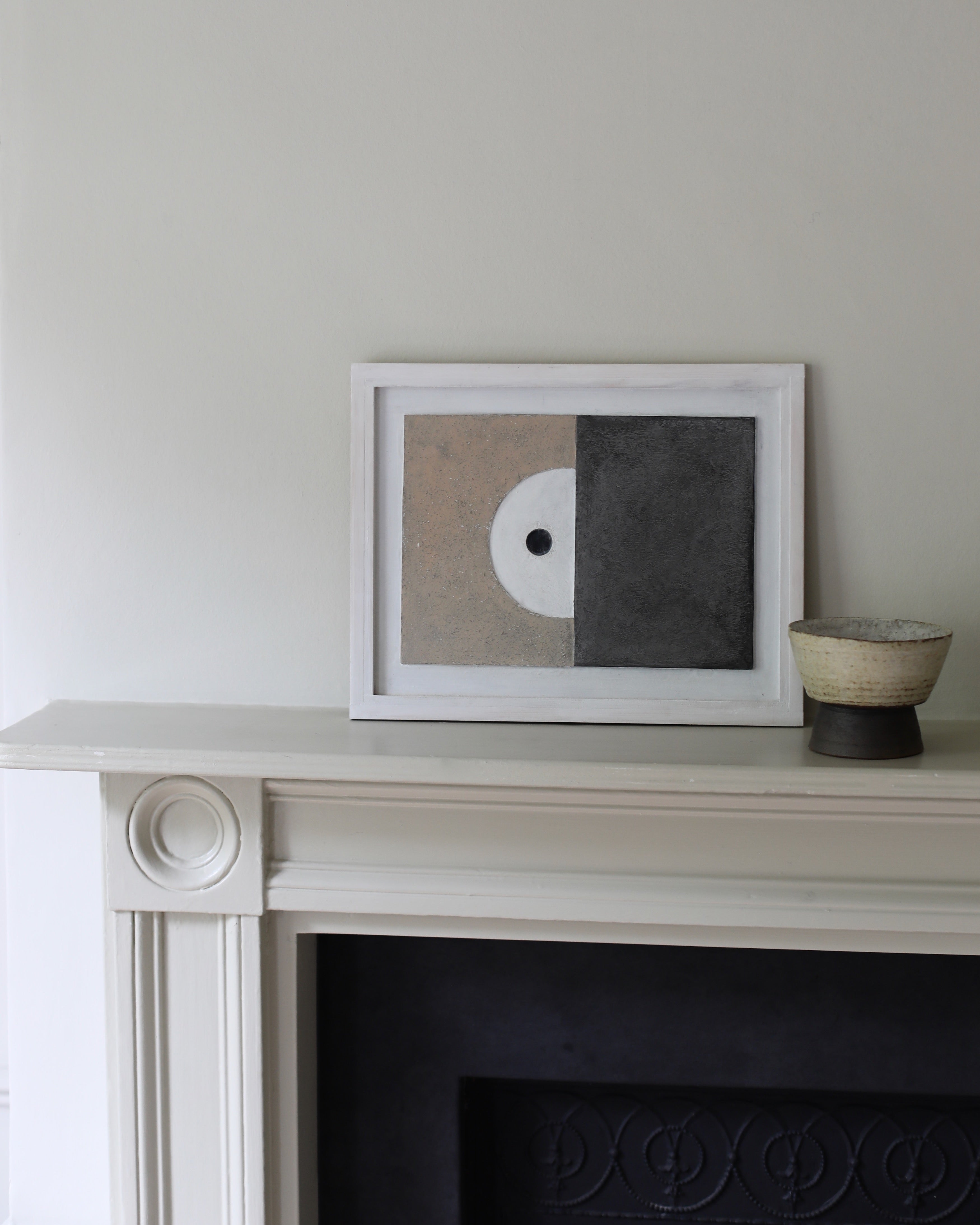 With a gritty texture, Philp’s charming piece uses organic materials to form a sculptural composition placed on board. The central composition is placed raised on a white clay painted wooden board, giving a relief sculptural feel, with the edge of the board raised to create framing. Making use of a neutral palette, the central composition brings together geometric forms to create harmonious balance. The piece is divided into two halves, with the right side taking on a striking charcoal that shows off a textural surface, presenting shifts in tones and shadow. The left side uses a natural beige hue, with a similarly tactile feel, bringing in grey tones to emphasise the textural quality. Divided by the centre, a half white circle cuts into the beige hue bringing a juxtaposing smooth feel and curvature. A single black circle is carved into the white circle, creating another level of relief in the sculptural composition. Philp’s palette of earthy hues grounds his works and forms a connection to the earth and natural world. This neutrality alongside the simplicity of form brings an understated elegance that emits a feel of tranquillity.