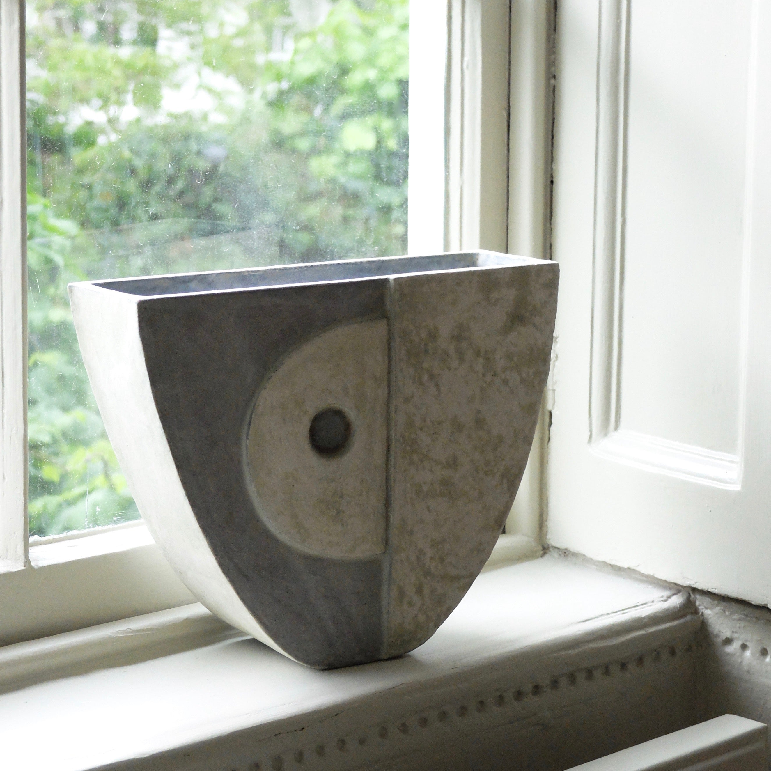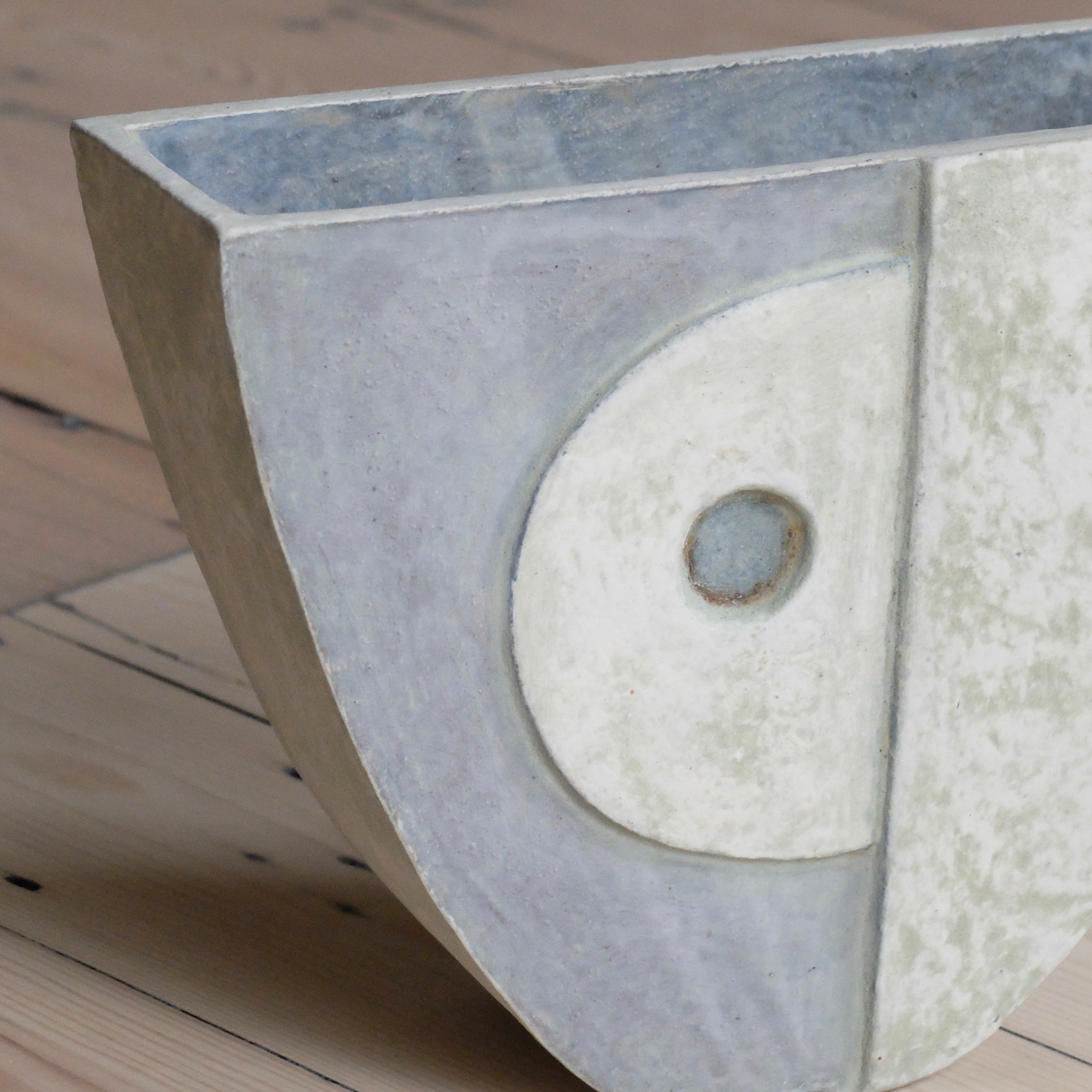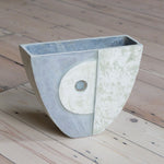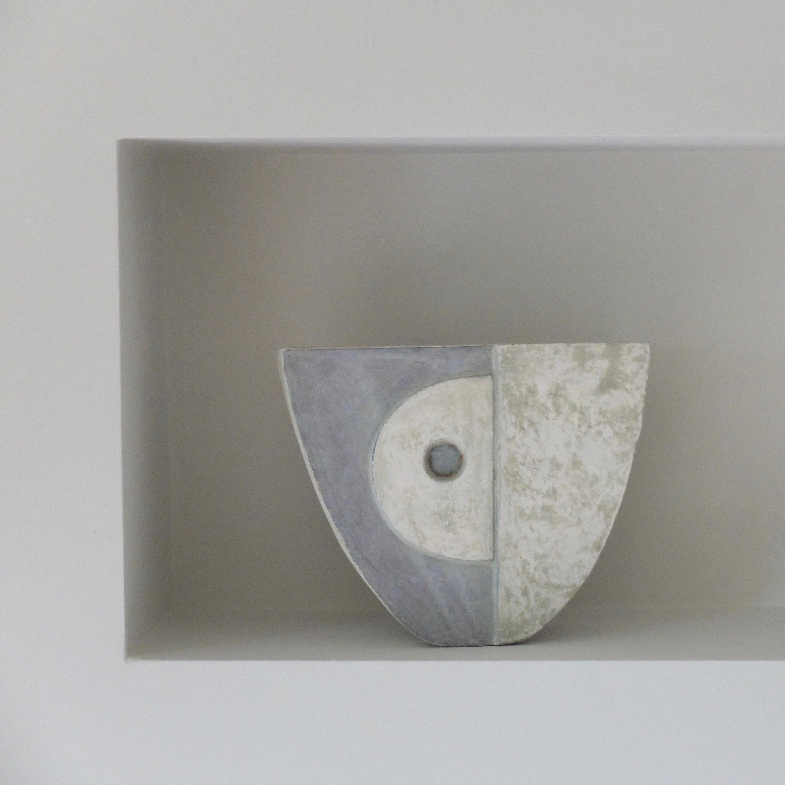 This piece has an intriguing shape and a distinct quality that reflects Philp's practice and echo’s his historical references. Experimenting with tin oxide and crude iron enables him to pay careful attention to colour and tone. The gritty surface of this piece is perfectly combined with icy tones and subtly textured, blue hues on the exterior. The vessels have two beautifully painted sides that mirror one another yet each hold a different tone, adding to the enticing charm of Philp's formations. Exhibited publicly for the first time, his exploratory relief carving expresses his grounding in tradition as well as his forward-thinking practice.