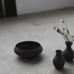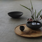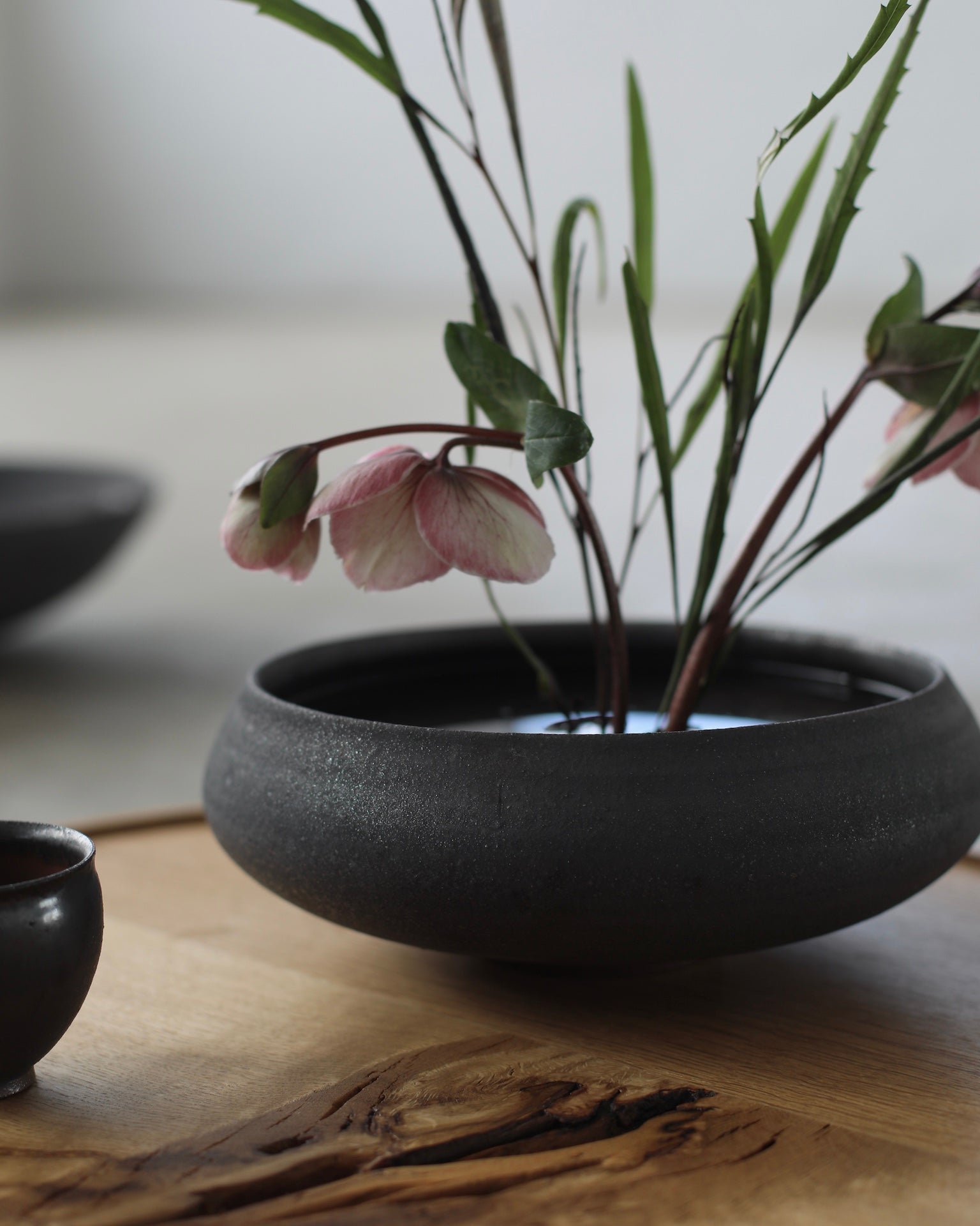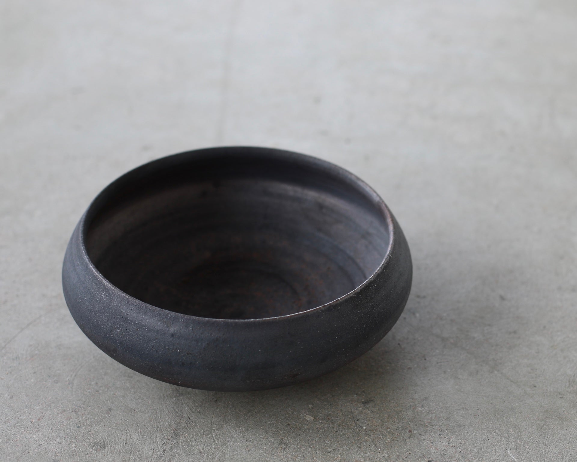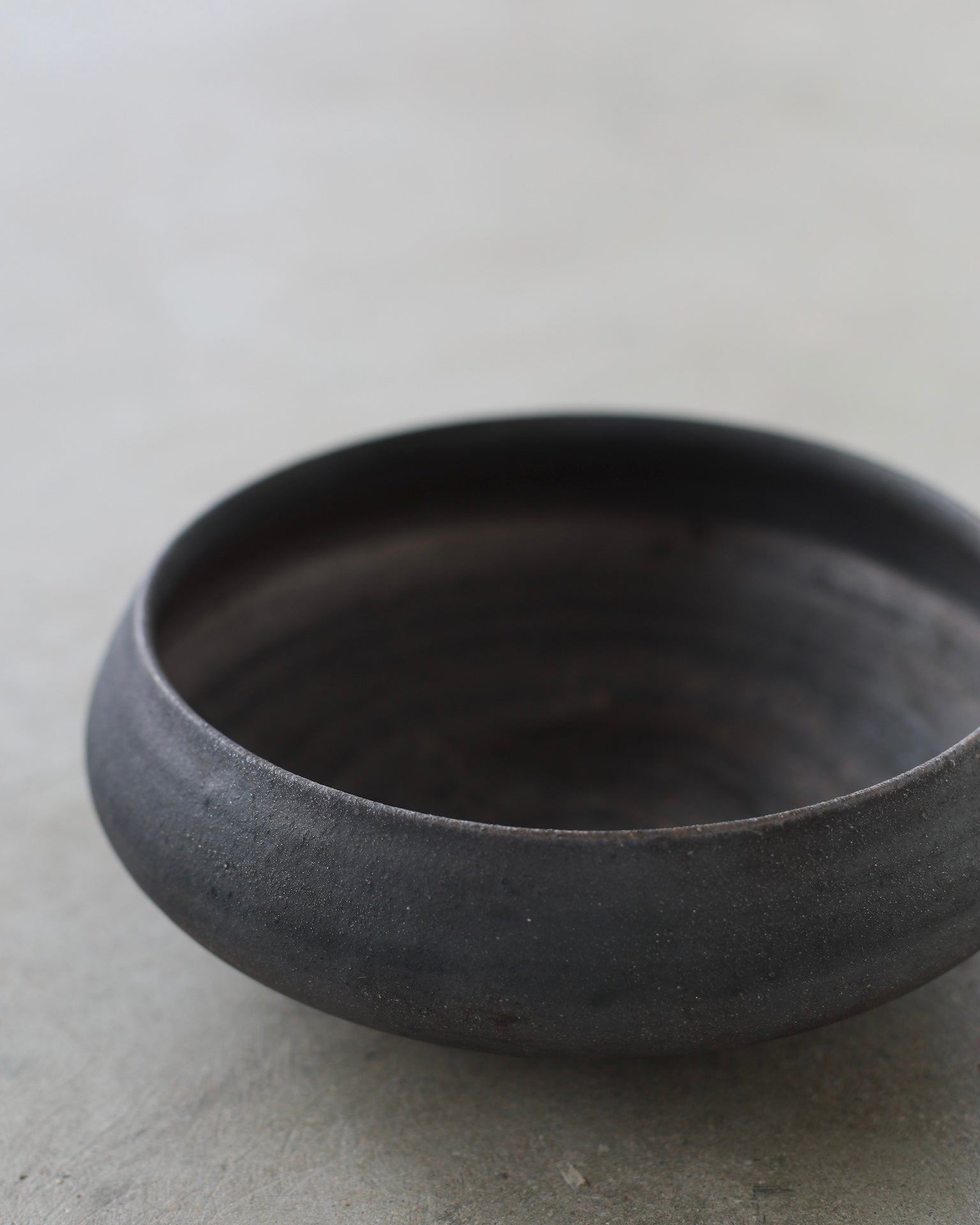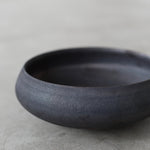 A wide, round bowl crafted from Anagama-fired Cornish stoneware, featuring an iron wash that enriches the surfac. The matte finish, in a sophisticated dark grey, is gently enhanced by metallic moments within the glaze, creating contemplative beauty within the piece.