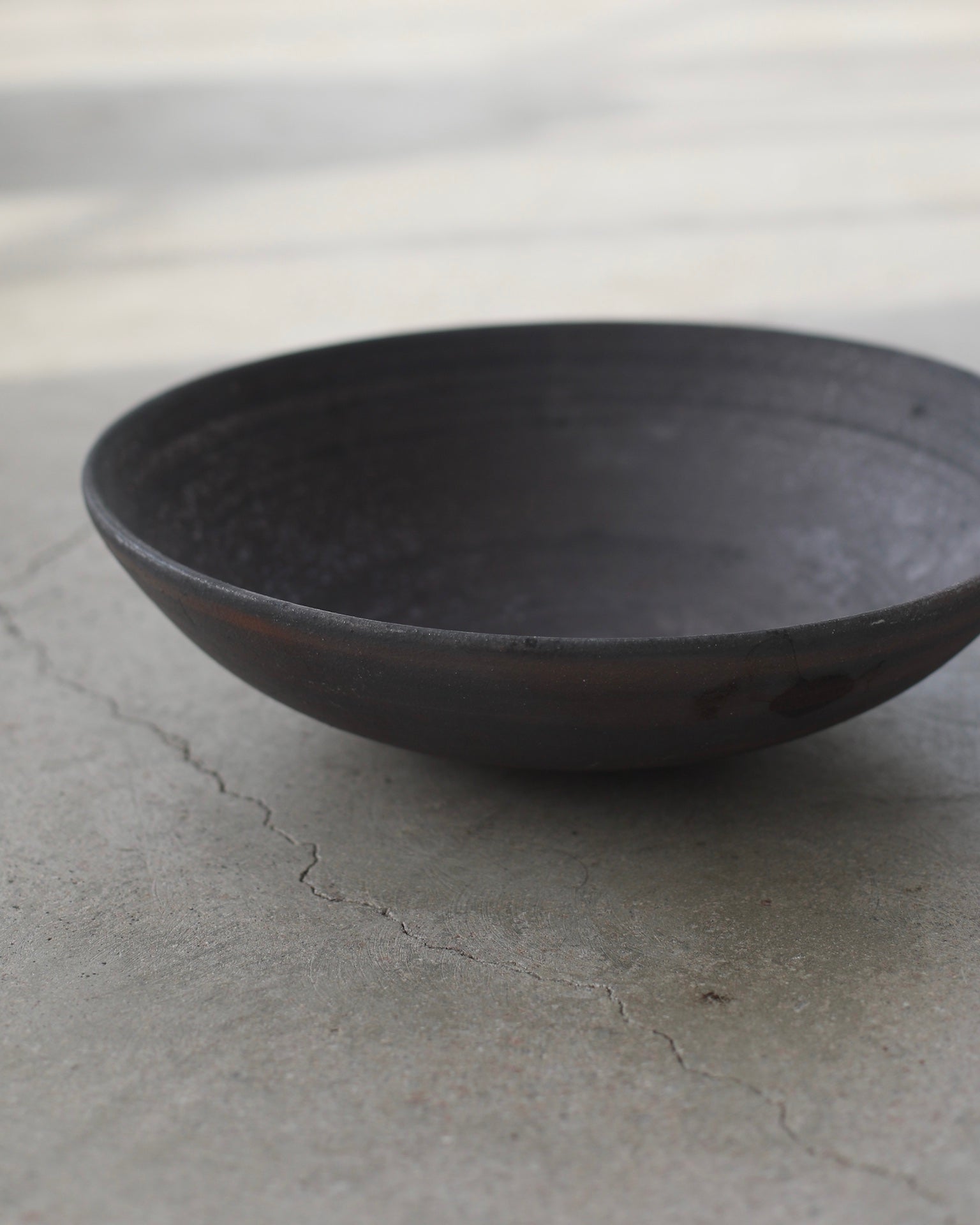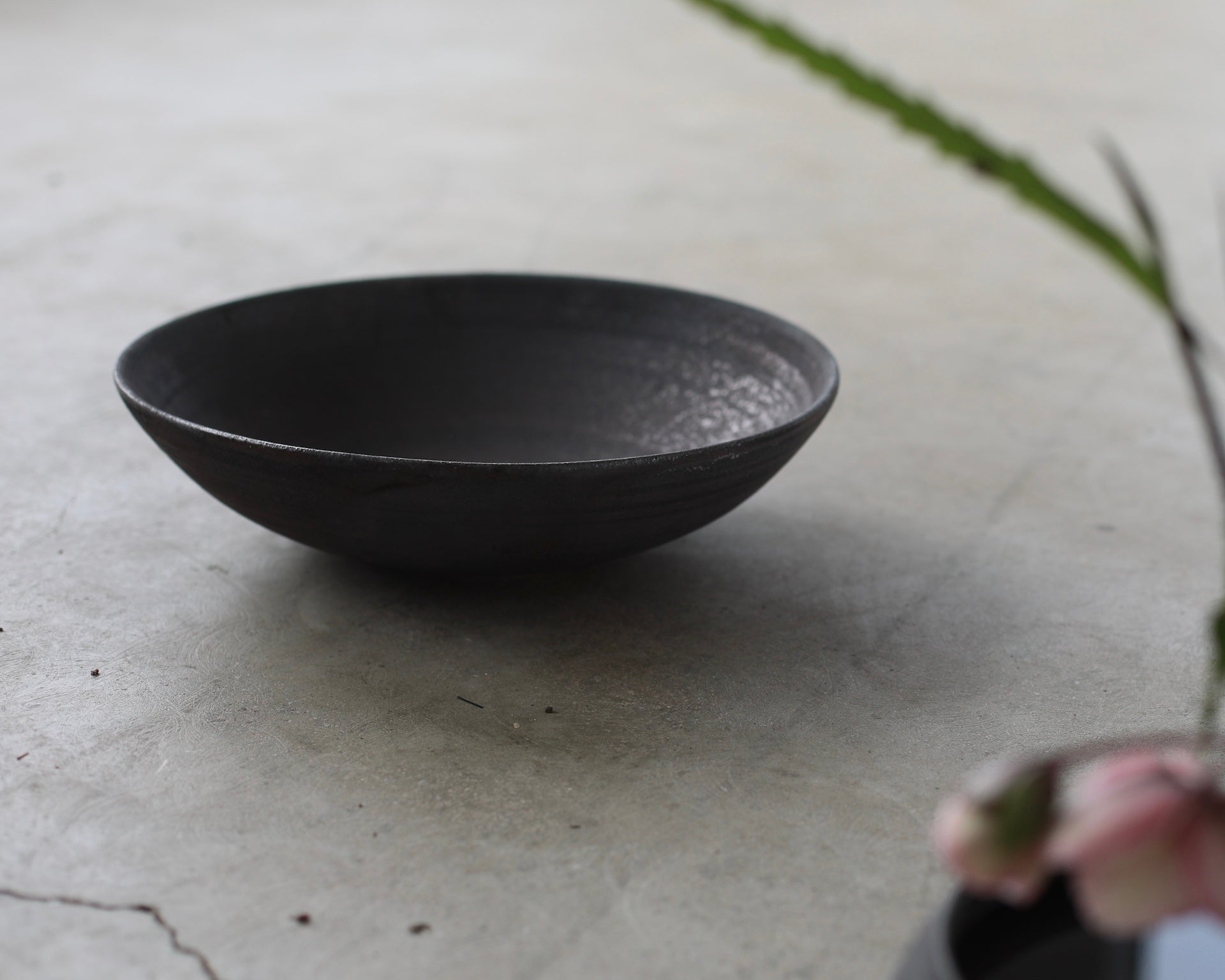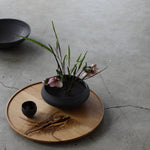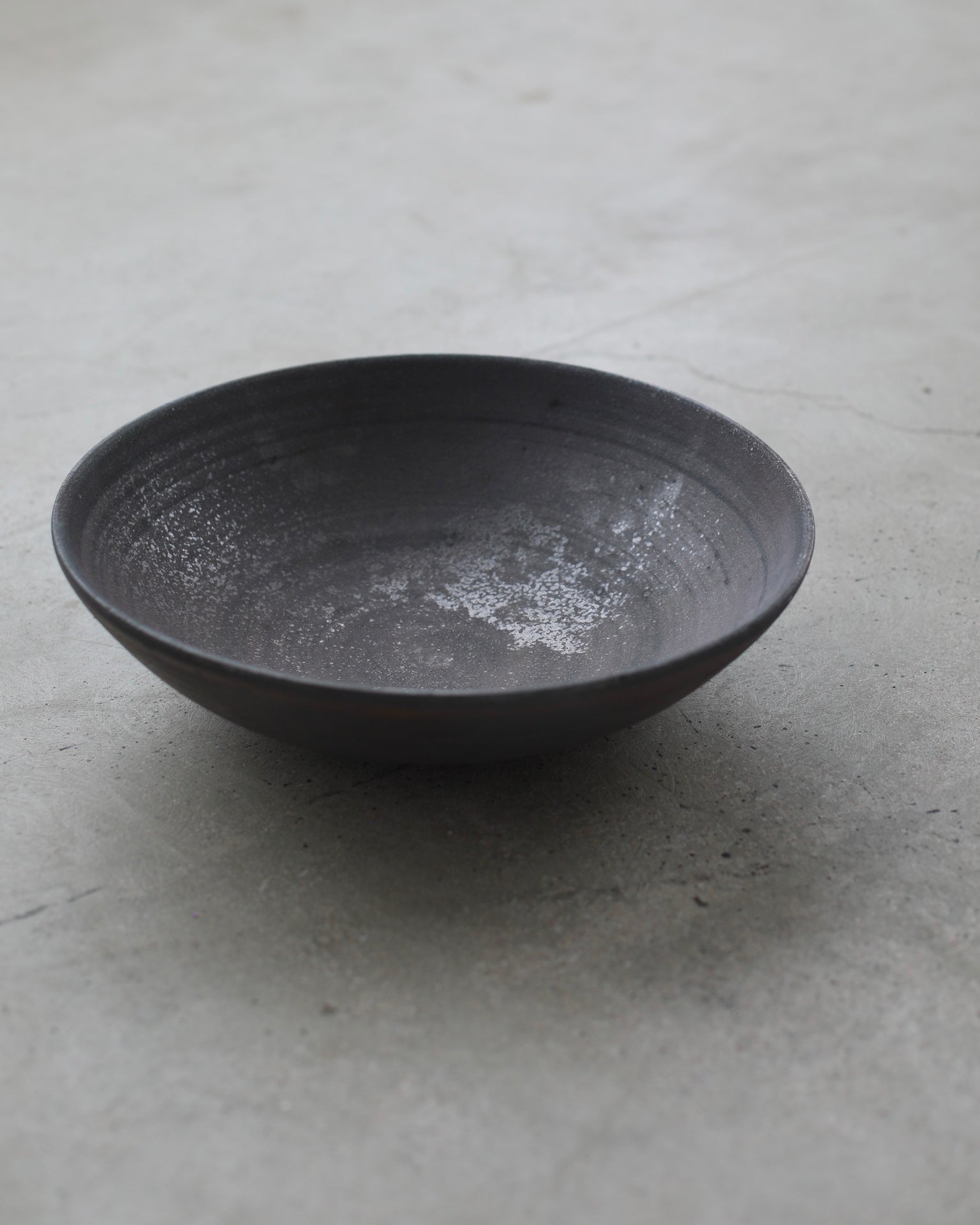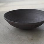 A wide, round bowl crafted from Anagama-fired Cornish stoneware, featuring an iron wash that enriches the surfac. The matte finish, in a sophisticated dark grey, is gently enhanced by metallic moments within the glaze, creating contemplative beauty within the piece.