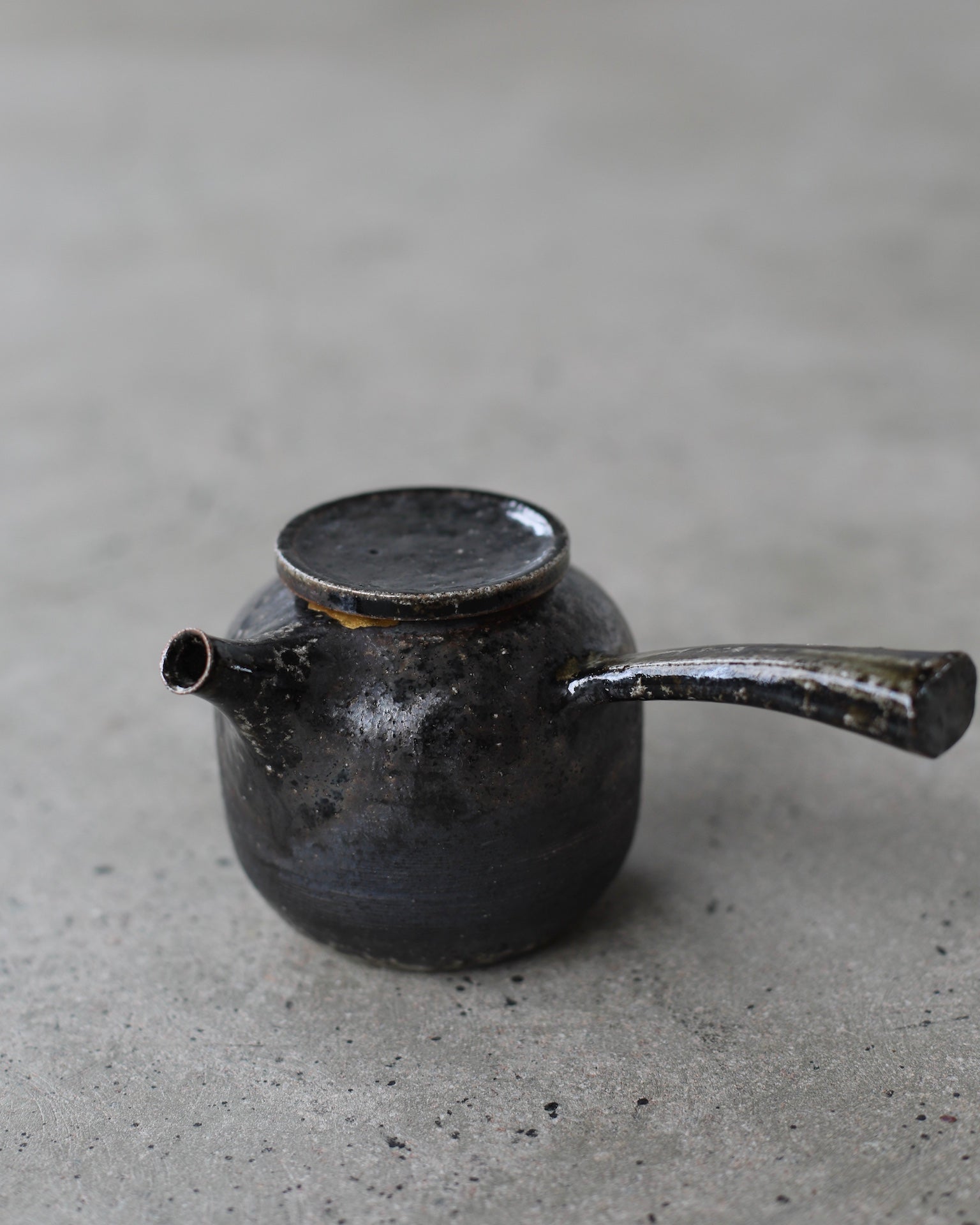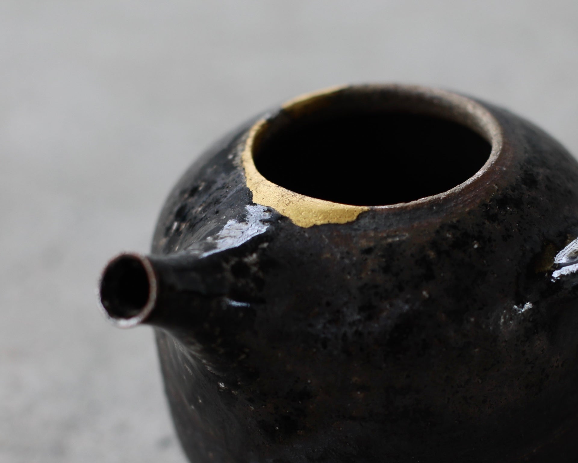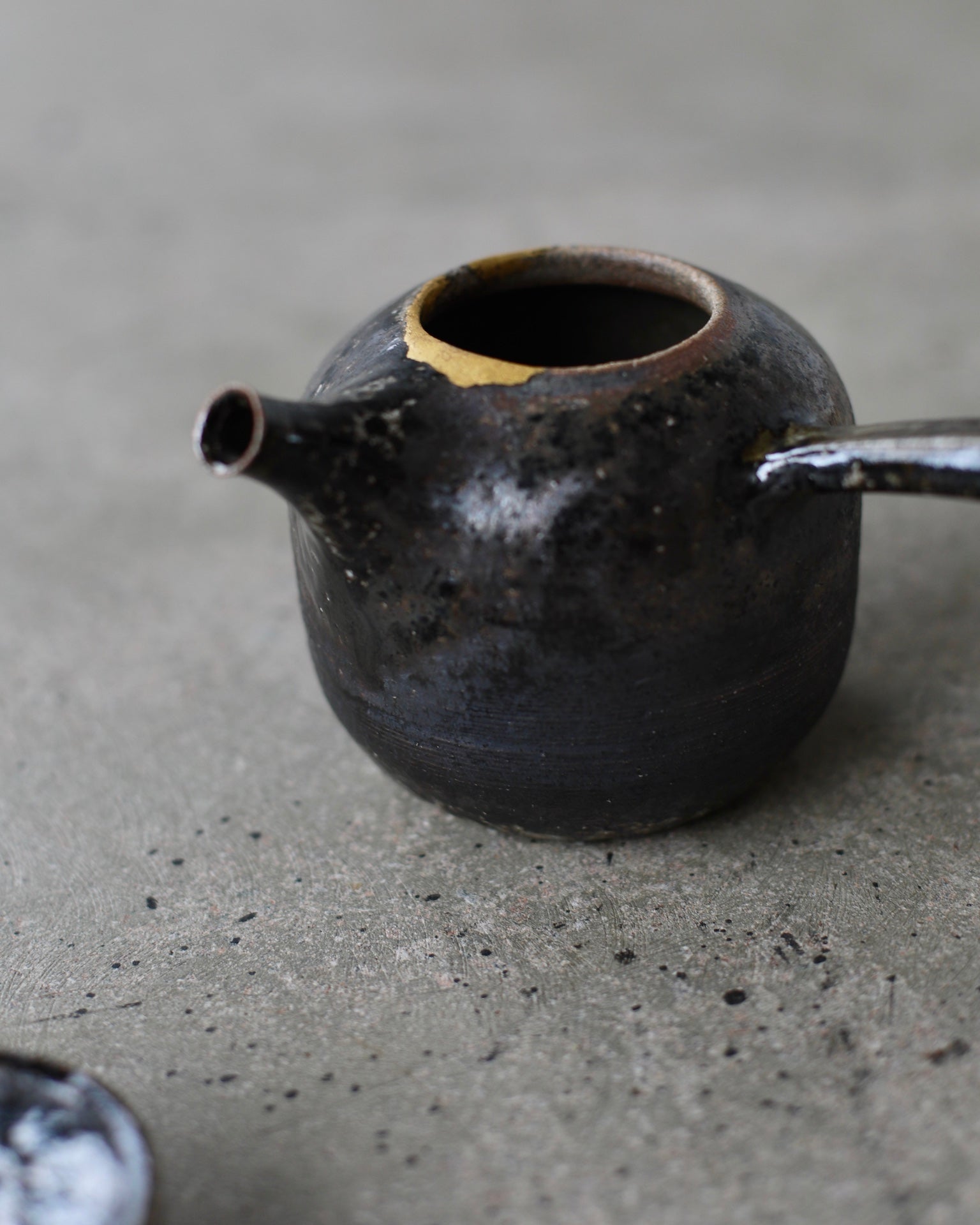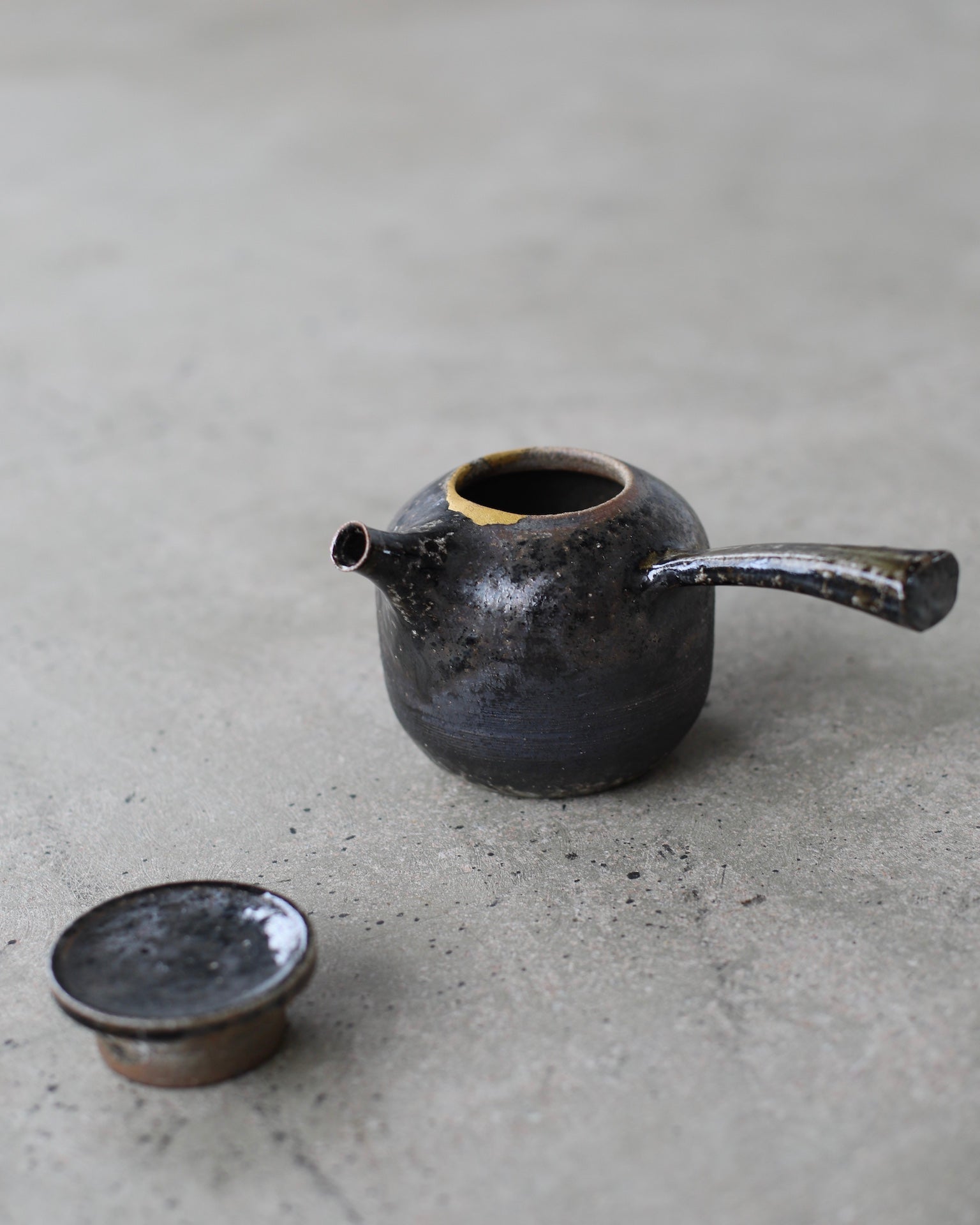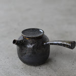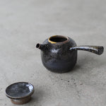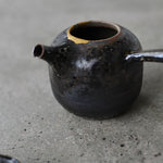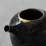 Crafted from Cornish stoneware, this teapot features an iron-wash exterior paired with a delicate celadon liner. A striking 24ct gold Kintsugi repair near the lid highlights the beauty of imperfection, adding a touch of elegance and craftsmanship. Wood-fired with soda, the teapot’s surface is enriched by subtle, natural textures. A long ceramic handle extends from the side, complementing the flat lid and short spout, creating a balanced and functional design that showcases both form and artistry.