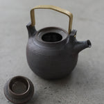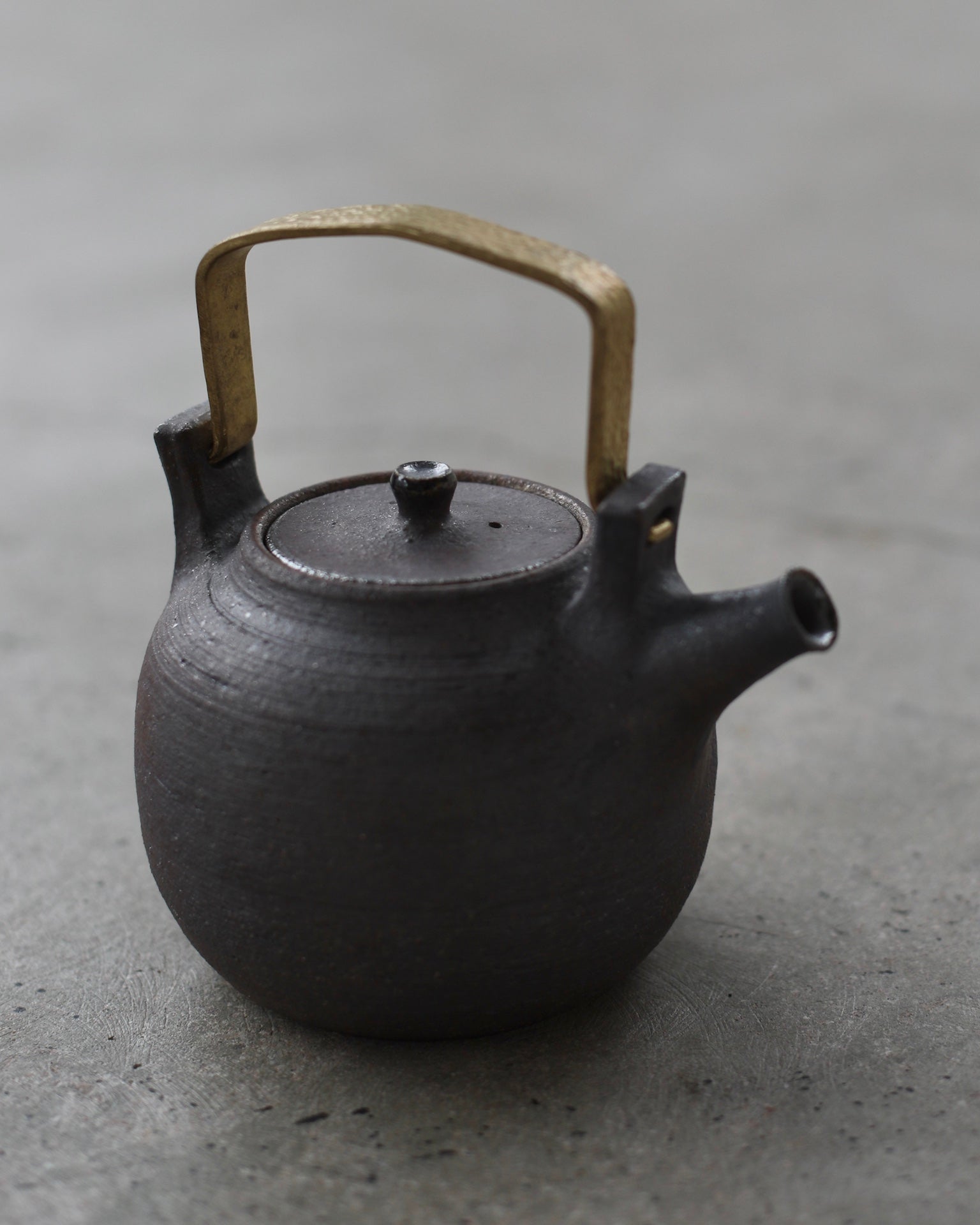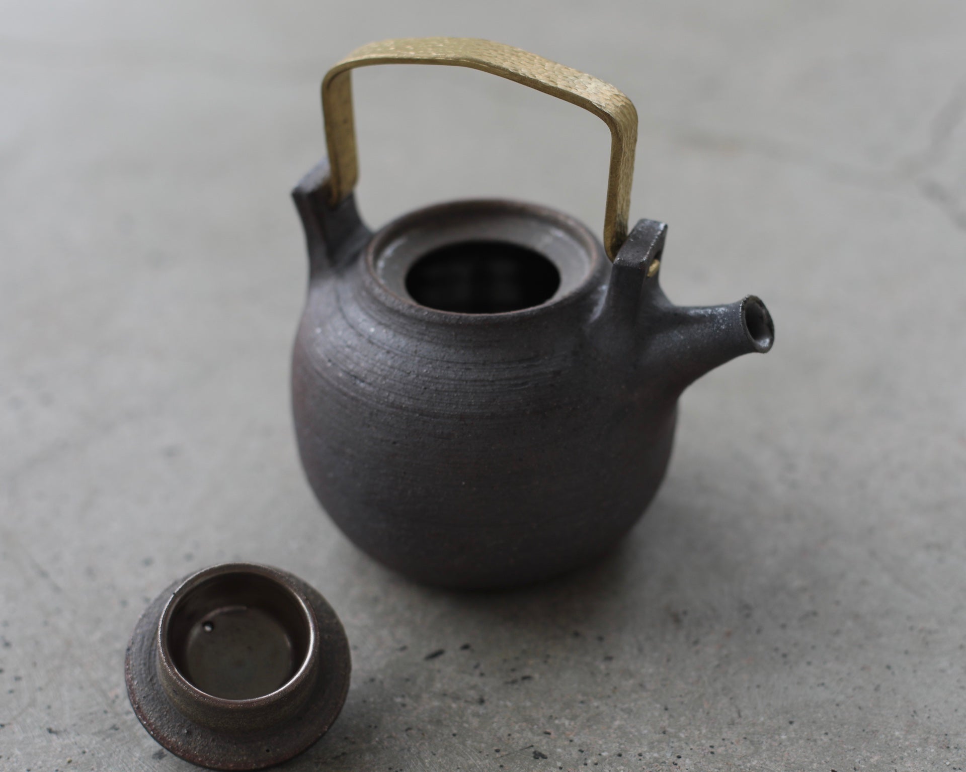 Crafted from Cornish stoneware, this teapot features an iron-wash exterior adorned with ash deposits, creating a textured surface with a subtle depth. Inside, a dark Shino liner provides a rich contrast. The teapot is complemented by a brass handle, adding an elegant touch to its natural, earthy aesthetic. The piece radiates timeless charm and craftsmanship, perfect for both function and display.