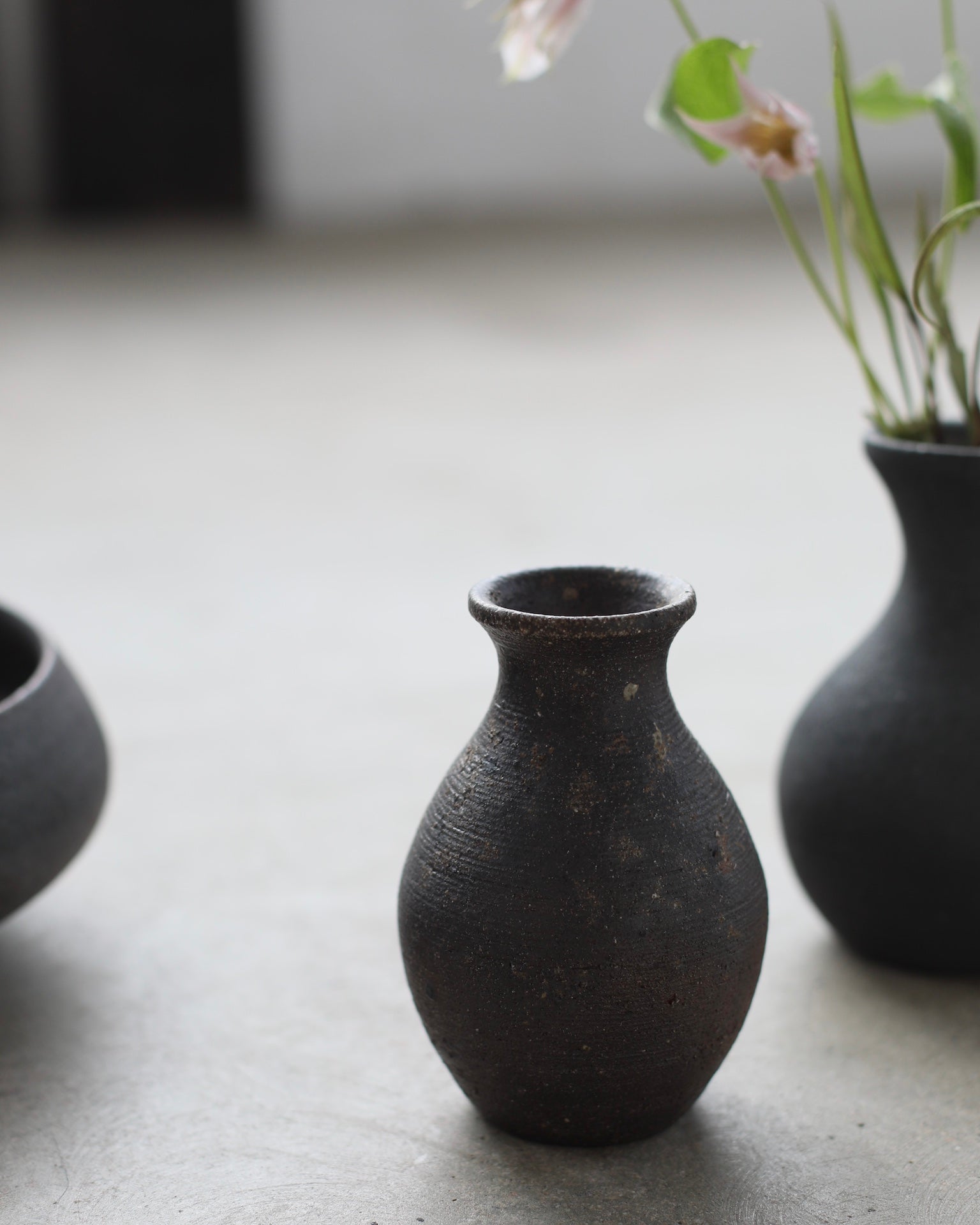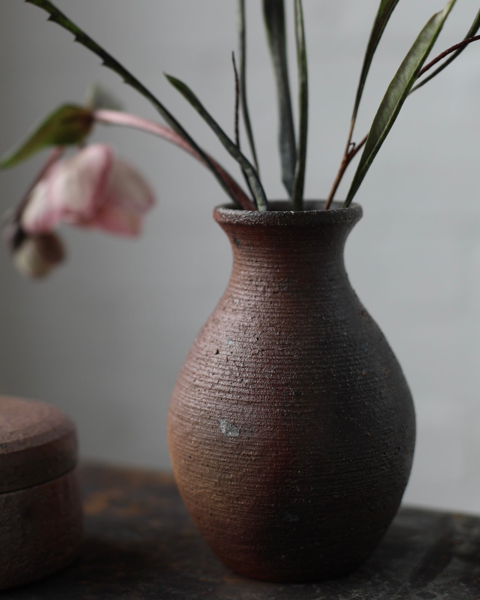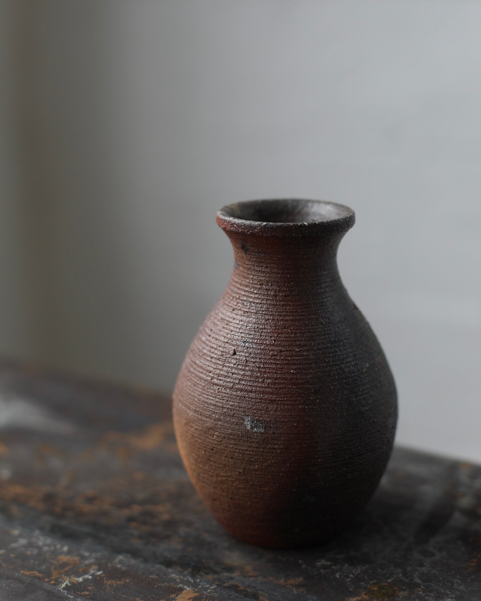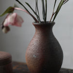 Crafted from unglazed Cornish stoneware and fired in the traditional Anagama kiln, this round vase evokes a subtle hourglass shape. The surface is a rich, deep earthy tone, embodying the natural beauty of the clay. Faint lines, visible from the turning process on the wheel, add a sense of intimacy and process to the piece.