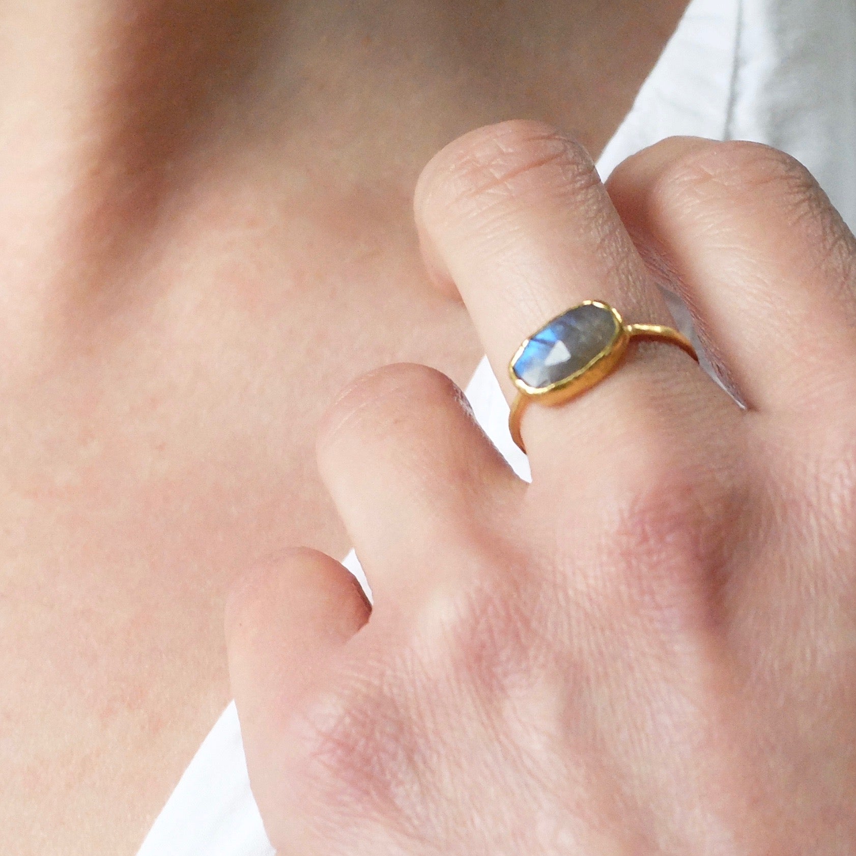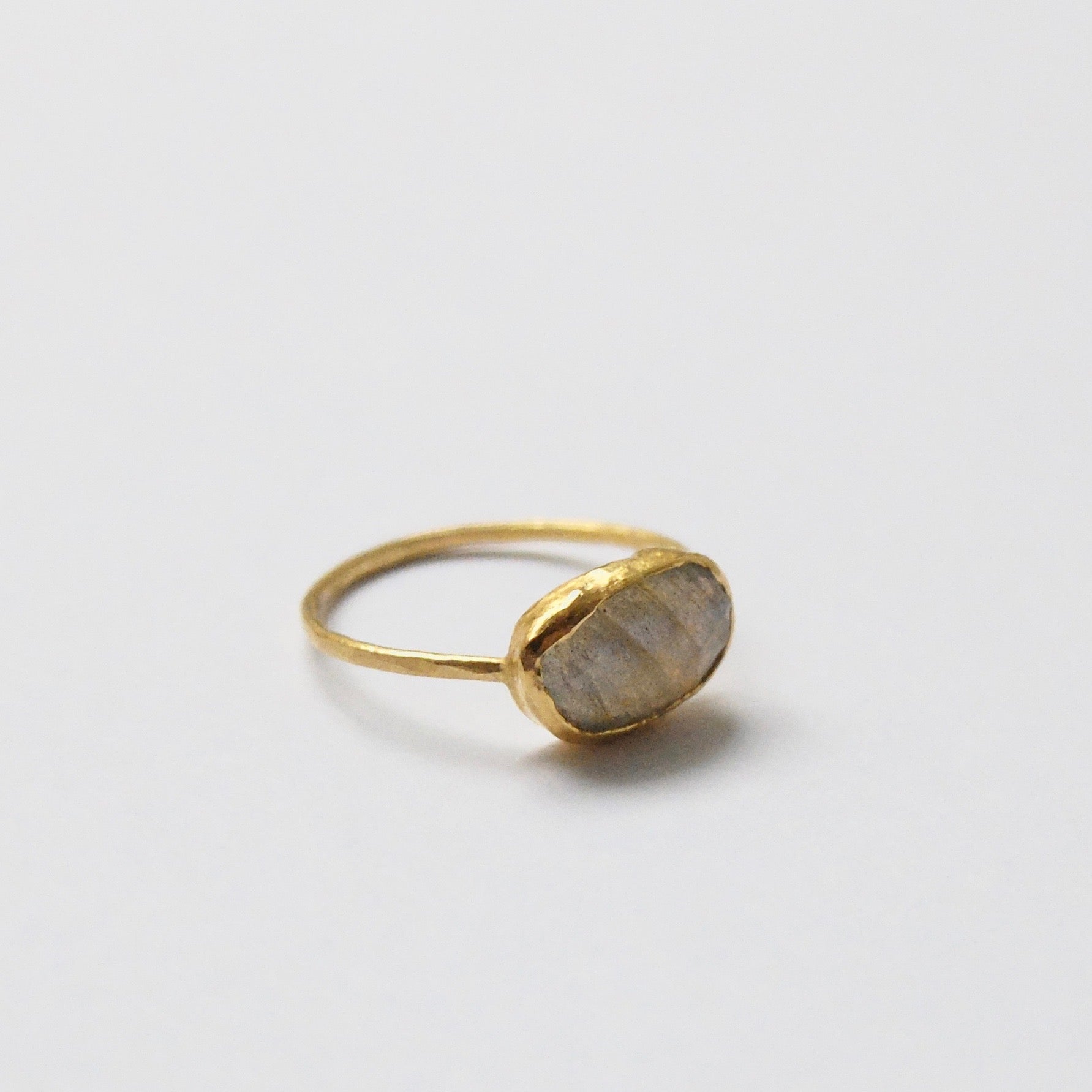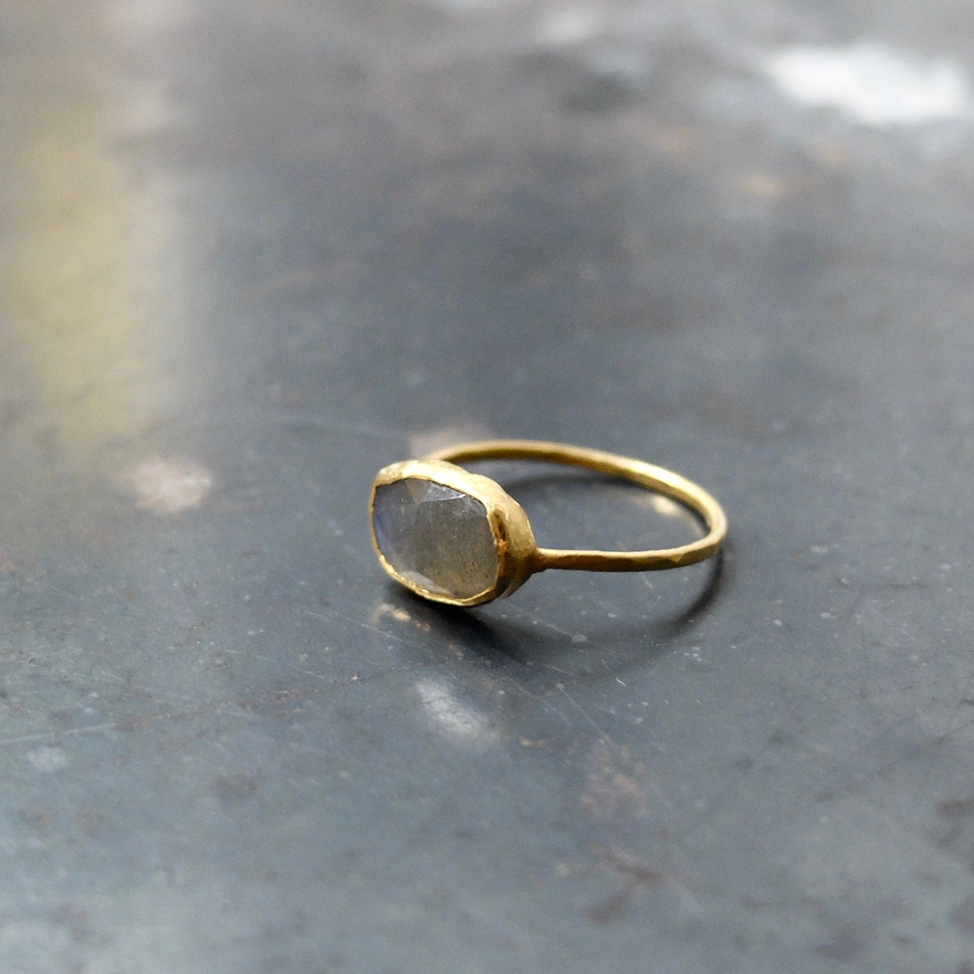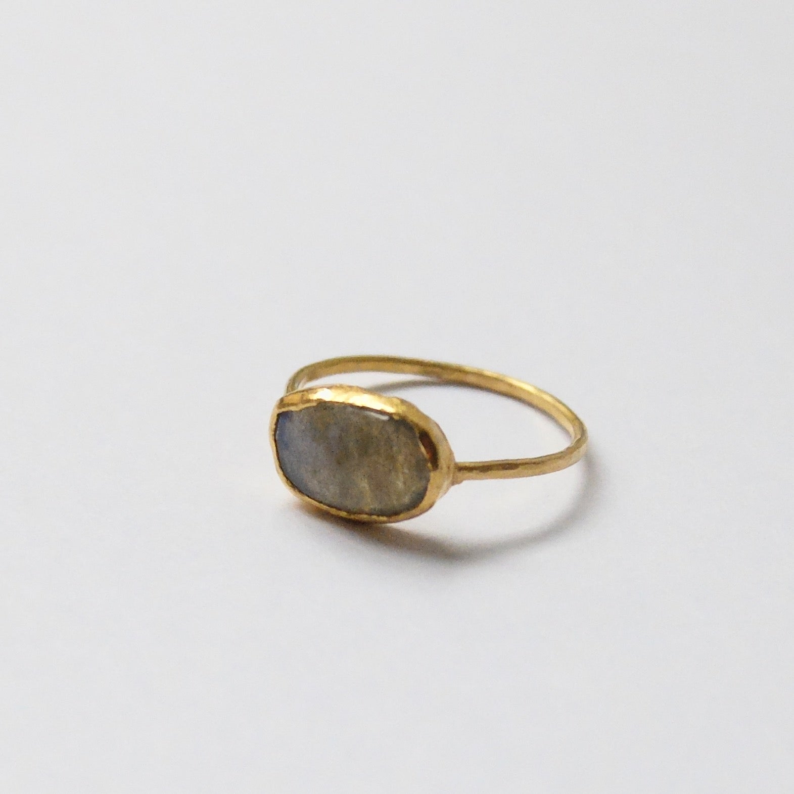 Exquisite Labradorite jewel set into a 22ct ring. Ram Rijal's hammered-gold creations are inspired by the precious stones he works with. His pieces are unique in their rough, organic yet refined, appearance which attests to their hand-made nature.