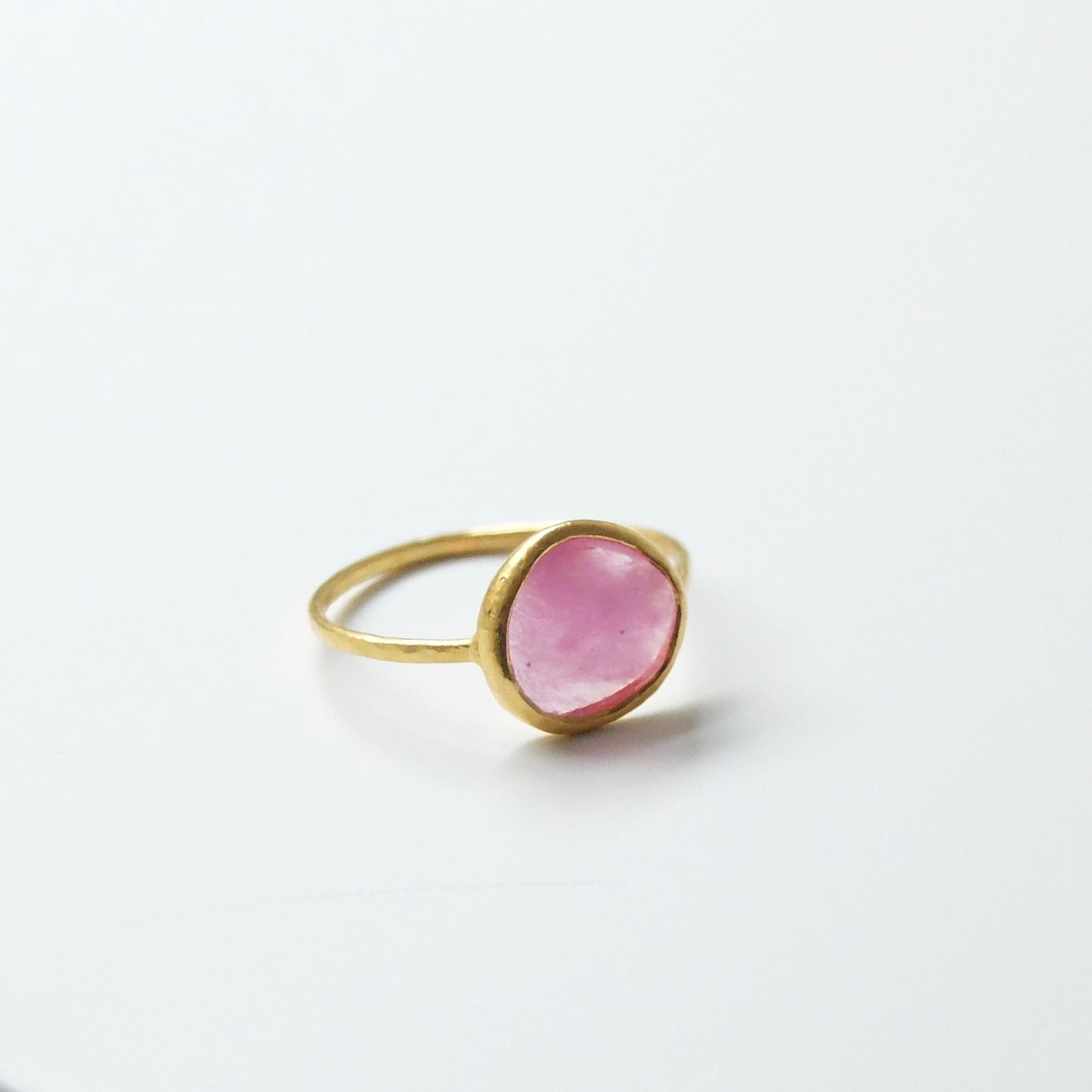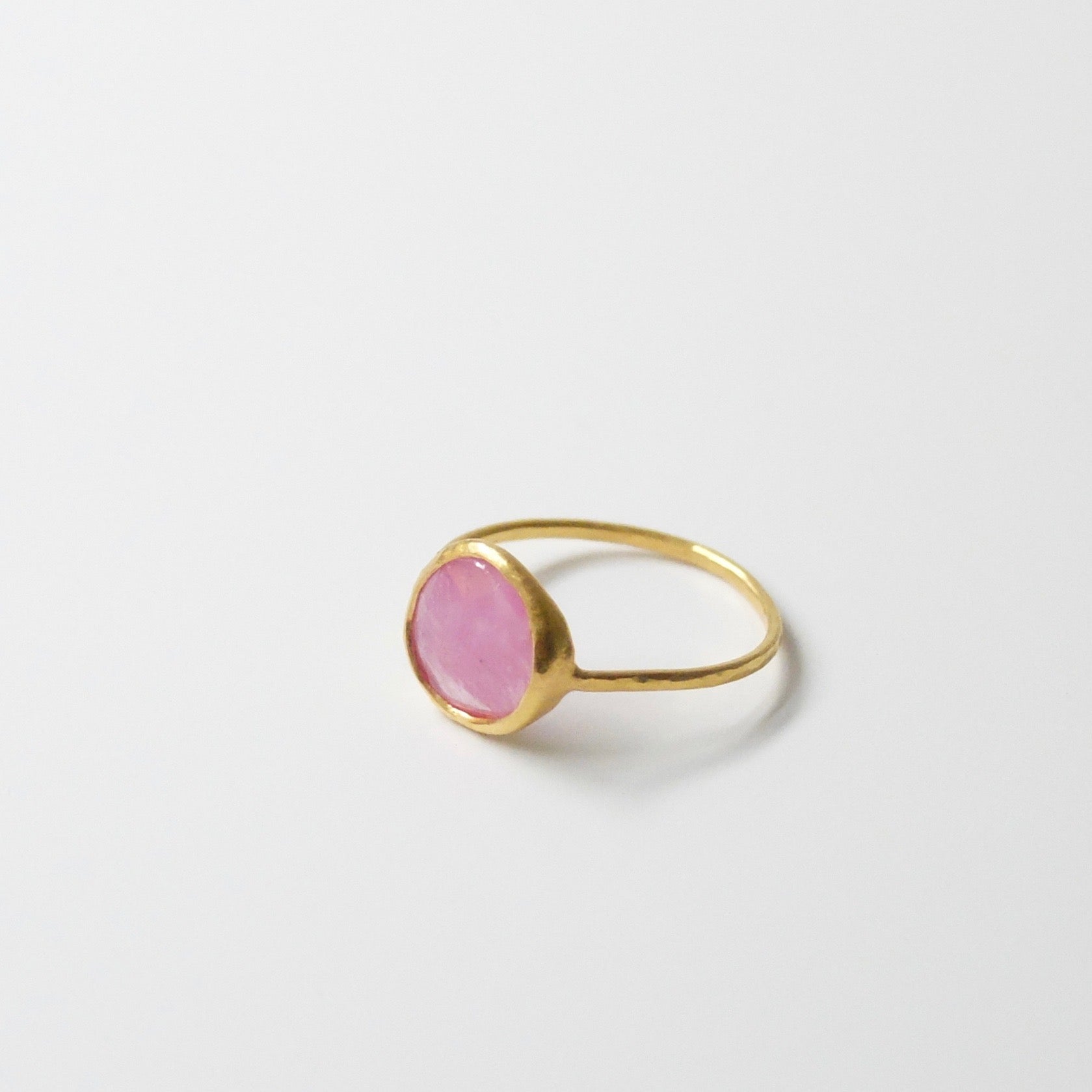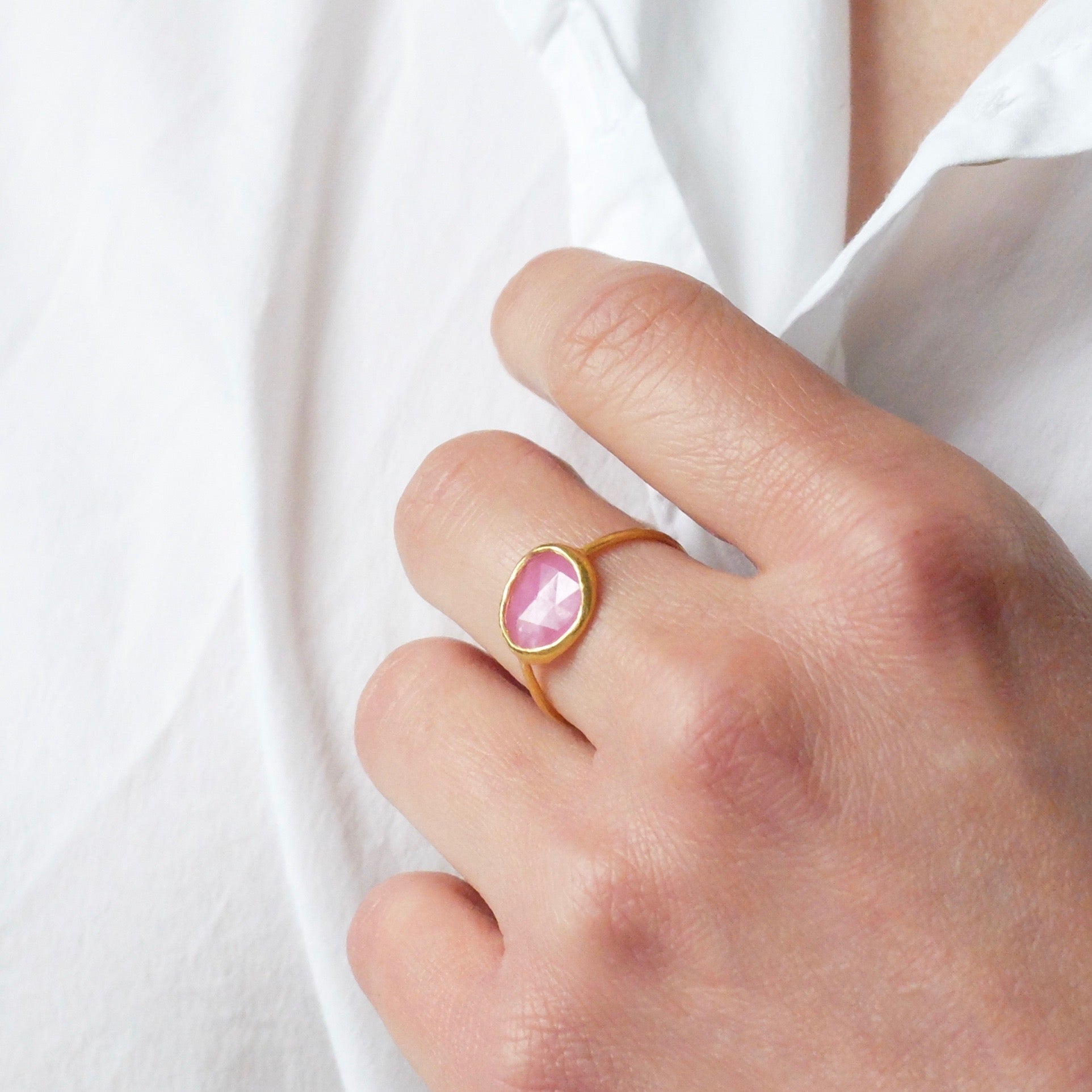 Exquisite pink sapphire set into a 22ct ring. Ram Rijal's hammered-gold creations are inspired by the precious stones he works with. His pieces are unique in their rough, organic yet refined, appearance which attests to their hand-made nature.