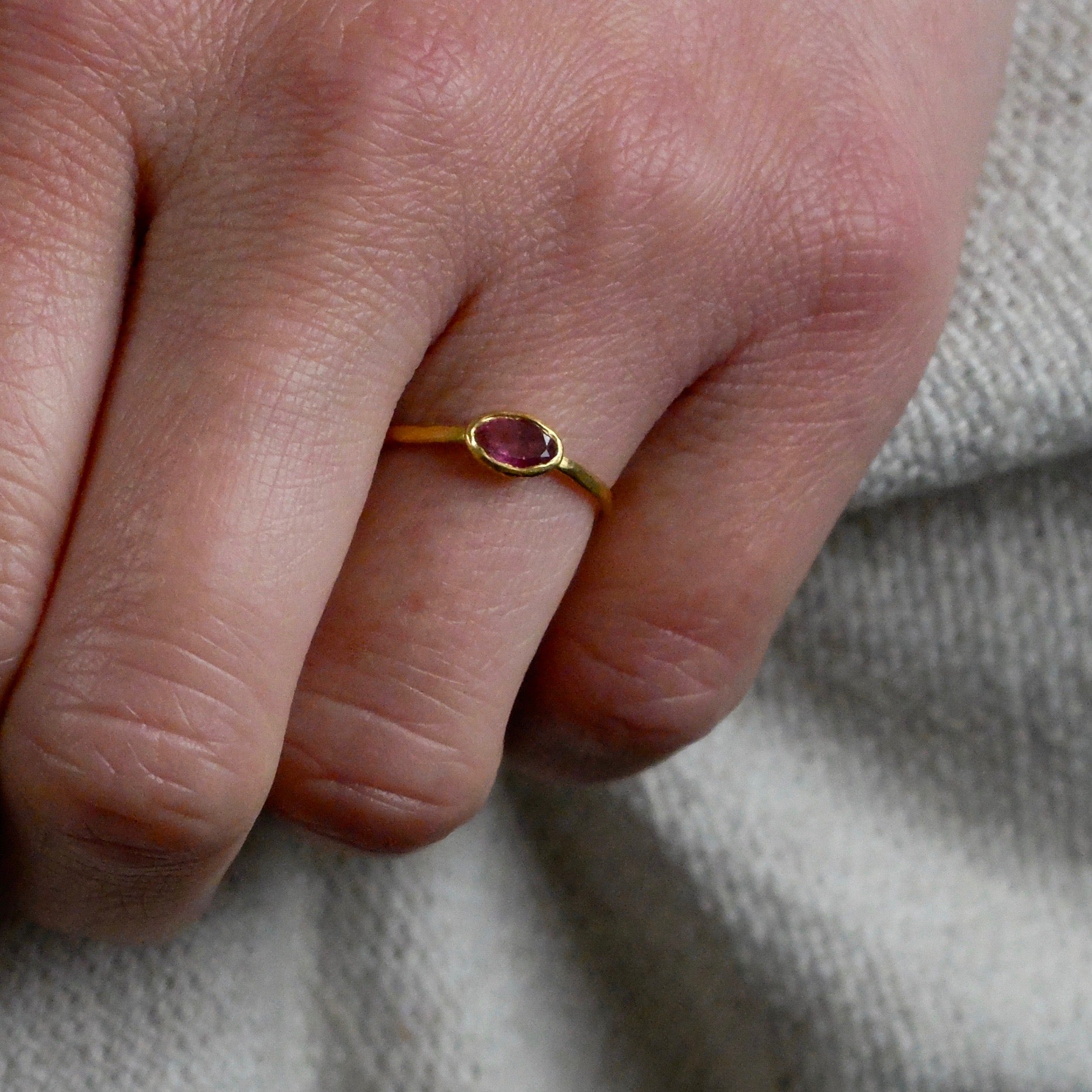 Exquisite Sapphire jewel set into a 22ct ring. Ram Rijal's hammered-gold creations are inspired by the precious stones he works with. His pieces are unique in their rough, organic yet refined, appearance which attests to their hand-made nature.