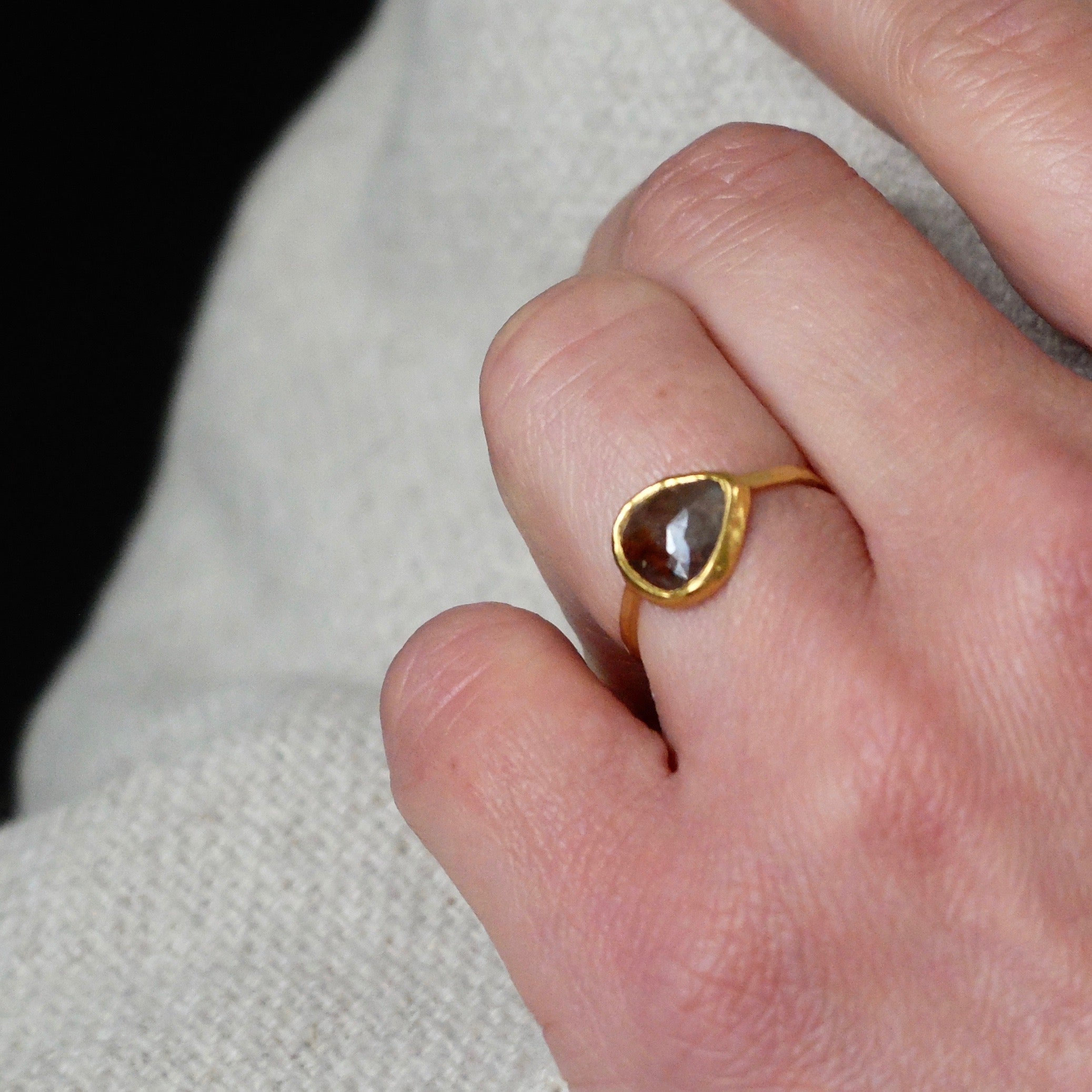 Exquisite Sapphire jewel set into a 22ct ring. Ram Rijal's hammered-gold creations are inspired by the precious stones he works with. His pieces are unique in their rough, organic yet refined, appearance which attests to their hand-made nature.