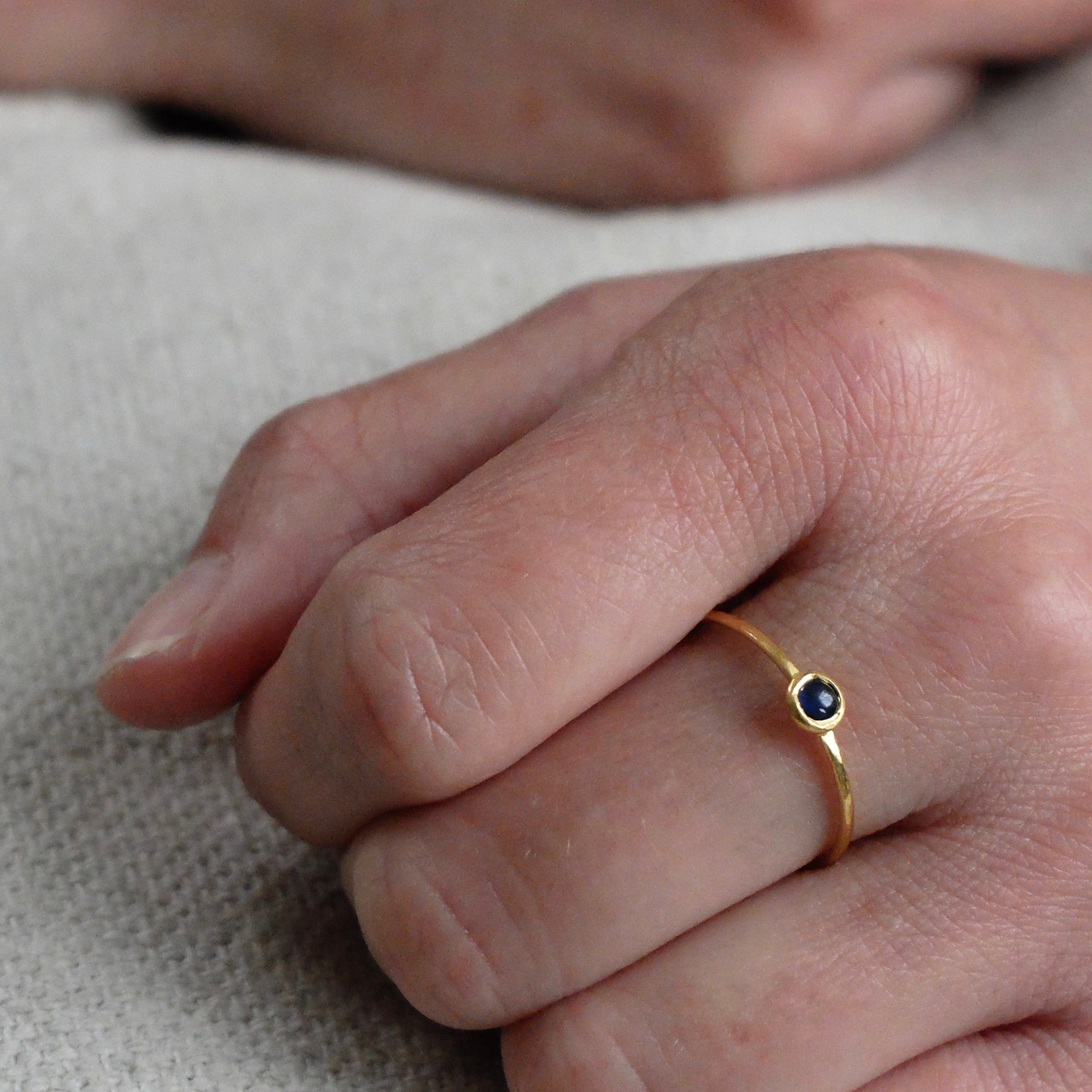 Exquisite Sapphire jewel set into a 22ct ring. Ram Rijal's hammered-gold creations are inspired by the precious stones he works with. His pieces are unique in their rough, organic yet refined, appearance which attests to their hand-made nature.