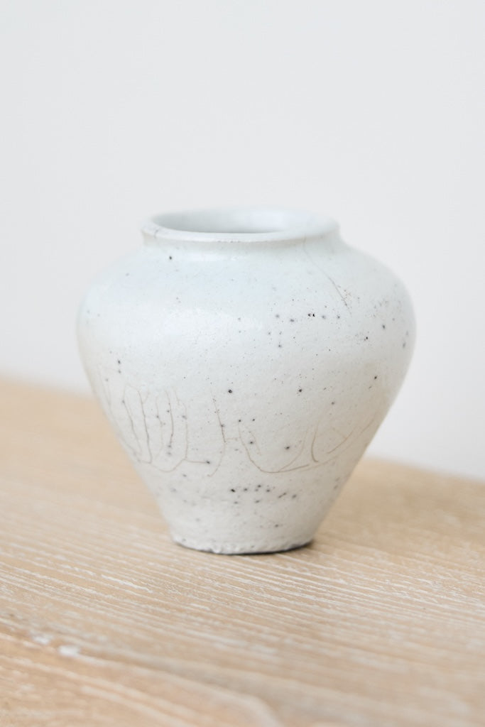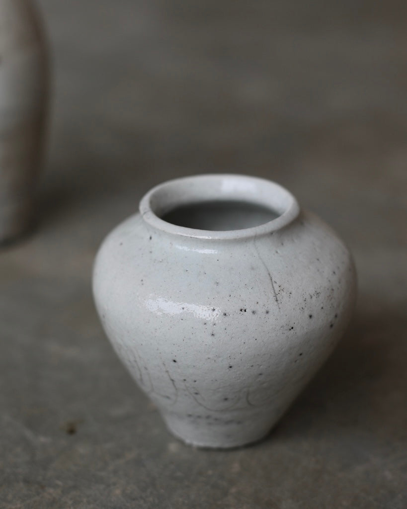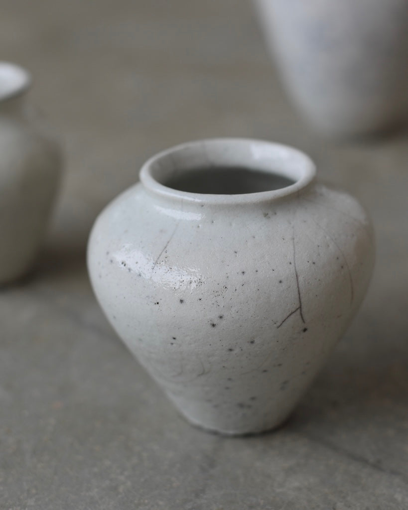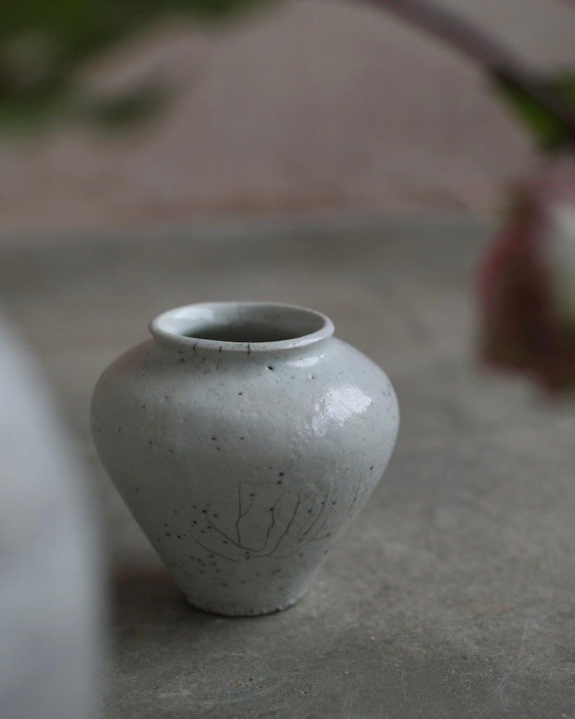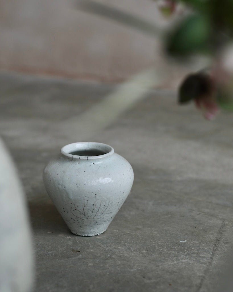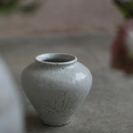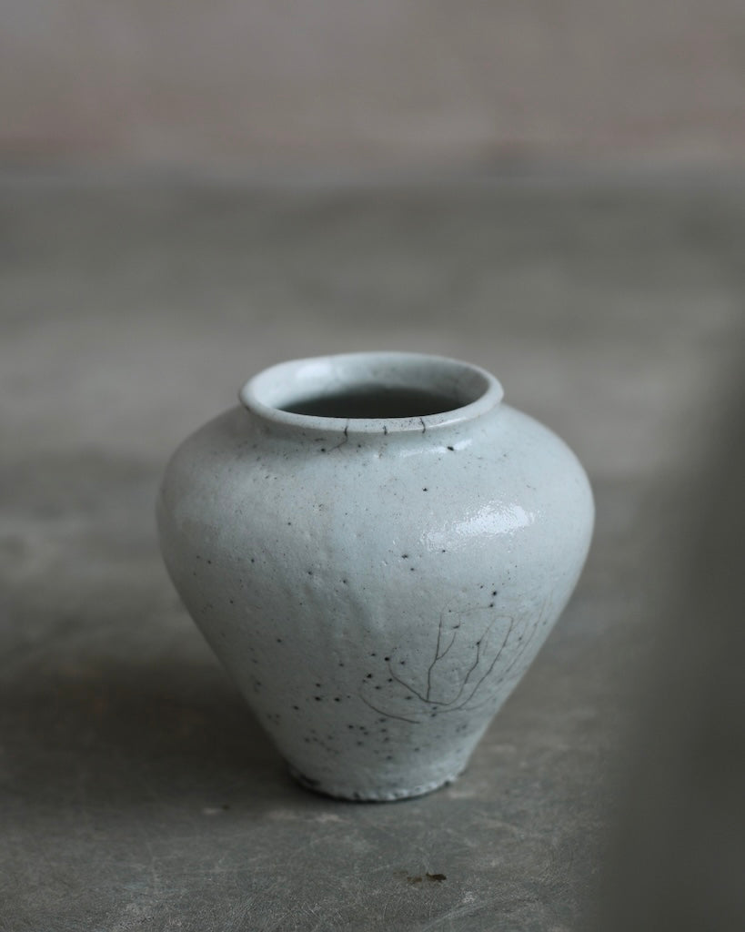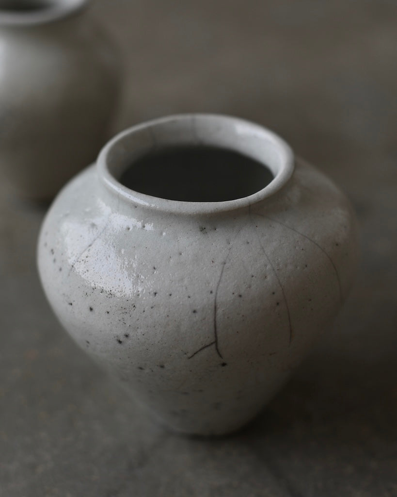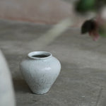 The softly rounded silhouette conveys balance and composure, while fine crackles within the glaze surface reveal the clay’s natural response to the intensity of firing. Rather than concealing these variations, they are embraced as part of the vessel’s story, suggesting resilience within fragility. A restrained palette and subtle tonal shifts enhance its calm presence, inviting closer observation and an appreciation of its refined details.