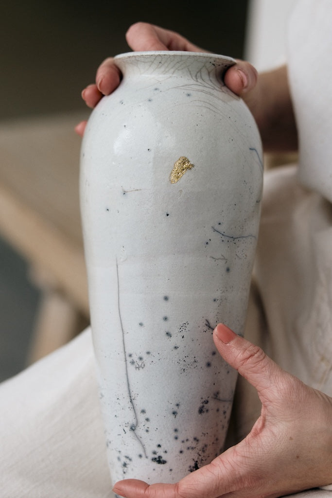This ceramic vessel was hand built and raku fired in Rhona’s studio in Cornwall. Embracing a considered and unhurried approach, Frances allows the form to develop gradually, guided by a meditative rhythm of coiling and shaping. The pace of this process informs both the structure and the quiet character of the piece, reflecting her affinity with the Wabi Sabi aesthetic philosophy.
