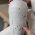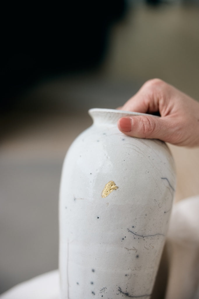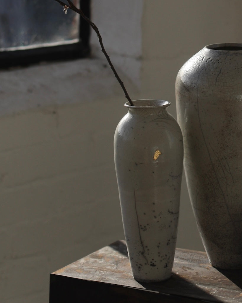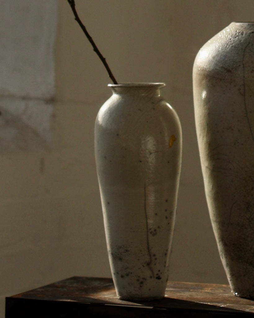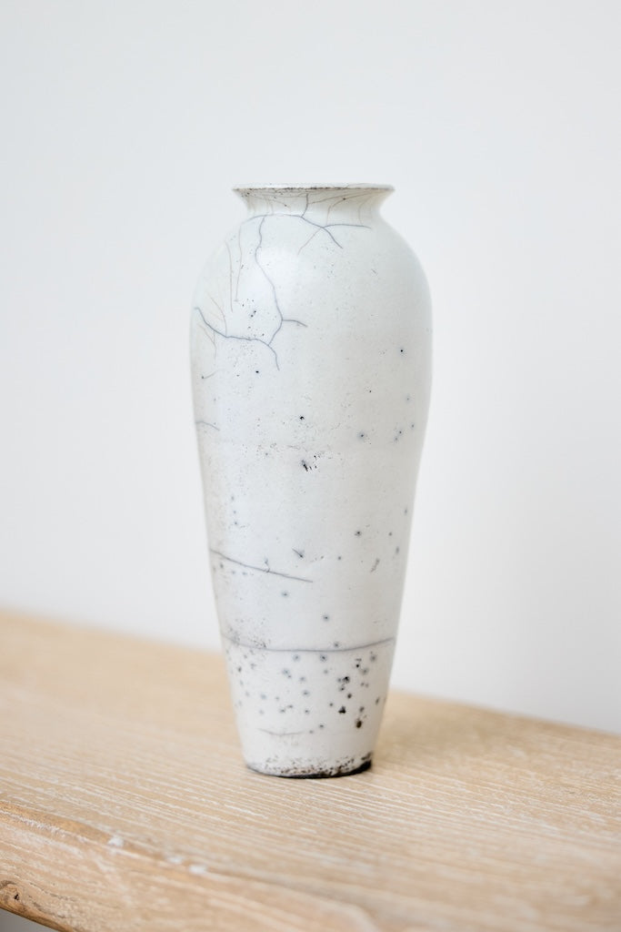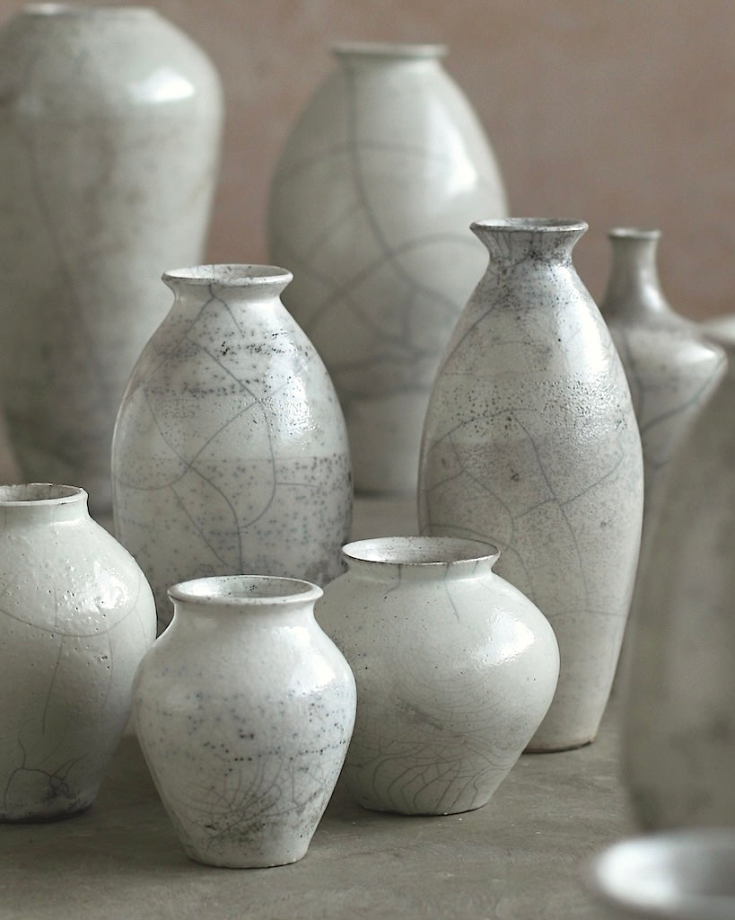 Rhona Frances is a ceramic artist based on the south coast of Cornwall, specialising in minimalist vessels with soft, feminine forms. Working with stoneware clay, Frances builds each piece slowly using the hand-building technique of coiling, allowing form to evolve through quiet repetition. Central to her practice, and in contrast to the calm, measured construction of her vessels, is the raku firing process; an inherently volatile and unpredictable method. The resulting crackle surfaces act as delicate records of fire, smoke, and transformation. The philosophy of non-attachment is fundamental to Frances’s work; some vessels are lost during firing, and this acceptance of fragility has become an integral part of her artistic outlook.