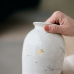 Materials - Stoneware with a white crackled glazed interior and exterior. With gold embellishment.