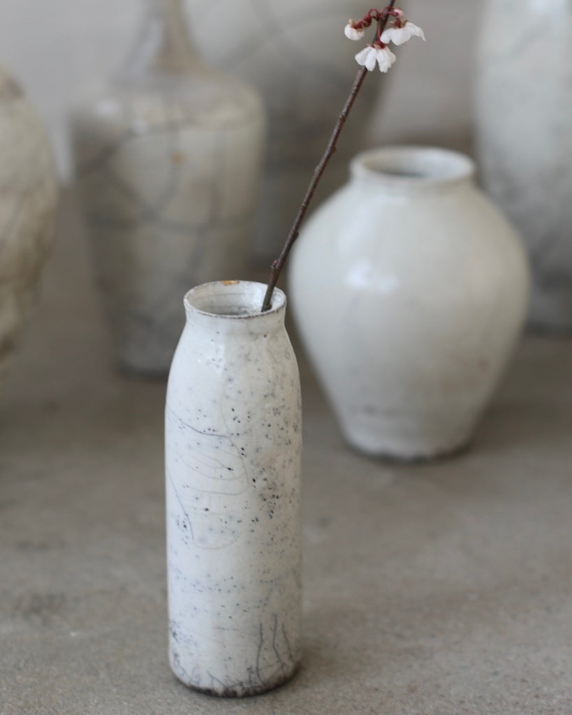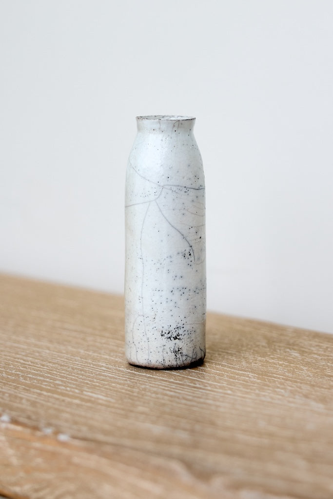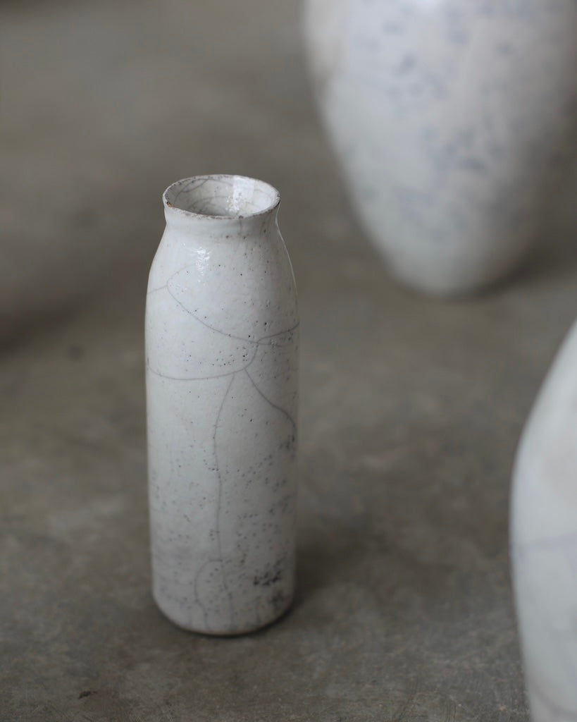 Rhona Frances is a ceramic artist based on the south coast of Cornwall, specialising in minimalist vessels with soft, feminine forms. Working with stoneware clay, Frances builds each piece slowly using the hand-building technique of coiling, allowing form to evolve through quiet repetition. Central to her practice, and in contrast to the calm, measured construction of her vessels, is the raku firing process; an inherently volatile and unpredictable method. The resulting crackle surfaces act as delicate records of fire, smoke, and transformation. The philosophy of non-attachment is fundamental to Frances’s work; some vessels are lost during firing, and this acceptance of fragility has become an integral part of her artistic outlook.