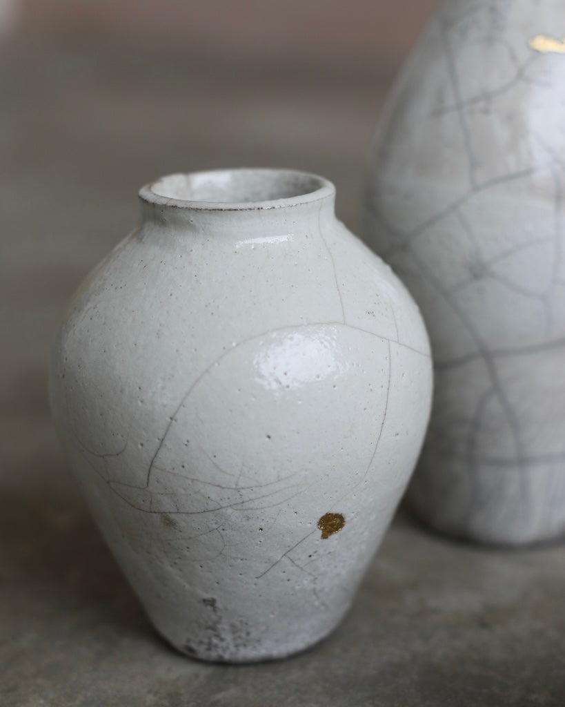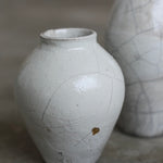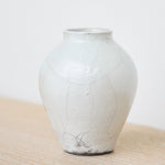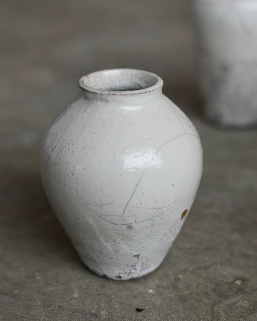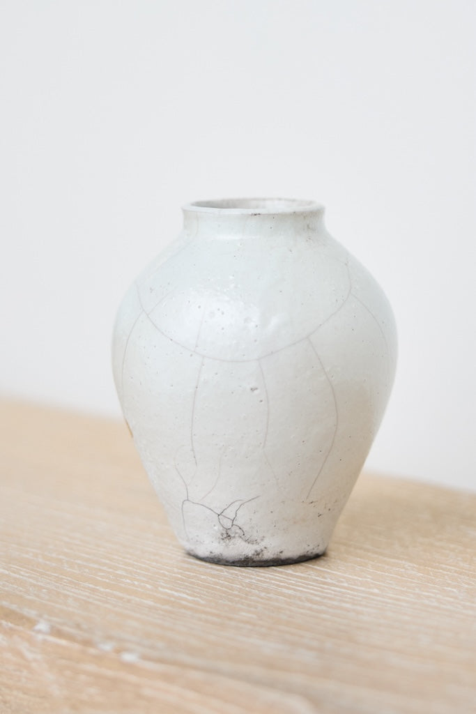 The softly rounded silhouette conveys balance and composure, while fine crackles within the glaze surface reveal the clay’s natural response to the intensity of firing. Rather than concealing these variations, they are embraced as part of the vessel’s story, suggesting resilience within fragility. A restrained palette and subtle tonal shifts enhance its calm presence, inviting closer observation and an appreciation of its refined details.
