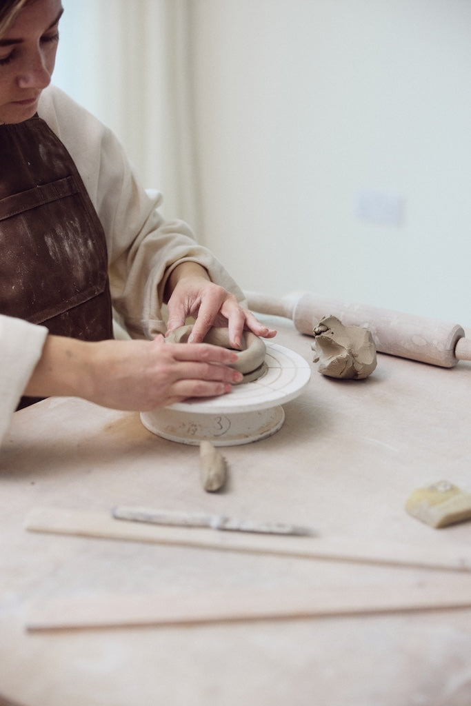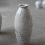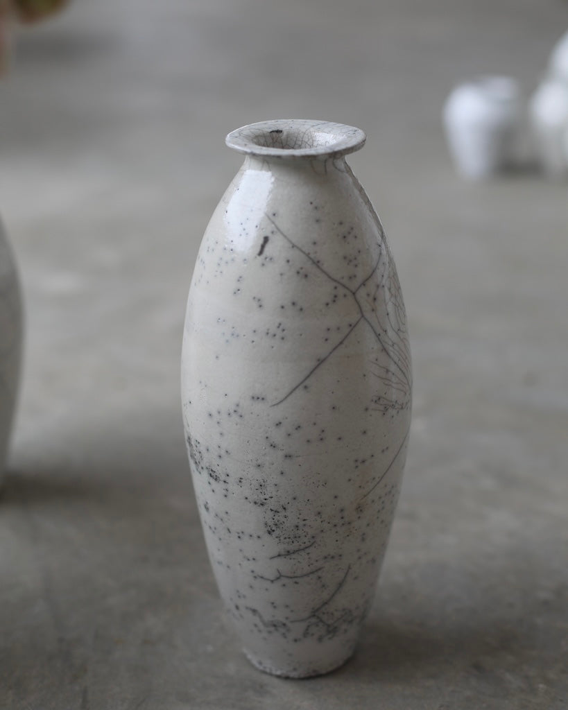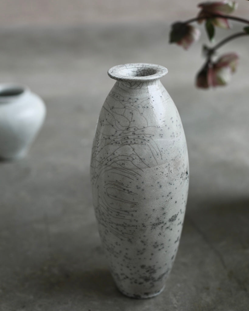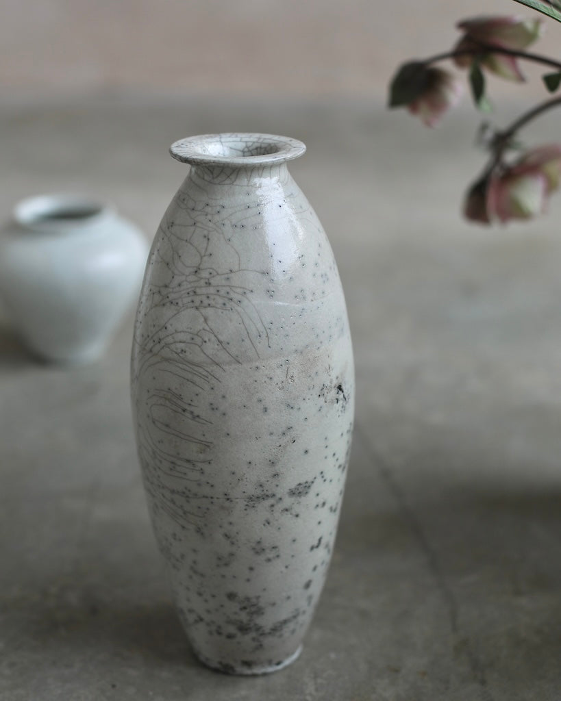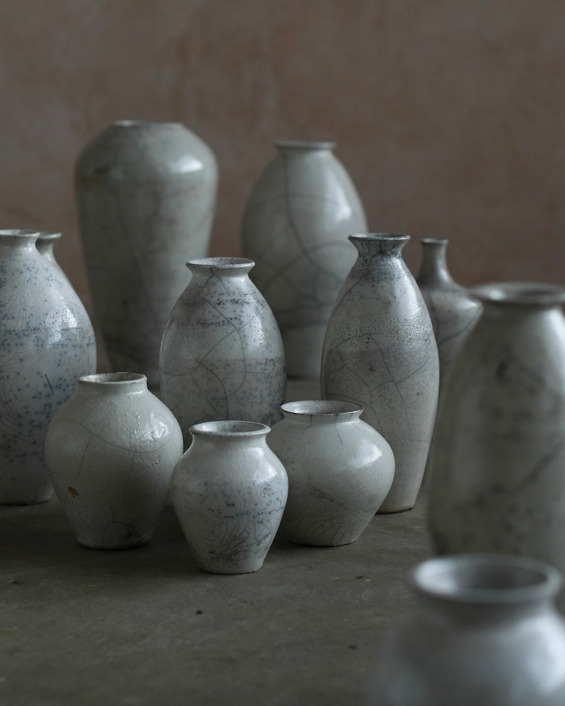 Rhona Frances is a ceramic artist based on the south coast of Cornwall, specialising in minimalist vessels with soft, feminine forms. Working with stoneware clay, Frances builds each piece slowly using the hand-building technique of coiling, allowing form to evolve through quiet repetition. Central to her practice, and in contrast to the calm, measured construction of her vessels, is the raku firing process; an inherently volatile and unpredictable method. The resulting crackle surfaces act as delicate records of fire, smoke, and transformation. The philosophy of non-attachment is fundamental to Frances’s work; some vessels are lost during firing, and this acceptance of fragility has become an integral part of her artistic outlook.