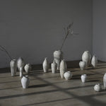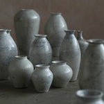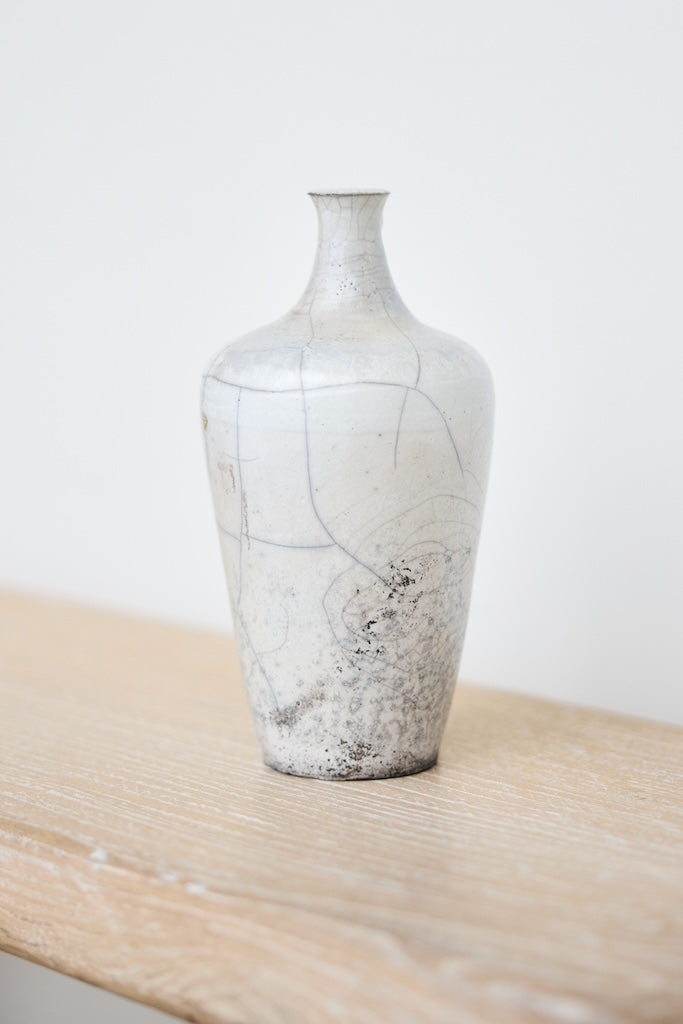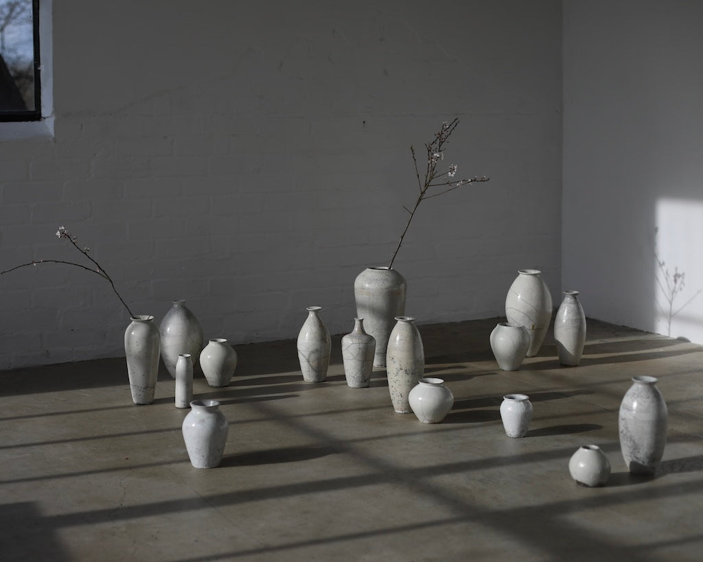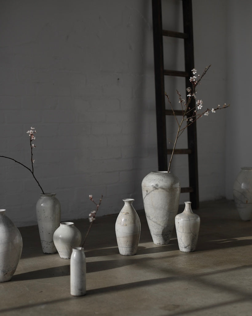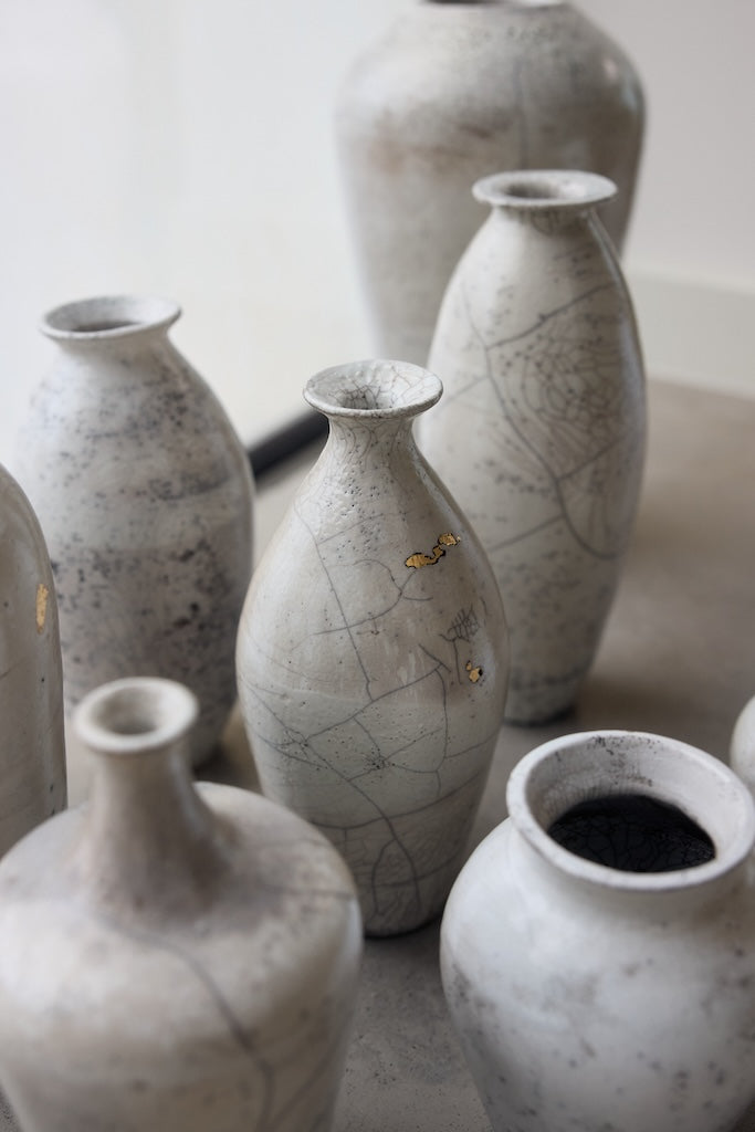 Rhona Frances is a ceramic artist based on the south coast of Cornwall, specialising in minimalist vessels with soft, feminine forms. Working with stoneware clay, Frances builds each piece slowly using the hand-building technique of coiling, allowing form to evolve through quiet repetition. Central to her practice, and in contrast to the calm, measured construction of her vessels, is the raku firing process; an inherently volatile and unpredictable method. The resulting crackle surfaces act as delicate records of fire, smoke, and transformation. The philosophy of non-attachment is fundamental to Frances’s work; some vessels are lost during firing, and this acceptance of fragility has become an integral part of her artistic outlook.