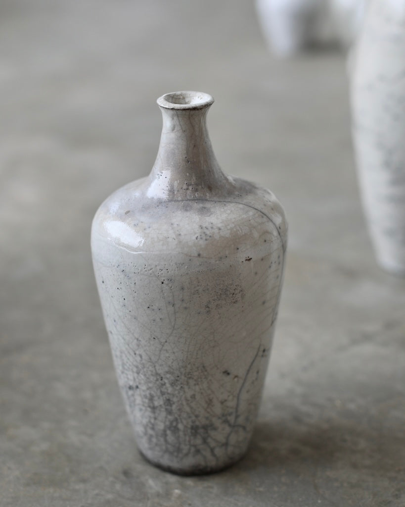 The softly rounded silhouette conveys balance and composure, while fine crackles within the glaze surface reveal the clay’s natural response to the intensity of firing. Rather than concealing these variations, they are embraced as part of the vessel’s story, suggesting resilience within fragility. A restrained palette and subtle tonal shifts enhance its calm presence, inviting closer observation and an appreciation of its refined details.