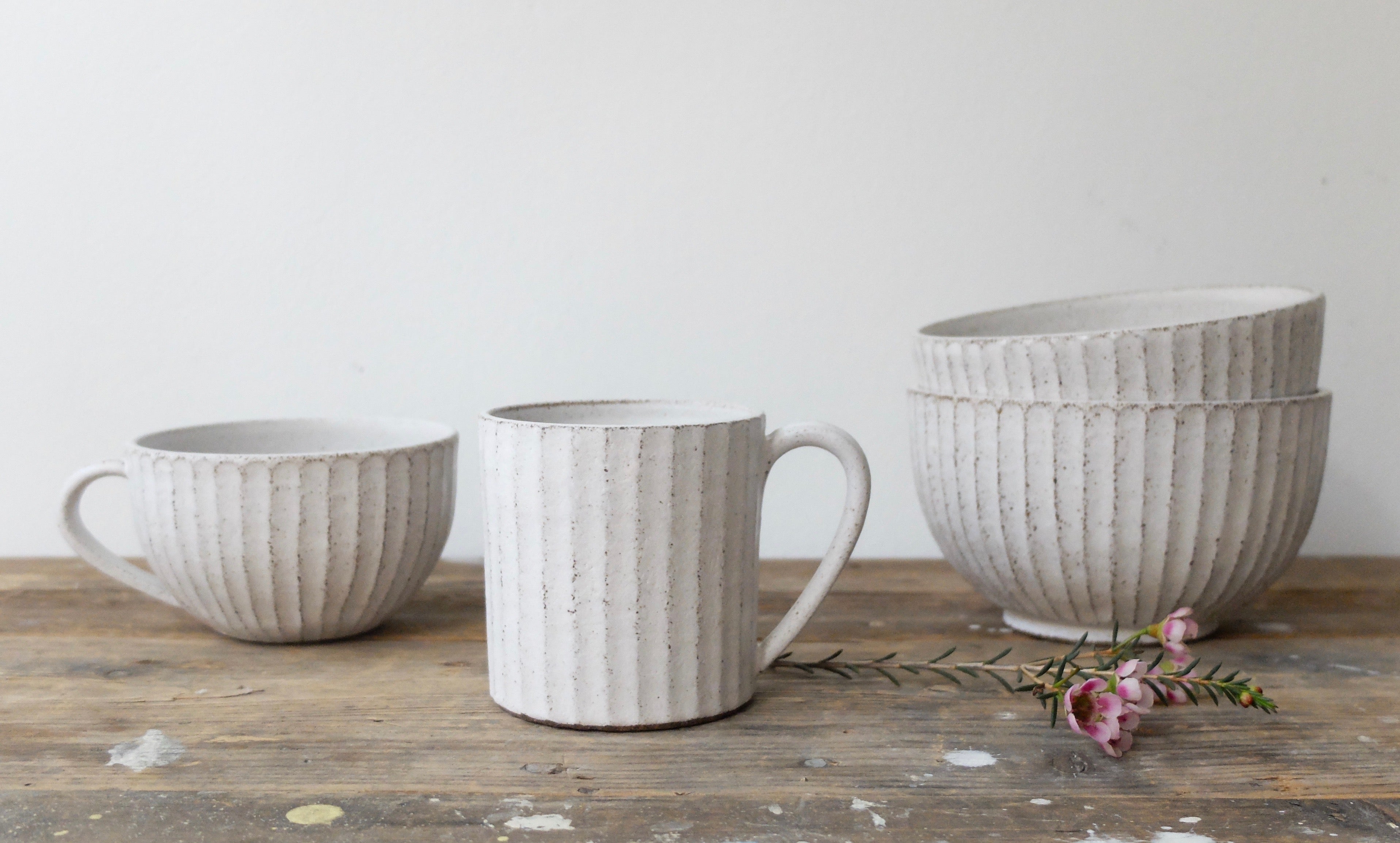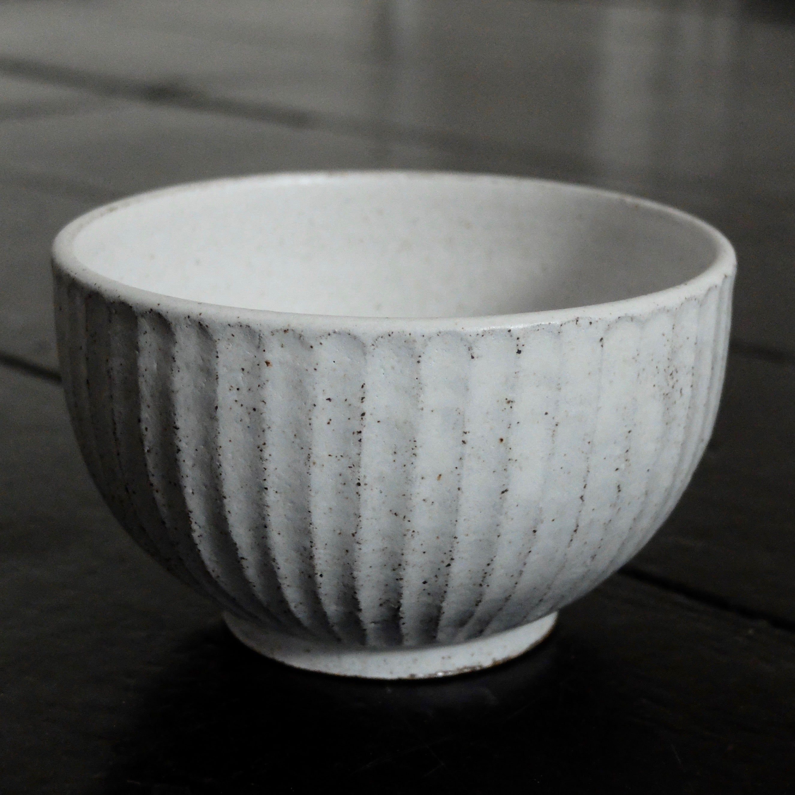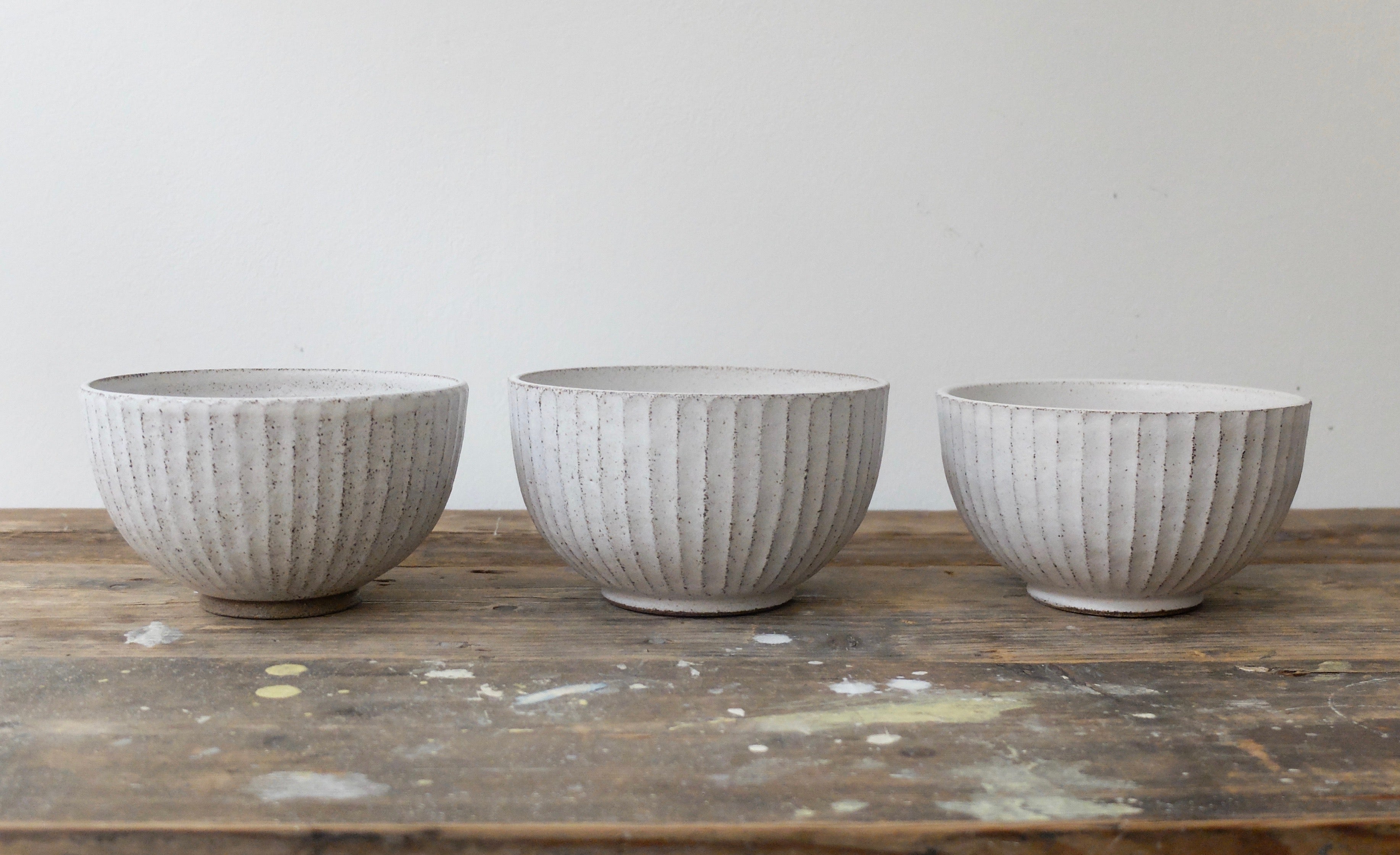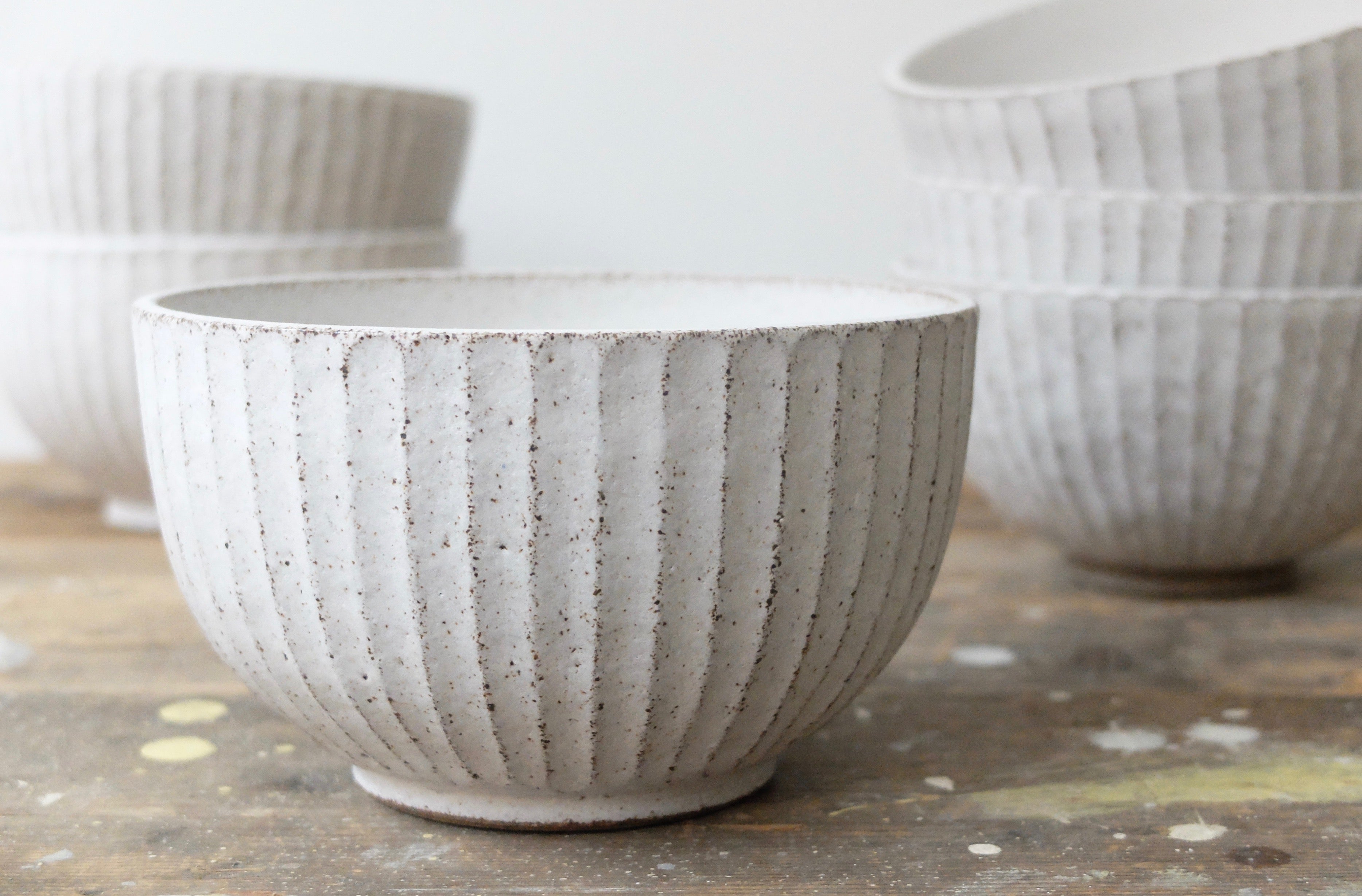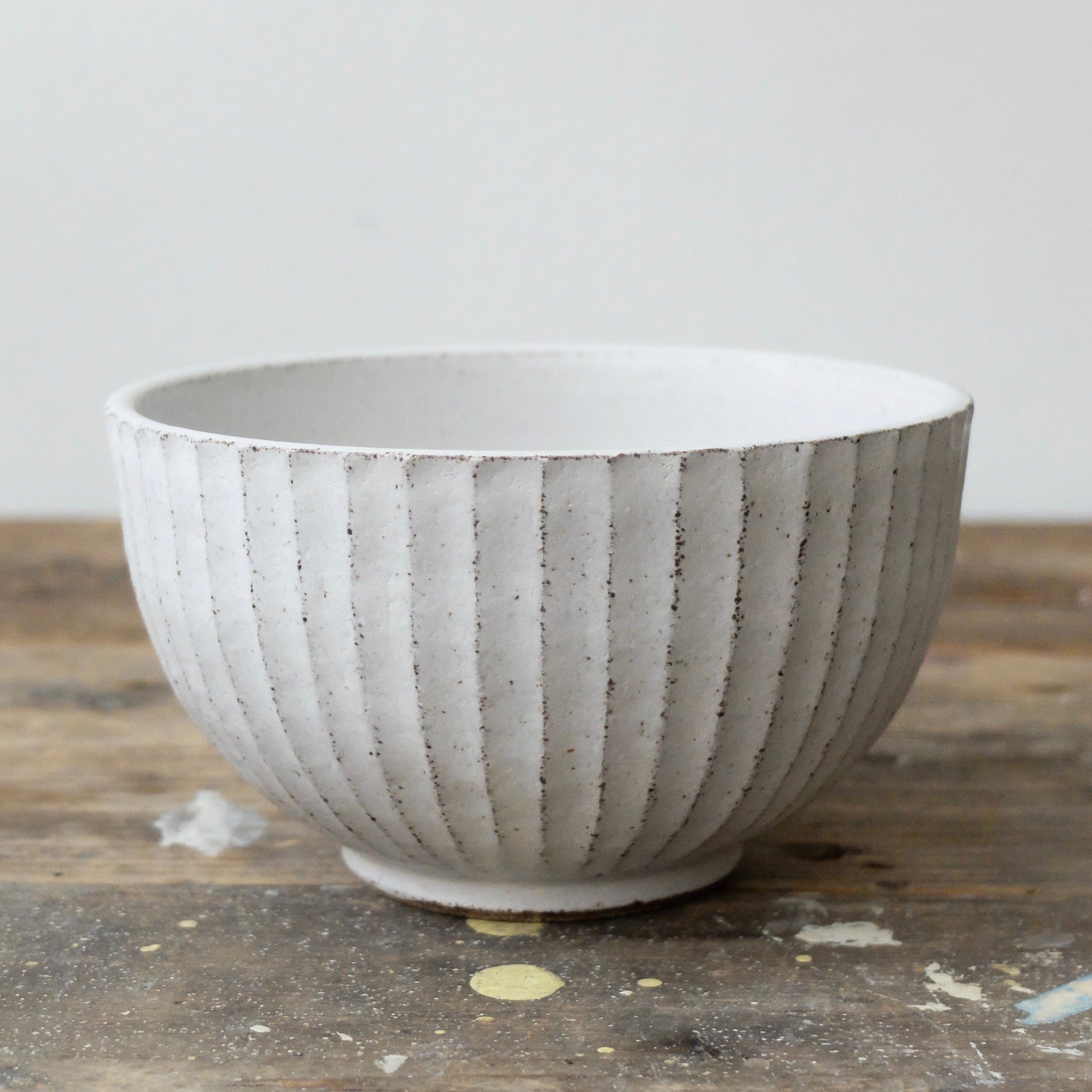This whitewashed carved bowl demonstrates perfectly how Robynn Storgaard's rejection of ornamentation emphasises the forms and materials of her ceramics. This bowl was thrown on the wheel and made using locally sourced Scandinavian clays, developed and refined in Robynn's studio. The bowl is very tactile, with interesting ridges that reveal the hand of the maker and display the artistic process. The smooth texture is due to its overall glazing with one of a number of glaze recipes that Robynn has acquired from mentors and friends and subsequently enhanced to suit her clay bodies and surface treatments.